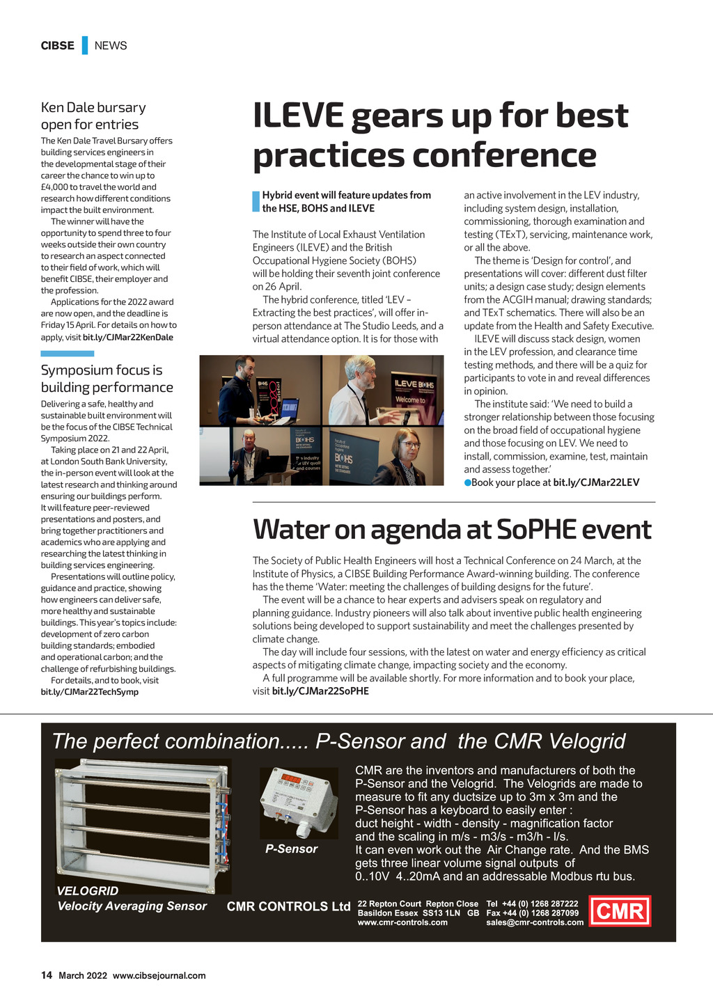 CIBSE | NEWS Ken Dale bursary open for entries The Ken Dale Travel Bursary offers building services engineers in the developmental stage of their career the chance to win up to 4,000 to travel the world and research how different conditions impact the built environment. The winner will have the opportunity to spend three to four weeks outside their own country to research an aspect connected to their field of work, which will benefit CIBSE, their employer and the profession. Applications for the 2022 award are now open, and the deadline is Friday 15 April. For details on how to apply, visit bit.ly/CJMar22KenDale Symposium focus is building performance Delivering a safe, healthy and sustainable built environment will be the focus of the CIBSE Technical Symposium 2022. Taking place on 21 and 22 April, at London South Bank University, the in-person event will look at the latest research and thinking around ensuring our buildings perform. It will feature peer-reviewed presentations and posters, and bring together practitioners and academics who are applying and researching the latest thinking in building services engineering. Presentations will outline policy, guidance and practice, showing how engineers can deliver safe, more healthy and sustainable buildings. This years topics include: development of zero carbon building standards; embodied and operational carbon; and the challenge of refurbishing buildings. For details, and to book, visit bit.ly/CJMar22TechSymp ILEVE gears up for best practices conference Hybrid event will feature updates from the HSE, BOHS and ILEVE The Institute of Local Exhaust Ventilation Engineers (ILEVE) and the British Occupational Hygiene Society (BOHS) will be holding their seventh joint conference on 26 April. The hybrid conference, titled LEV Extracting the best practices, will offer inperson attendance at The Studio Leeds, and a virtual attendance option. It is for those with an active involvement in the LEV industry, including system design, installation, commissioning, thorough examination and testing (TExT), servicing, maintenance work, or all the above. The theme is Design for control, and presentations will cover: different dust filter units; a design case study; design elements from the ACGIH manual; drawing standards; and TExT schematics. There will also be an update from the Health and Safety Executive. ILEVE will discuss stack design, women in the LEV profession, and clearance time testing methods, and there will be a quiz for participants to vote in and reveal differences in opinion. The institute said: We need to build a stronger relationship between those focusing on the broad field of occupational hygiene and those focusing on LEV. We need to install, commission, examine, test, maintain and assess together. Book your place at bit.ly/CJMar22LEV Water on agenda at SoPHE event The Society of Public Health Engineers will host a Technical Conference on 24 March, at the Institute of Physics, a CIBSE Building Performance Award-winning building. The conference has the theme Water: meeting the challenges of building designs for the future. The event will be a chance to hear experts and advisers speak on regulatory and planning guidance. Industry pioneers will also talk about inventive public health engineering solutions being developed to support sustainability and meet the challenges presented by climate change. The day will include four sessions, with the latest on water and energy efficiency as critical aspects of mitigating climate change, impacting society and the economy. A full programme will be available shortly. For more information and to book your place, visit bit.ly/CJMar22SoPHE 14 March 2022 www.cibsejournal.com CIBSE March 22 pp14-15 CIBSE News.indd 14 25/02/2022 15:08
