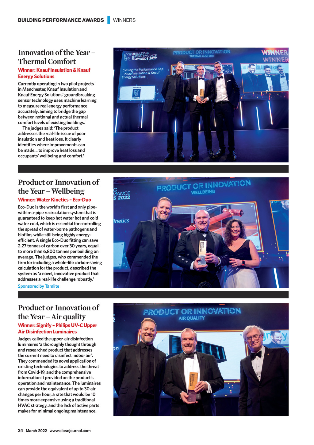 BUILDING PERFORMANCE AWARDS | WINNERS Innovation of the Year Thermal Comfort Winner: Knauf Insulation & Knauf Energy Solutions Currently operating in two pilot projects in Manchester, Knauf Insulation and Knauf Energy Solutions groundbreaking sensor technology uses machine learning to measure real energy performance accurately, aiming to bridge the gap between notional and actual thermal comfort levels of existing buildings. The judges said: The product addresses the real-life issue of poor insulation and heat loss. It clearly identifies where improvements can be made... to improve heat loss and occupants wellbeing and comfort. Product or Innovation of the Year Wellbeing Winner: Water Kinetics Eco-Duo Eco-Duo is the worlds first and only pipewithin-a-pipe recirculation system that is guaranteed to keep hot water hot and cold water cold, which is essential for controlling the spread of water-borne pathogens and biofilm, while still being highly energyefficient. A single Eco-Duo fitting can save 2.27 tonnes of carbon over 30 years, equal to more than 6,800 tonnes per building on average. The judges, who commended the firm for including a whole-life carbon-saving calculation for the product, described the system as a novel, innovative product that addresses a real-life challenge robustly. Sponsored by Tamlite Product or Innovation of the Year Air quality Winner: Signify Philips UV-C Upper Air Disinfection Luminaires Judges called the upper-air disinfection luminaires a thoroughly thought through and researched product that addresses the current need to disinfect indoor air. They commended its novel application of existing technologies to address the threat from Covid-19, and the comprehensive information it provided on the products operation and maintenance. The luminaires can provide the equivalent of up to 30 air changes per hour, a rate that would be 10 times more expensive using a traditional HVAC strategy, and the lack of active parts makes for minimal ongoing maintenance. 24 March 2022 www.cibsejournal.com CIBSE March 22 pp20-25 BPA Awards.indd 24 25/02/2022 16:56