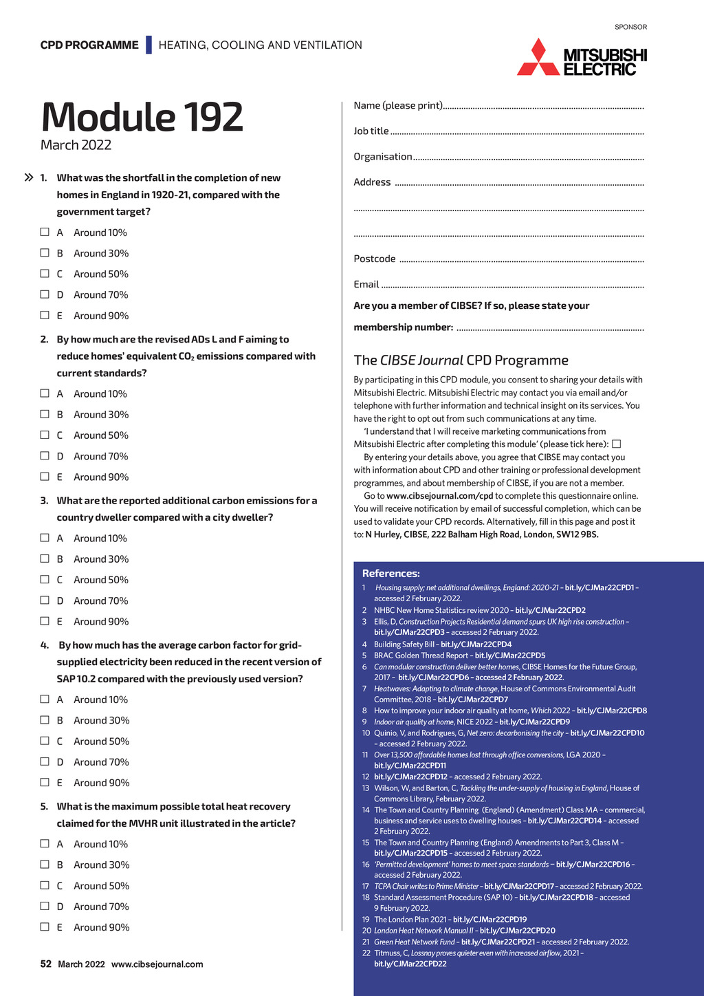 SPONSOR CPD PROGRAMME | HEATING, COOLING AND VENTILATION Module 192 March 2022 1. What was the shortfall in the completion of new homes in England in 1920-21, compared with the Name (please print)........................................................................................ Job title ............................................................................................................... Organisation ..................................................................................................... Address ............................................................................................................. government target? ............................................................................................................................... A Around 10% ............................................................................................................................... B Around 30% Postcode ........................................................................................................... C Around 50% D Around 70% E Around 90% 2. By how much are the revised ADs L and F aiming to reduce homes equivalent CO2 emissions compared with current standards? A Around 10% B Around 30% C Around 50% D Around 70% E Around 90% 3. What are the reported additional carbon emissions for a country dweller compared with a city dweller? A Around 10% B Around 30% C Around 50% D Around 70% E Around 90% 4. By how much has the average carbon factor for gridsupplied electricity been reduced in the recent version of SAP 10.2 compared with the previously used version? A Around 10% B Around 30% C Around 50% D Around 70% E Around 90% 5. What is the maximum possible total heat recovery Email ................................................................................................................... Are you a member of CIBSE? If so, please state your membership number: .................................................................................. The CIBSE Journal CPD Programme By participating in this CPD module, you consent to sharing your details with Mitsubishi Electric. Mitsubishi Electric may contact you via email and/or telephone with further information and technical insight on its services. You have the right to opt out from such communications at any time. I understand that I will receive marketing communications from Mitsubishi Electric after completing this module (please tick here): By entering your details above, you agree that CIBSE may contact you with information about CPD and other training or professional development programmes, and about membership of CIBSE, if you are not a member. Go to www.cibsejournal.com/cpd to complete this questionnaire online. You will receive notification by email of successful completion, which can be used to validate your CPD records. Alternatively, fill in this page and post it to: N Hurley, CIBSE, 222 Balham High Road, London, SW12 9BS. References: 1 2 3 4 5 6 7 8 9 10 11 12 13 14 claimed for the MVHR unit illustrated in the article? A Around 10% 15 B Around 30% 16 C Around 50% D Around 70% 17 18 E Around 90% 52 March 2022 www.cibsejournal.com CIBSE March 22 pp49-52 CPD 192.indd 52 19 20 21 22 Housing supply; net additional dwellings, England: 2020-21 bit.ly/CJMar22CPD1 accessed 2 February 2022. NHBC New Home Statistics review 2020 bit.ly/CJMar22CPD2 Ellis, D, Construction Projects Residential demand spurs UK high rise construction bit.ly/CJMar22CPD3 accessed 2 February 2022. Building Safety Bill bit.ly/CJMar22CPD4 BRAC Golden Thread Report bit.ly/CJMar22CPD5 Can modular construction deliver better homes, CIBSE Homes for the Future Group, 2017 bit.ly/CJMar22CPD6 accessed 2 February 2022. Heatwaves: Adapting to climate change, House of Commons Environmental Audit Committee, 2018 bit.ly/CJMar22CPD7 How to improve your indoor air quality at home, Which 2022 bit.ly/CJMar22CPD8 Indoor air quality at home, NICE 2022 bit.ly/CJMar22CPD9 Quinio, V, and Rodrigues, G, Net zero: decarbonising the city bit.ly/CJMar22CPD10 accessed 2 February 2022. Over 13,500 affordable homes lost through office conversions, LGA 2020 bit.ly/CJMar22CPD11 bit.ly/CJMar22CPD12 accessed 2 February 2022. Wilson, W, and Barton, C, Tackling the under-supply of housing in England, House of Commons Library, February 2022. The Town and Country Planning (England) (Amendment) Class MA commercial, business and service uses to dwelling houses bit.ly/CJMar22CPD14 accessed 2 February 2022. The Town and Country Planning (England) Amendments to Part 3, Class M bit.ly/CJMar22CPD15 accessed 2 February 2022. Permitted development homes to meet space standards bit.ly/CJMar22CPD16 accessed 2 February 2022. TCPA Chair writes to Prime Minister bit.ly/CJMar22CPD17 accessed 2 February 2022. Standard Assessment Procedure (SAP 10) bit.ly/CJMar22CPD18 accessed 9 February 2022. The London Plan 2021 bit.ly/CJMar22CPD19 London Heat Network Manual II bit.ly/CJMar22CPD20 Green Heat Network Fund bit.ly/CJMar22CPD21 accessed 2 February 2022. Titmuss, C, Lossnay proves quieter even with increased airflow, 2021 bit.ly/CJMar22CPD22 25/02/2022 16:59