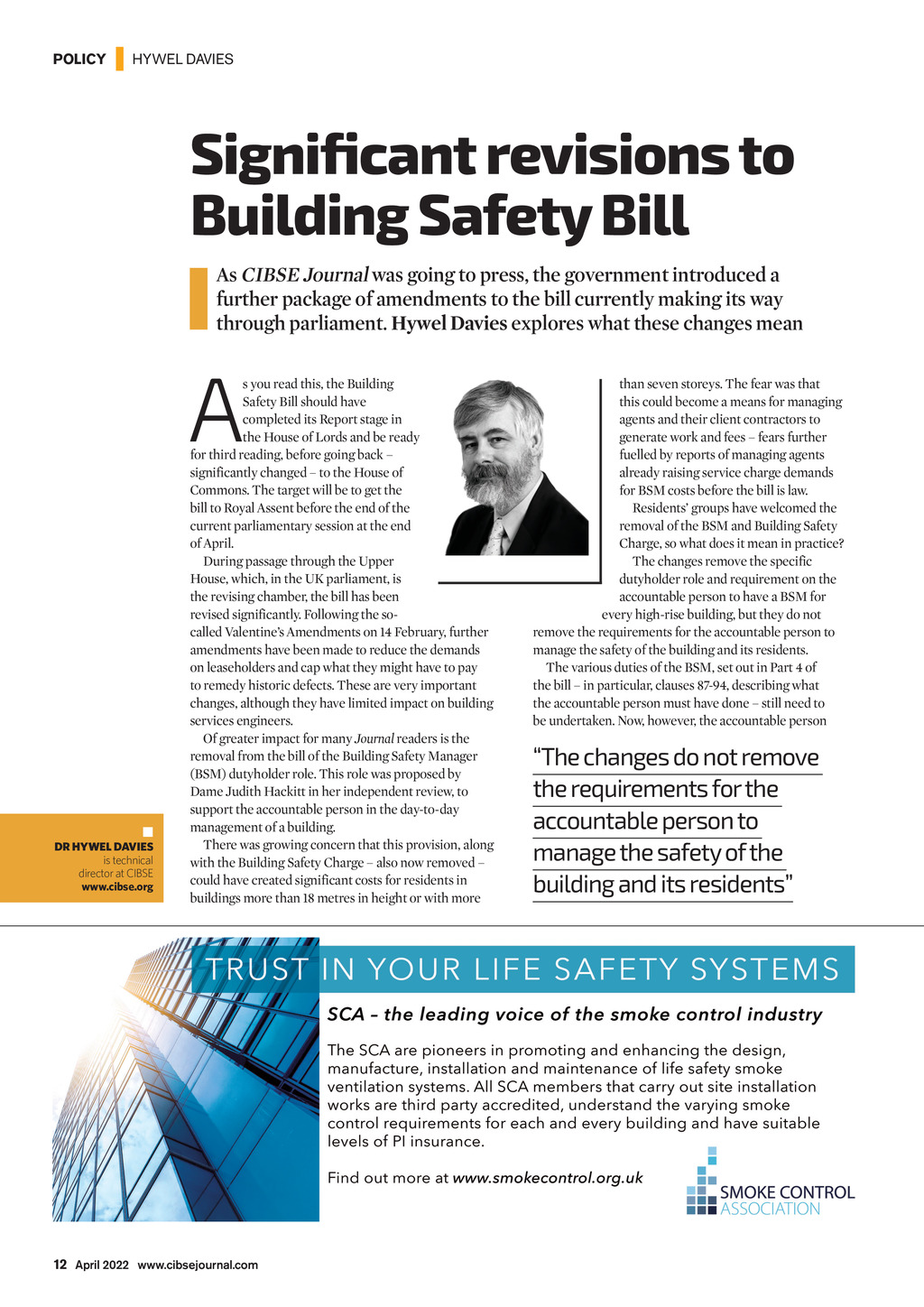 POLICY | HYWEL DAVIES Significant revisions to Building Safety Bill As CIBSE Journal was going to press, the government introduced a further package of amendments to the bill currently making its way through parliament. Hywel Davies explores what these changes mean A DR HYWEL DAVIES is technical director at CIBSE www.cibse.org s you read this, the Building Safety Bill should have completed its Report stage in the House of Lords and be ready for third reading, before going back significantly changed to the House of Commons. The target will be to get the bill to Royal Assent before the end of the current parliamentary session at the end of April. During passage through the Upper House, which, in the UK parliament, is the revising chamber, the bill has been revised significantly. Following the socalled Valentines Amendments on 14 February, further amendments have been made to reduce the demands on leaseholders and cap what they might have to pay to remedy historic defects. These are very important changes, although they have limited impact on building services engineers. Of greater impact for many Journal readers is the removal from the bill of the Building Safety Manager (BSM) dutyholder role. This role was proposed by Dame Judith Hackitt in her independent review, to support the accountable person in the day-to-day management of a building. There was growing concern that this provision, along with the Building Safety Charge also now removed could have created significant costs for residents in buildings more than 18 metres in height or with more than seven storeys. The fear was that this could become a means for managing agents and their client contractors to generate work and fees fears further fuelled by reports of managing agents already raising service charge demands for BSM costs before the bill is law. Residents groups have welcomed the removal of the BSM and Building Safety Charge, so what does it mean in practice? The changes remove the specific dutyholder role and requirement on the accountable person to have a BSM for every high-rise building, but they do not remove the requirements for the accountable person to manage the safety of the building and its residents. The various duties of the BSM, set out in Part 4 of the bill in particular, clauses 87-94, describing what the accountable person must have done still need to be undertaken. Now, however, the accountable person The changes do not remove the requirements for the accountable person to manage the safety of the building and its residents 12 April 2022 www.cibsejournal.com CIBSE Apr 22 pp12-13 Hywel.indd 12 25/03/2022 17:32