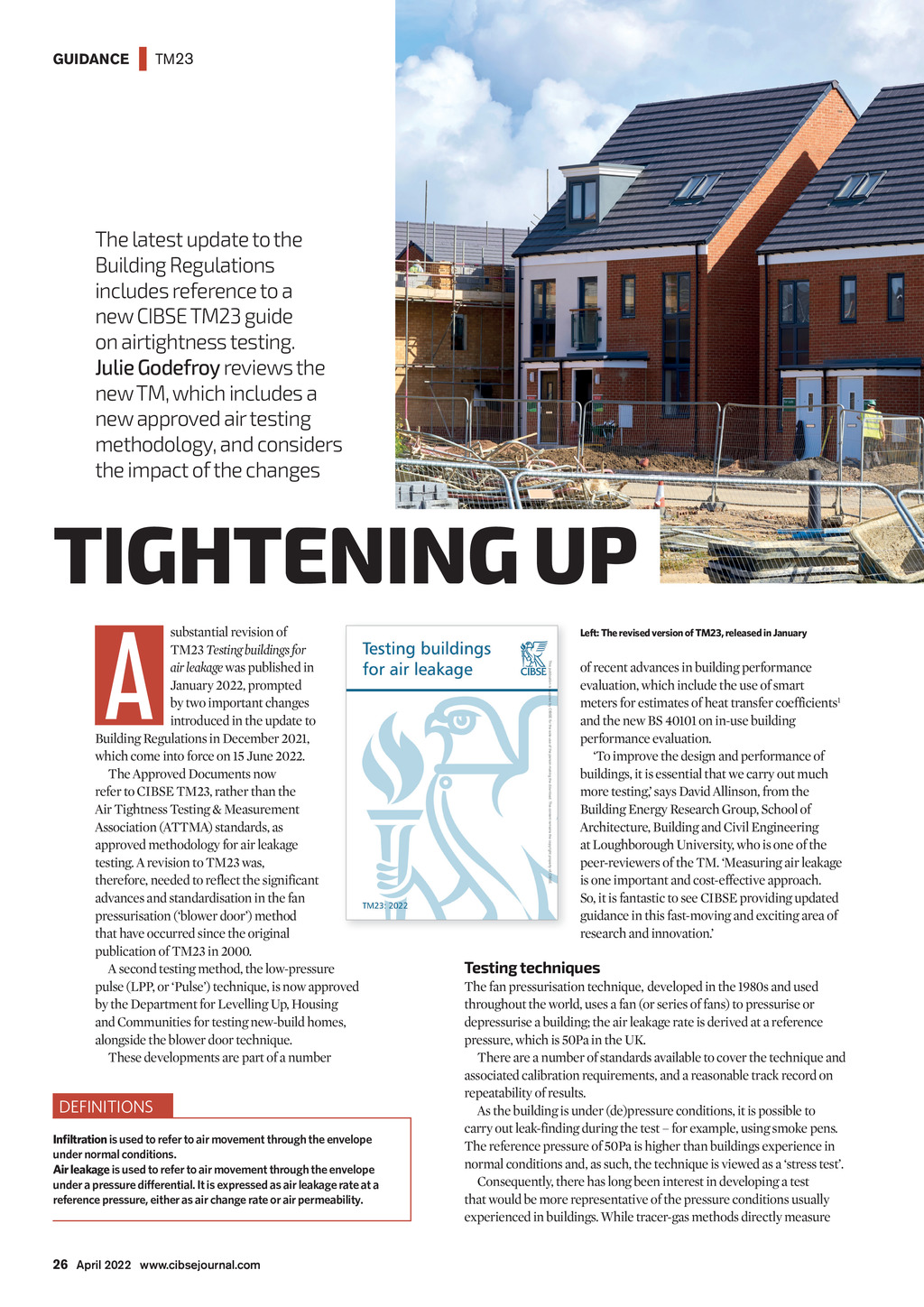 GUIDANCE | TM23 The latest update to the Building Regulations includes reference to a new CIBSE TM23 guide on airtightness testing. Julie Godefroy reviews the new TM, which includes a new approved air testing methodology, and considers the impact of the changes TIGHTENING UP A substantial revision of TM23 Testing buildings for air leakage was published in January 2022, prompted by two important changes introduced in the update to Building Regulations in December 2021, which come into force on 15 June 2022. The Approved Documents now refer to CIBSE TM23, rather than the Air Tightness Testing & Measurement Association (ATTMA) standards, as approved methodology for air leakage testing. A revision to TM23 was, therefore, needed to reflect the significant advances and standardisation in the fan pressurisation (blower door) method that have occurred since the original publication of TM23 in 2000. A second testing method, the low-pressure pulse (LPP, or Pulse) technique, is now approved by the Department for Levelling Up, Housing and Communities for testing new-build homes, alongside the blower door technique. These developments are part of a number DEFINITIONS Inltration is used to refer to air movement through the envelope under normal conditions. Air leakage is used to refer to air movement through the envelope under a pressure differential. It is expressed as air leakage rate at a reference pressure, either as air change rate or air permeability. Left: The revised version of TM23, released in January of recent advances in building performance evaluation, which include the use of smart meters for estimates of heat transfer coefficients1 and the new BS 40101 on in-use building performance evaluation. To improve the design and performance of buildings, it is essential that we carry out much more testing, says David Allinson, from the Building Energy Research Group, School of Architecture, Building and Civil Engineering at Loughborough University, who is one of the peer-reviewers of the TM. Measuring air leakage is one important and cost-effective approach. So, it is fantastic to see CIBSE providing updated guidance in this fast-moving and exciting area of research and innovation. Testing techniques The fan pressurisation technique, developed in the 1980s and used throughout the world, uses a fan (or series of fans) to pressurise or depressurise a building; the air leakage rate is derived at a reference pressure, which is 50Pa in the UK. There are a number of standards available to cover the technique and associated calibration requirements, and a reasonable track record on repeatability of results. As the building is under (de)pressure conditions, it is possible to carry out leak-finding during the test for example, using smoke pens. The reference pressure of 50Pa is higher than buildings experience in normal conditions and, as such, the technique is viewed as a stress test. Consequently, there has long been interest in developing a test that would be more representative of the pressure conditions usually experienced in buildings. While tracer-gas methods directly measure 26 April 2022 www.cibsejournal.com CIBSE Apr 22 pp26-28 TM23.indd 26 25/03/2022 17:35