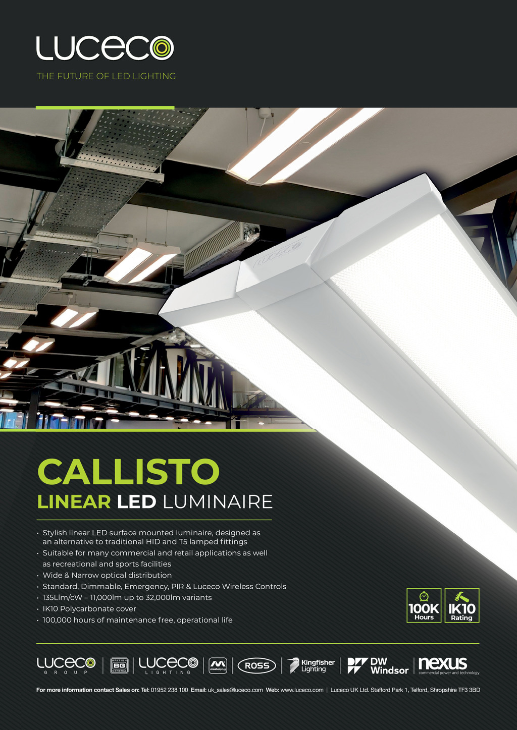 THE FUTURE OF LED LIGHTING CALLISTO LINEAR LED LUMINAIRE Stylish linear LED surface mounted luminaire, designed as an alternative to traditional HID and T5 lamped ttings Suitable for many commercial and retail applications as well as recreational and sports facilities Wide & Narrow optical distribution Standard, Dimmable, Emergency, PIR & Luceco Wireless Controls 135Llm/cW 11,000lm up to 32,000lm variants IK10 Polycarbonate cover 100,000 hours of maintenance free, operational life 100K IK10 Hours Rating For more information contact Sales on: Tel: 01952 238 100 Email: uk_sales@luceco.com Web: www.luceco.com | Luceco UK Ltd. Stafford Park 1, Telford, Shropshire TF3 3BD 30 April 2022 www.cibsejournal.com p30.CIBSEMagApr22.indd 30 21/03/2022 15:18