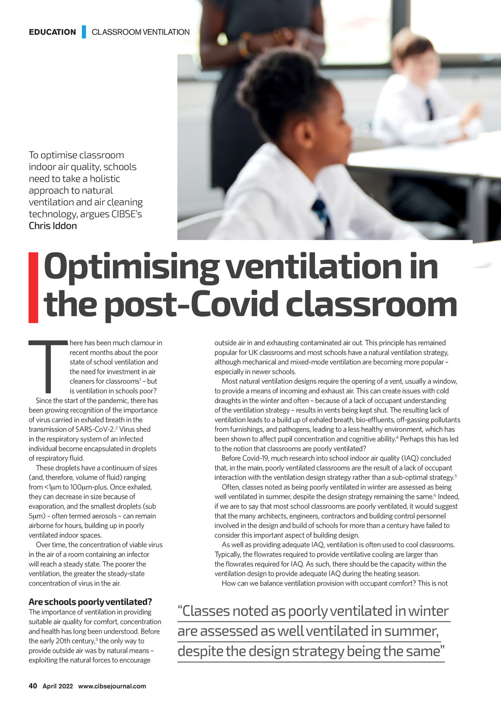 EDUCATION | CLASSROOM VENTILATION To optimise classroom indoor air quality, schools need to take a holistic approach to natural ventilation and air cleaning technology, argues CIBSEs Chris Iddon Optimising ventilation in the post-Covid classroom T here has been much clamour in recent months about the poor state of school ventilation and the need for investment in air cleaners for classrooms1 but is ventilation in schools poor? Since the start of the pandemic, there has been growing recognition of the importance of virus carried in exhaled breath in the transmission of SARS-CoV-2.2 Virus shed in the respiratory system of an infected individual become encapsulated in droplets of respiratory fluid. These droplets have a continuum of sizes (and, therefore, volume of fluid) ranging from <1m to 100m-plus. Once exhaled, they can decrease in size because of evaporation, and the smallest droplets (sub 5m) often termed aerosols can remain airborne for hours, building up in poorly ventilated indoor spaces. Over time, the concentration of viable virus in the air of a room containing an infector will reach a steady state. The poorer the ventilation, the greater the steady-state concentration of virus in the air. Are schools poorly ventilated? The importance of ventilation in providing suitable air quality for comfort, concentration and health has long been understood. Before the early 20th century,3 the only way to provide outside air was by natural means exploiting the natural forces to encourage outside air in and exhausting contaminated air out. This principle has remained popular for UK classrooms and most schools have a natural ventilation strategy, although mechanical and mixed-mode ventilation are becoming more popular especially in newer schools. Most natural ventilation designs require the opening of a vent, usually a window, to provide a means of incoming and exhaust air. This can create issues with cold draughts in the winter and often because of a lack of occupant understanding of the ventilation strategy results in vents being kept shut. The resulting lack of ventilation leads to a build up of exhaled breath, bio-effluents, off-gassing pollutants from furnishings, and pathogens, leading to a less healthy environment, which has been shown to affect pupil concentration and cognitive ability.4 Perhaps this has led to the notion that classrooms are poorly ventilated? Before Covid-19, much research into school indoor air quality (IAQ) concluded that, in the main, poorly ventilated classrooms are the result of a lack of occupant interaction with the ventilation design strategy rather than a sub-optimal strategy.5 Often, classes noted as being poorly ventilated in winter are assessed as being well ventilated in summer, despite the design strategy remaining the same.6 Indeed, if we are to say that most school classrooms are poorly ventilated, it would suggest that the many architects, engineers, contractors and building control personnel involved in the design and build of schools for more than a century have failed to consider this important aspect of building design. As well as providing adequate IAQ, ventilation is often used to cool classrooms. Typically, the flowrates required to provide ventilative cooling are larger than the flowrates required for IAQ. As such, there should be the capacity within the ventilation design to provide adequate IAQ during the heating season. How can we balance ventilation provision with occupant comfort? This is not Classes noted as poorly ventilated in winter are assessed as well ventilated in summer, despite the design strategy being the same 40 April 2022 www.cibsejournal.com CIBSE Apr 22 pp40-41 Classroom ventilation Supp.indd 40 25/03/2022 14:29