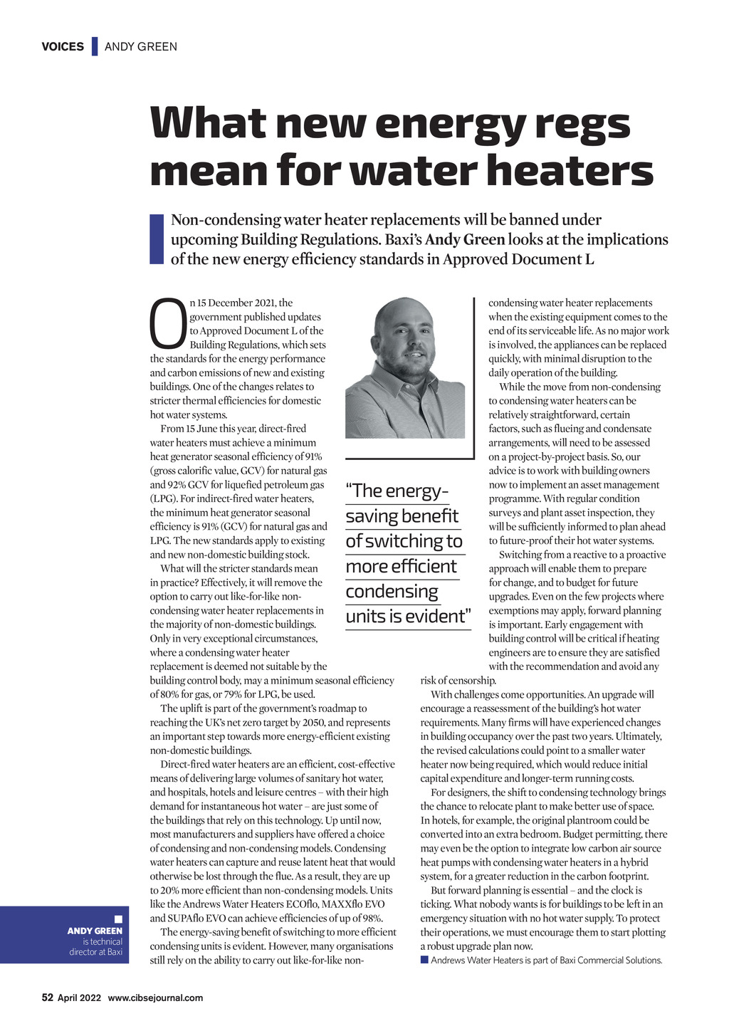 VOICES | ANDY GREEN What new energy regs mean for water heaters Non-condensing water heater replacements will be banned under upcoming Building Regulations. Baxis Andy Green looks at the implications of the new energy efciency standards in Approved Document L O n 15 December 2021, the government published updates to Approved Document L of the Building Regulations, which sets the standards for the energy performance and carbon emissions of new and existing buildings. One of the changes relates to stricter thermal efficiencies for domestic hot water systems. From 15 June this year, direct-fired water heaters must achieve a minimum heat generator seasonal efficiency of 91% (gross calorific value, GCV) for natural gas and 92% GCV for liquefied petroleum gas (LPG). For indirect-fired water heaters, the minimum heat generator seasonal efficiency is 91% (GCV) for natural gas and LPG. The new standards apply to existing and new non-domestic building stock. What will the stricter standards mean in practice? Effectively, it will remove the option to carry out like-for-like noncondensing water heater replacements in the majority of non-domestic buildings. Only in very exceptional circumstances, where a condensing water heater replacement is deemed not suitable by the building control body, may a minimum seasonal efficiency of 80% for gas, or 79% for LPG, be used. The uplift is part of the governments roadmap to reaching the UKs net zero target by 2050, and represents an important step towards more energy-efficient existing non-domestic buildings. Direct-fired water heaters are an efficient, cost-effective means of delivering large volumes of sanitary hot water, and hospitals, hotels and leisure centres with their high demand for instantaneous hot water are just some of the buildings that rely on this technology. Up until now, most manufacturers and suppliers have offered a choice of condensing and non-condensing models. Condensing water heaters can capture and reuse latent heat that would otherwise be lost through the flue. As a result, they are up to 20% more efficient than non-condensing models. Units like the Andrews Water Heaters ECOflo, MAXXflo EVO and SUPAflo EVO can achieve efficiencies of up of 98%. The energy-saving benefit of switching to more efficient condensing units is evident. However, many organisations still rely on the ability to carry out like-for-like non- condensing water heater replacements when the existing equipment comes to the end of its serviceable life. As no major work is involved, the appliances can be replaced quickly, with minimal disruption to the daily operation of the building. While the move from non-condensing to condensing water heaters can be relatively straightforward, certain factors, such as flueing and condensate arrangements, will need to be assessed on a project-by-project basis. So, our advice is to work with building owners now to implement an asset management programme. With regular condition surveys and plant asset inspection, they will be sufficiently informed to plan ahead to future-proof their hot water systems. Switching from a reactive to a proactive approach will enable them to prepare for change, and to budget for future upgrades. Even on the few projects where exemptions may apply, forward planning is important. Early engagement with building control will be critical if heating engineers are to ensure they are satisfied with the recommendation and avoid any risk of censorship. With challenges come opportunities. An upgrade will encourage a reassessment of the buildings hot water requirements. Many firms will have experienced changes in building occupancy over the past two years. Ultimately, the revised calculations could point to a smaller water heater now being required, which would reduce initial capital expenditure and longer-term running costs. For designers, the shift to condensing technology brings the chance to relocate plant to make better use of space. In hotels, for example, the original plantroom could be converted into an extra bedroom. Budget permitting, there may even be the option to integrate low carbon air source heat pumps with condensing water heaters in a hybrid system, for a greater reduction in the carbon footprint. But forward planning is essential and the clock is ticking. What nobody wants is for buildings to be left in an emergency situation with no hot water supply. To protect their operations, we must encourage them to start plotting a robust upgrade plan now. Andrews Water Heaters is part of Baxi Commercial Solutions. The energysaving benefit of switching to more efficient condensing units is evident ANDY GREEN is technical director at Baxi 52 April 2022 www.cibsejournal.com CIBSE Apr 22 pp52 Andy Green.indd 52 25/03/2022 18:02