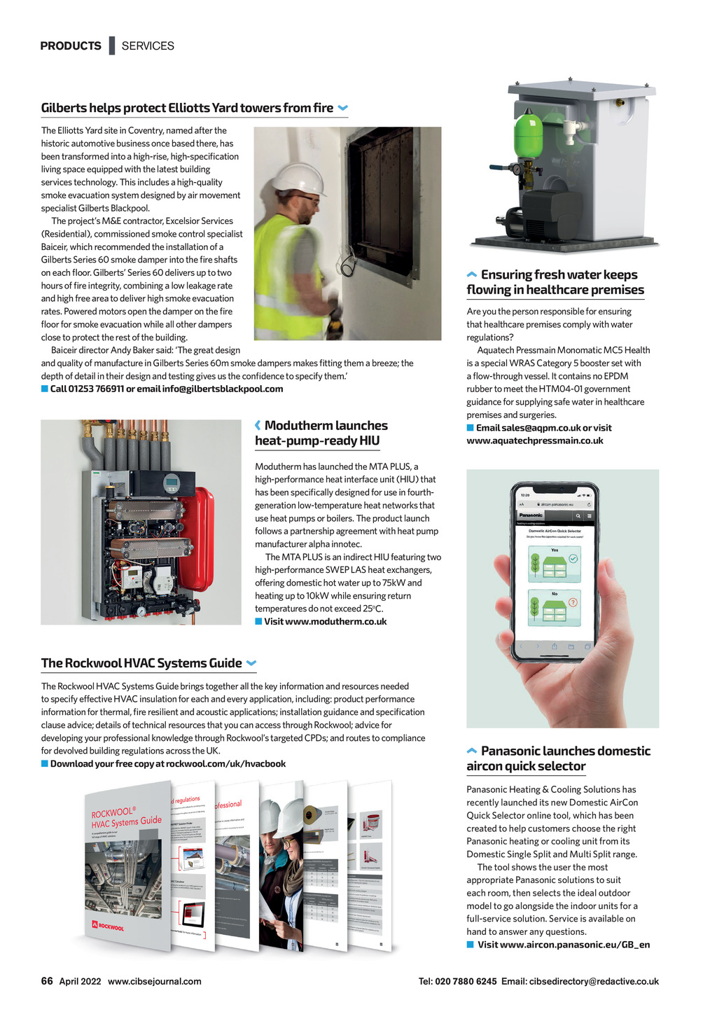 PRODUCTS | SERVICES Gilberts helps protect Elliotts Yard towers from fire The Elliotts Yard site in Coventry, named after the historic automotive business once based there, has been transformed into a high-rise, high-specification living space equipped with the latest building services technology. This includes a high-quality smoke evacuation system designed by air movement specialist Gilberts Blackpool. The projects M&E contractor, Excelsior Services (Residential), commissioned smoke control specialist Baiceir, which recommended the installation of a Gilberts Series 60 smoke damper into the fire shafts on each floor. Gilberts Series 60 delivers up to two hours of fire integrity, combining a low leakage rate and high free area to deliver high smoke evacuation rates. Powered motors open the damper on the fire floor for smoke evacuation while all other dampers close to protect the rest of the building. Baiceir director Andy Baker said: The great design and quality of manufacture in Gilberts Series 60m smoke dampers makes fitting them a breeze; the depth of detail in their design and testing gives us the confidence to specify them. Call 01253 766911 or email info@gilbertsblackpool.com Ensuring fresh water keeps flowing in healthcare premises Are you the person responsible for ensuring that healthcare premises comply with water regulations? Aquatech Pressmain Monomatic MC5 Health is a special WRAS Category 5 booster set with a flow-through vessel. It contains no EPDM rubber to meet the HTM04-01 government guidance for supplying safe water in healthcare premises and surgeries. Email sales@aqpm.co.uk or visit www.aquatechpressmain.co.uk Modutherm launches heat-pump-ready HIU Modutherm has launched the MTA PLUS, a high-performance heat interface unit (HIU) that has been specifically designed for use in fourthgeneration low-temperature heat networks that use heat pumps or boilers. The product launch follows a partnership agreement with heat pump manufacturer alpha innotec. The MTA PLUS is an indirect HIU featuring two high-performance SWEP LAS heat exchangers, offering domestic hot water up to 75kW and heating up to 10kW while ensuring return temperatures do not exceed 25oC. Visit www.modutherm.co.uk The Rockwool HVAC Systems Guide The Rockwool HVAC Systems Guide brings together all the key information and resources needed to specify effective HVAC insulation for each and every application, including: product performance information for thermal, fire resilient and acoustic applications; installation guidance and specification clause advice; details of technical resources that you can access through Rockwool; advice for developing your professional knowledge through Rockwools targeted CPDs; and routes to compliance for devolved building regulations across the UK. Download your free copy at rockwool.com/uk/hvacbook Panasonic launches domestic aircon quick selector Panasonic Heating & Cooling Solutions has recently launched its new Domestic AirCon Quick Selector online tool, which has been created to help customers choose the right Panasonic heating or cooling unit from its Domestic Single Split and Multi Split range. The tool shows the user the most appropriate Panasonic solutions to suit each room, then selects the ideal outdoor model to go alongside the indoor units for a full-service solution. Service is available on hand to answer any questions. Visit www.aircon.panasonic.eu/GB_en 66 April 2022 www.cibsejournal.com CIBSE Apr 22 pp65-68 Products.indd 66 Tel: 020 7880 6245 Email: cibsedirectory@redactive.co.uk 25/03/2022 14:33