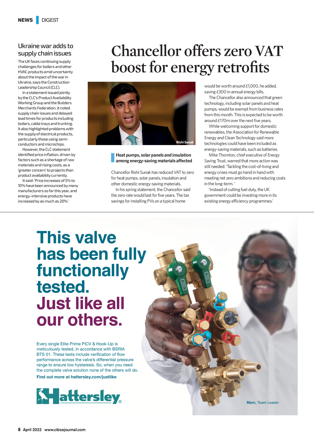 EWS | DIGEST Ukraine war adds to supply chain issues The UK faces continuing supply challenges for boilers and other HVAC products amid uncertainty about the impact of the war in Ukraine, says the Construction Leadership Council (CLC). In a statement issued jointly by the CLCs Product Availability Working Group and the Builders Merchants Federation, it noted supply chain issues and delayed lead times for products including boilers, cable trays and trunking. It also highlighted problems with the supply of electrical products, particularly those using semiconductors and microchips. However, the CLC statement identified price inflation, driven by factors such as a shortage of raw materials and rising costs, as a greater concern to projects than product availability currently. It said: Price increases of 5% to 10% have been announced by many manufacturers so far this year, and energy-intensive products have increased by as much as 20%. Chancellor offers zero VAT boost for energy retrots Rishi Sunak Heat pumps, solar panels and insulation among energy-saving materials affected Chancellor Rishi Sunak has reduced VAT to zero for heat pumps, solar panels, insulation and other domestic energy-saving materials. In his spring statement, the Chancellor said the zero rate would last for ve years. The tax savings for installing PVs on a typical home would be worth around 1,000, he added, saving 300 in annual energy bills. The Chancellor also announced that green technology, including solar panels and heat pumps, would be exempt from business rates from this month. This is expected to be worth around 170m over the next ve years. While welcoming support for domestic renewables, the Association for Renewable Energy and Clean Technology said more technologies could have been included as energy-saving materials, such as batteries. Mike Thornton, chief executive of Energy Saving Trust, warned that more action was still needed: Tackling the cost-of-living and energy crises must go hand in hand with meeting net zero ambitions and reducing costs in the long-term. Instead of cutting fuel duty, the UK government could be investing more in its existing energy efciency programmes. This valve has been fully functionally tested. Just like all our others. Every single Elite Prime PICV & Hook-Up is meticulously tested, in accordance with BSRIA BTS 01. These tests include verification of flow performance across the valves differential pressure range to ensure low hysteresis. So, when you need the complete valve solution none of the others will do. Find out more at hattersley.com/justlike Marc, Team Leader 21400_HATTERSLEY_FUNCTION_TEST_AD_133X186.indd 1 14/02/2022 13:27 8 April 2022 www.cibsejournal.com CIBSE Apr 22 pp08 News.indd 8 25/03/2022 14:25
