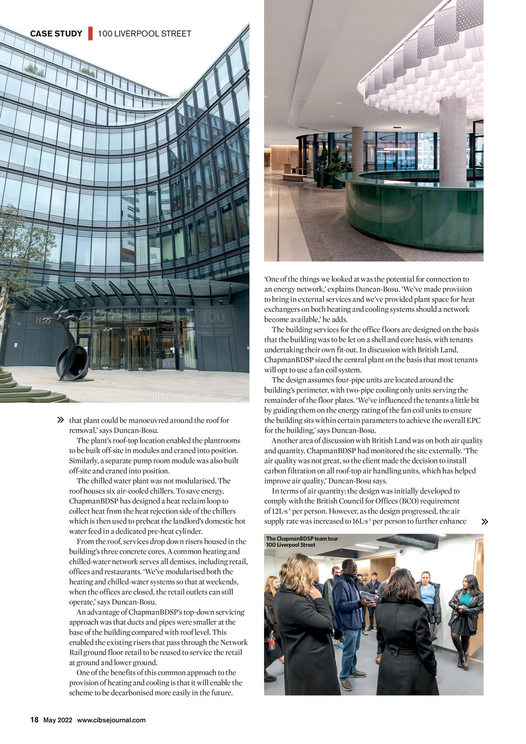 CASE STUDY | 100 LIVERPOOL STREET that plant could be manoeuvred around the roof for removal, says Duncan-Bosu. The plants roof-top location enabled the plantrooms to be built off-site in modules and craned into position. Similarly, a separate pump room module was also built off-site and craned into position. The chilled water plant was not modularised. The roof houses six air-cooled chillers. To save energy, ChapmanBDSP has designed a heat reclaim loop to collect heat from the heat rejection side of the chillers which is then used to preheat the landlords domestic hot water feed in a dedicated pre-heat cylinder. From the roof, services drop down risers housed in the buildings three concrete cores. A common heating and chilled-water network serves all demises, including retail, offices and restaurants. Weve modularised both the heating and chilled-water systems so that at weekends, when the offices are closed, the retail outlets can still operate, says Duncan-Bosu. An advantage of ChapmanBDSPs top-down servicing approach was that ducts and pipes were smaller at the base of the building compared with roof level. This enabled the existing risers that pass through the Network Rail ground floor retail to be reused to service the retail at ground and lower ground. One of the benefits of this common approach to the provision of heating and cooling is that it will enable the scheme to be decarbonised more easily in the future. One of the things we looked at was the potential for connection to an energy network, explains Duncan-Bosu. Weve made provision to bring in external services and weve provided plant space for heat exchangers on both heating and cooling systems should a network become available, he adds. The building services for the office floors are designed on the basis that the building was to be let on a shell and core basis, with tenants undertaking their own fit-out. In discussion with British Land, ChapmanBDSP sized the central plant on the basis that most tenants will opt to use a fan coil system. The design assumes four-pipe units are located around the buildings perimeter, with two-pipe cooling only units serving the remainder of the floor plates. Weve influenced the tenants a little bit by guiding them on the energy rating of the fan coil units to ensure the building sits within certain parameters to achieve the overall EPC for the building, says Duncan-Bosu. Another area of discussion with British Land was on both air quality and quantity. ChapmanBDSP had monitored the site externally. The air quality was not great, so the client made the decision to install carbon filtration on all roof-top air handling units, which has helped improve air quality, Duncan-Bosu says. In terms of air quantity: the design was initially developed to comply with the British Council for Offices (BCO) requirement of 12Ls-1 per person. However, as the design progressed, the air supply rate was increased to 16Ls-1 per person to further enhance The ChapmanBDSP team tour 100 Liverpool Street 18 May 2022 www.cibsejournal.com CIBSE May 22 pp16-18, 20 100 Liverpool Street.indd 18 22/04/2022 15:11