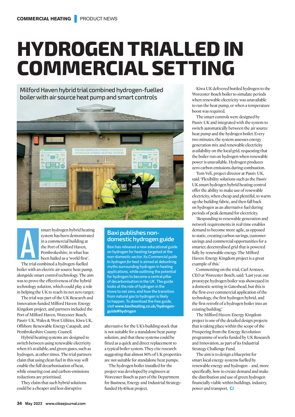 COMMERCIAL HEATING | PRODUCT NEWS HYDROGEN TRIALLED IN COMMERCIAL SETTING Milford Haven hybrid trial combined hydrogen-fuelled boiler with air source heat pump and smart controls A smart hydrogen hybrid heating system has been demonstrated in a commercial building at the Port of Milford Haven, Pembrokeshire, in what has been hailed as a world first. The trial combined a hydrogen-fuelled boiler with an electric air source heat pump, alongside smart control technology. The aim was to prove the effectiveness of the hybrid technology solution, which could play a role in helping the UK to reach its net zero target. The trial was part of the UK Research and Innovation-funded Milford Haven: Energy Kingdom project, and partners included the Port of Milford Haven, Worcester Bosch, Passiv UK, Wales & West Utilities, Kiwa UK, Offshore Renewable Energy Catapult, and Pembrokeshire County Council. Hybrid heating systems are designed to switch between using renewable electricity when its available, and green gases, such as hydrogen, at other times. The trial partners claim that using clean fuel in this way will enable the full decarbonisation of heat, while ensuring cost and carbon-emissions reductions are prioritised. They claim that such hybrid solutions could be a cheaper and less disruptive Baxi publishes nondomestic hydrogen guide Baxi has released a new educational guide on hydrogen for heating targeted at the non-domestic sector. Its Commercial guide to hydrogen for heat is aimed at debunking myths surrounding hydrogen in heating applications, while outlining the potential for hydrogen to become a central pillar of decarbonisation in the UK. The guide looks at the role of hydrogen in the move to net zero, and how the transition from natural gas to hydrogen is likely to happen. To download the free guide, visit www.baxiheating.co.uk/hydrogenguide#hydrogen alternative for the UKs building stock that is not suitable for a standalone heat pump solution, and that these systems could be fitted as a quick and direct replacement to a typical boiler system. They cite research suggesting that almost 50% of UK properties are not suitable for standalone heat pumps. The hydrogen boiler installed for the project was developed by engineers at Worcester Bosch as part of the Department for Business, Energy and Industrial Strategyfunded Hy4Heat project. Kiwa UK delivered bottled hydrogen to the Worcester Bosch boiler to simulate periods when renewable electricity was unavailable to run the heat pump, or when a temperature boost was required. The smart controls were designed by Passiv UK and integrated with the system to switch automatically between the air source heat pump and the hydrogen boiler. Every two minutes, the system assesses energy generation mix and renewable electricity availability on the local grid, requesting that the boiler run on hydrogen when renewable power is unavailable. Hydrogen produces zero carbon emissions during combustion. Tom Veli, project director at Passiv UK, said: Flexibility solutions such as the Passiv UK smart hydrogen hybrid heating control offer the ability to make use of renewable electricity, when cheap and plentiful, to warm up the building fabric, and then fall back on hydrogen as an alternative fuel during periods of peak demand for electricity. Responding to renewable generation and network requirements in real time enables demand to become more agile, as opposed to static, creating carbon savings, customer savings and commercial opportunities for a smarter, decentralised grid that is powered fully by renewable energy. The Milford Haven: Energy Kingdom project is a great example of this. Commenting on the trial, Carl Arntzen, CEO at Worcester Bosch, said: Last year, our prototype hydrogen boiler was showcased in a domestic setting in Gateshead, but this is the first-ever commercial application of the technology, the first hydrogen hybrid, and the first retrofit of a hydrogen boiler into an existing building. The Milford Haven: Energy Kingdom project is one of the detailed design projects that is taking place within the scope of the Prospering from the Energy Revolution programme of works funded by UK Research and Innovation, as part of its Industrial Strategy Challenge Fund. The aim is to design a blueprint for smart local energy systems fuelled by renewable energy and hydrogen and, more specifically, how to create demand and make the distribution and use of green hydrogen financially viable within buildings, industry, power and transport. CJ 34 May 2022 www.cibsejournal.com CIBSE May 22 pp34-35 Heating News Supp PL.indd 34 22/04/2022 15:21