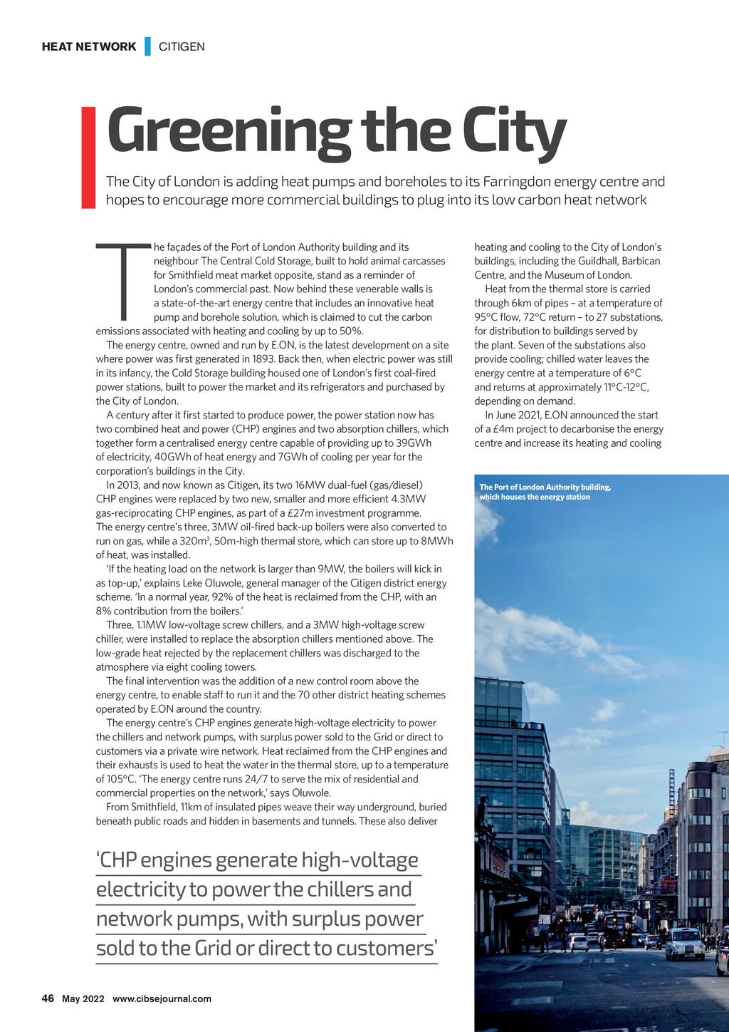 HEAT NETWORK | CITIGEN Greening the City The City of London is adding heat pumps and boreholes to its Farringdon energy centre and hopes to encourage more commercial buildings to plug into its low carbon heat network T he faades of the Port of London Authority building and its neighbour The Central Cold Storage, built to hold animal carcasses for Smithfield meat market opposite, stand as a reminder of Londons commercial past. Now behind these venerable walls is a state-of-the-art energy centre that includes an innovative heat pump and borehole solution, which is claimed to cut the carbon emissions associated with heating and cooling by up to 50%. The energy centre, owned and run by E.ON, is the latest development on a site where power was first generated in 1893. Back then, when electric power was still in its infancy, the Cold Storage building housed one of Londons first coal-fired power stations, built to power the market and its refrigerators and purchased by the City of London. A century after it first started to produce power, the power station now has two combined heat and power (CHP) engines and two absorption chillers, which together form a centralised energy centre capable of providing up to 39GWh of electricity, 40GWh of heat energy and 7GWh of cooling per year for the corporations buildings in the City. In 2013, and now known as Citigen, its two 16MW dual-fuel (gas/diesel) CHP engines were replaced by two new, smaller and more efficient 4.3MW gas-reciprocating CHP engines, as part of a 27m investment programme. The energy centres three, 3MW oil-fired back-up boilers were also converted to run on gas, while a 320m3, 50m-high thermal store, which can store up to 8MWh of heat, was installed. If the heating load on the network is larger than 9MW, the boilers will kick in as top-up, explains Leke Oluwole, general manager of the Citigen district energy scheme. In a normal year, 92% of the heat is reclaimed from the CHP, with an 8% contribution from the boilers. Three, 1.1MW low-voltage screw chillers, and a 3MW high-voltage screw chiller, were installed to replace the absorption chillers mentioned above. The low-grade heat rejected by the replacement chillers was discharged to the atmosphere via eight cooling towers. The final intervention was the addition of a new control room above the energy centre, to enable staff to run it and the 70 other district heating schemes operated by E.ON around the country. The energy centres CHP engines generate high-voltage electricity to power the chillers and network pumps, with surplus power sold to the Grid or direct to customers via a private wire network. Heat reclaimed from the CHP engines and their exhausts is used to heat the water in the thermal store, up to a temperature of 105C. The energy centre runs 24/7 to serve the mix of residential and commercial properties on the network, says Oluwole. From Smithfield, 11km of insulated pipes weave their way underground, buried beneath public roads and hidden in basements and tunnels. These also deliver heating and cooling to the City of Londons buildings, including the Guildhall, Barbican Centre, and the Museum of London. Heat from the thermal store is carried through 6km of pipes at a temperature of 95C flow, 72C return to 27 substations, for distribution to buildings served by the plant. Seven of the substations also provide cooling; chilled water leaves the energy centre at a temperature of 6C and returns at approximately 11C-12C, depending on demand. In June 2021, E.ON announced the start of a 4m project to decarbonise the energy centre and increase its heating and cooling The Port of London Authority building, which houses the energy station CHP engines generate high-voltage electricity to power the chillers and network pumps, with surplus power sold to the Grid or direct to customers 46 May 2022 www.cibsejournal.com CIBSE May 22 pp46-48, 50-51 Citigen Supp.indd 46 22/04/2022 15:56