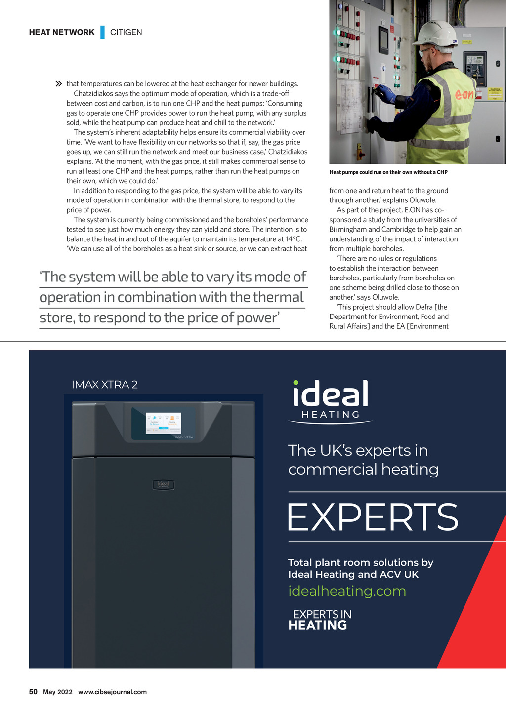 HEAT NETWORK | CITIGEN that temperatures can be lowered at the heat exchanger for newer buildings. Chatzidiakos says the optimum mode of operation, which is a trade-off between cost and carbon, is to run one CHP and the heat pumps: Consuming gas to operate one CHP provides power to run the heat pump, with any surplus sold, while the heat pump can produce heat and chill to the network. The systems inherent adaptability helps ensure its commercial viability over time. We want to have exibility on our networks so that if, say, the gas price goes up, we can still run the network and meet our business case, Chatzidiakos explains. At the moment, with the gas price, it still makes commercial sense to run at least one CHP and the heat pumps, rather than run the heat pumps on their own, which we could do. In addition to responding to the gas price, the system will be able to vary its mode of operation in combination with the thermal store, to respond to the price of power. The system is currently being commissioned and the boreholes performance tested to see just how much energy they can yield and store. The intention is to balance the heat in and out of the aquifer to maintain its temperature at 14C. We can use all of the boreholes as a heat sink or source, or we can extract heat The system will be able to vary its mode of operation in combination with the thermal store, to respond to the price of power Heat pumps could run on their own without a CHP from one and return heat to the ground through another, explains Oluwole. As part of the project, E.ON has cosponsored a study from the universities of Birmingham and Cambridge to help gain an understanding of the impact of interaction from multiple boreholes. There are no rules or regulations to establish the interaction between boreholes, particularly from boreholes on one scheme being drilled close to those on another, says Oluwole. This project should allow Defra [the Department for Environment, Food and Rural Affairs] and the EA [Environment IMAX XTRA 2 The UKs experts in commercial heating EXPERTS Total plant room solutions by Ideal Heating and ACV UK idealheating.com 50 May 2022 www.cibsejournal.com CIBSE May 22 pp46-48, 50-51 Citigen Supp.indd 50 22/04/2022 15:57