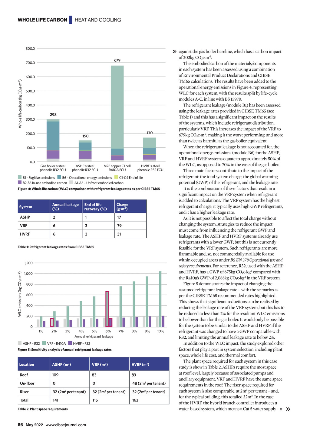 WHOLE LIFE CARBON | HEAT AND COOLING 800.0 679 Whole life carbon (kg CO2e.m-2) 700.0 600.0 500.0 400.0 298 300.0 200.0 170 150 100.0 0.0 Gas boiler s.steel phenolic R32 FCU ASHP s.steel phenolic R32 FCU VRF copper CI cell R410A FCU HVRF s.steel phenolic R32 FCU B1 Fugitive emissions B6 Operational energy emissions C1-C4 End of life B2-B5 In-use embodied carbon A1-A5 Upfront embodied carbon Figure 4: Whole life carbon (WLC) comparison with refrigerant leakage rates as per CIBSE TM65 System Annual leakage (%) End of life recovery (%) Charge (g.m-2) ASHP 2 1 17 VRF 6 3 79 HVRF 6 3 31 Table 1: Refrigerant leakage rates from CIBSE TM65 WLC emissions (kg CO2e.m-2) 1,200 1,000 800 600 400 200 0 1% 2% 3% 4% 5% 6% Annual refrigerant leakage 7% 8% 9% 10% ASHP R32 VRF R410A HVRF R32 Figure 5: Sensitivity analysis of annual refrigerant leakage rates Location ASHP (m2) VRF (m2) HVRF (m2) Roof 109 83 83 On-floor 0 0 48 (2m2 per tenant) Riser 32 (2m2 per tenant) 32 (2m2 per tenant) 32 (2m2 per tenant) Total 141 115 163 Table 2: Plant space requirements against the gas boiler baseline, which has a carbon impact of 202kg CO2e.m-2. The embodied carbon of the materials/components in each system has been assessed using a combination of Environmental Product Declarations and CIBSE TM65 calculations. The results have been added to the operational energy emissions in Figure 4, representing WLC for each system, with the results split by life-cycle modules A-C, in line with BS 15978. The refrigerant leakage (module B1) has been assessed using the leakage rates provided in CIBSE TM65 (see Table 1) and this has a significant impact on the results of the systems, which include refrigerant distribution, particularly VRF. This increases the impact of the VRF to 679kg CO2e.m-2, making it the worst performing, and more than twice as harmful as the gas boiler equivalent. When the refrigerant leakage is not accounted for, the operational energy emissions (module B6) for the ASHP, VRF and HVRF systems equate to approximately 50% of the WLC, as opposed to 70% in the case of the gas boiler. Three main factors contribute to the impact of the refrigerant: the total system charge, the global warming potential (GWP) of the refrigerant, and the leakage rate. It is the combination of these factors that result in a significant impact on the VRF system when refrigerant is added to calculations. The VRF system has the highest refrigerant charge, it typically uses high GWP refrigerants, and it has a higher leakage rate. As it is not possible to affect the total charge without changing the system, strategies to reduce the impact must come from influencing the refrigerant GWP and leakage rate. The ASHP and HVRF systems already use refrigerants with a lower GWP, but this is not currently feasible for the VRF system. Such refrigerants are more flammable and, so, not commercially available for use within occupied areas under BS EN 378 Operational use and safety requirements. For reference, R32, used with the ASHP and HVRF, has a GWP of 675kg CO2e.kg-1 compared with the R410as GWP of 2,088kg CO2e.kg-1 in the VRF system. Figure 5 demonstrates the impact of changing the assumed refrigerant leakage rate with the scenarios as per the CIBSE TM65 recommended rates highlighted. This shows that significant reductions can be realised by reducing the leakage rate of the VRF system, but this has to be reduced to less than 2% for the resultant WLC emissions to be lower than for the gas boiler. It would only be possible for the system to be similar to the ASHP and HVRF if the refrigerant was changed to have a GWP comparable with R32, and limiting the annual leakage rate to below 2%. In addition to the WLC impact, the study explored other factors that play a part in system selection, including plant space, whole life cost, and thermal comfort. The plant space required for each system in this case study is show in Table 2. ASHPs require the most space at roof level, largely because of associated pumps and ancillary equipment. VRF and HVRF have the same space requirements in the roof. The riser space required for each system is also comparable, at 2m2 per tenant and, for the typical building, this totalled 32m2. In the case of the HVRF, the hybrid branch controller introduces a water-based system, which means a Cat 5 water supply a 66 May 2022 www.cibsejournal.com CIBSE May 22 pp64-66, 68 Whole life carbon cooling and heating.indd 66 22/04/2022 18:13