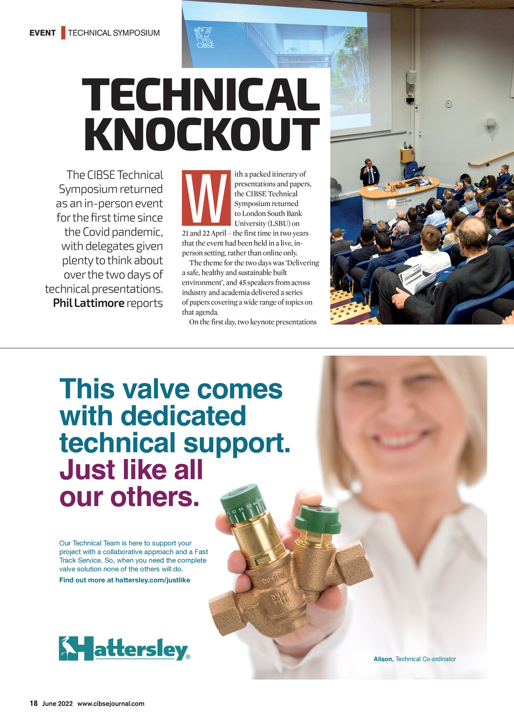 EVENT | TECHNICAL SYMPOSIUM TECHNICAL KNOCKOUT The CIBSE Technical Symposium returned as an in-person event for the first time since the Covid pandemic, with delegates given plenty to think about over the two days of technical presentations. Phil Lattimore reports W ith a packed itinerary of presentations and papers, the CIBSE Technical Symposium returned to London South Bank University (LSBU) on 21 and 22 April the first time in two years that the event had been held in a live, inperson setting, rather than online only. The theme for the two days was Delivering a safe, healthy and sustainable built environment, and 45 speakers from across industry and academia delivered a series of papers covering a wide range of topics on that agenda. On the first day, two keynote presentations This valve comes with dedicated technical support. Just like all our others. Our Technical Team is here to support your project with a collaborative approach and a Fast Track Service. So, when you need the complete valve solution none of the others will do. Find out more at hattersley.com/justlike Alison, Technical Co-ordinator 21400_HATTERSLEY_TECH_SUPPORT_133X186.indd 1 14/02/2022 17:30 18 June 2022 www.cibsejournal.com CIBSE June 22 pp18-19 Technical Symposium.indd 18 27/05/2022 15:41