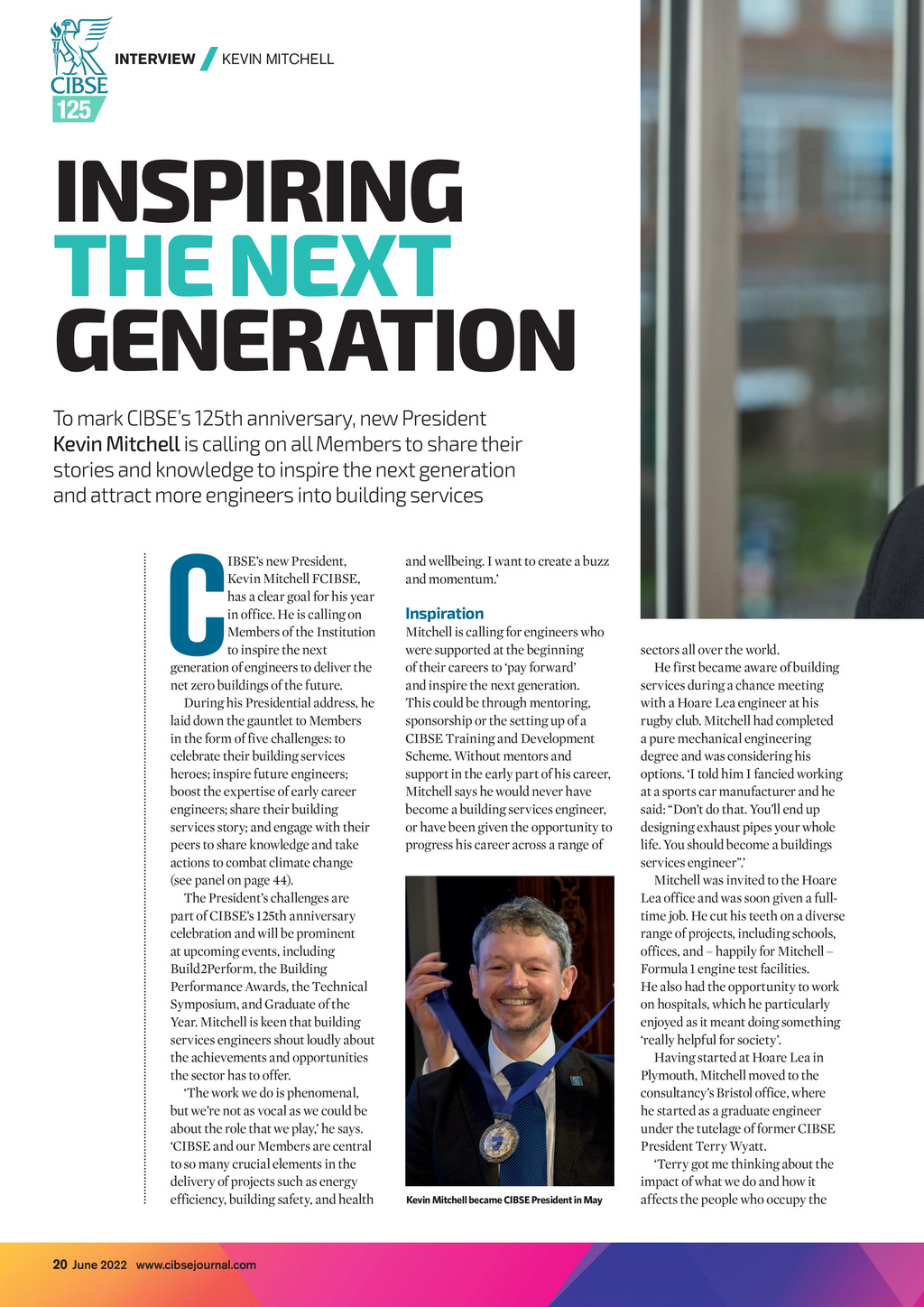 INTERVIEW | KEVIN MITCHELL INSPIRING THE NEXT GENERATION To mark CIBSEs 125th anniversary, new President Kevin Mitchell is calling on all Members to share their stories and knowledge to inspire the next generation and attract more engineers into building services C IBSEs new President, Kevin Mitchell FCIBSE, has a clear goal for his year in office. He is calling on Members of the Institution to inspire the next generation of engineers to deliver the net zero buildings of the future. During his Presidential address, he laid down the gauntlet to Members in the form of five challenges: to celebrate their building services heroes; inspire future engineers; boost the expertise of early career engineers; share their building services story; and engage with their peers to share knowledge and take actions to combat climate change (see panel on page 44). The Presidents challenges are part of CIBSEs 125th anniversary celebration and will be prominent at upcoming events, including Build2Perform, the Building Performance Awards, the Technical Symposium, and Graduate of the Year. Mitchell is keen that building services engineers shout loudly about the achievements and opportunities the sector has to offer. The work we do is phenomenal, but were not as vocal as we could be about the role that we play, he says. CIBSE and our Members are central to so many crucial elements in the delivery of projects such as energy efficiency, building safety, and health and wellbeing. I want to create a buzz and momentum. Inspiration Mitchell is calling for engineers who were supported at the beginning of their careers to pay forward and inspire the next generation. This could be through mentoring, sponsorship or the setting up of a CIBSE Training and Development Scheme. Without mentors and support in the early part of his career, Mitchell says he would never have become a building services engineer, or have been given the opportunity to progress his career across a range of Kevin Mitchell became CIBSE President in May sectors all over the world. He first became aware of building services during a chance meeting with a Hoare Lea engineer at his rugby club. Mitchell had completed a pure mechanical engineering degree and was considering his options. I told him I fancied working at a sports car manufacturer and he said: Dont do that. Youll end up designing exhaust pipes your whole life. You should become a buildings services engineer. Mitchell was invited to the Hoare Lea office and was soon given a fulltime job. He cut his teeth on a diverse range of projects, including schools, offices, and happily for Mitchell Formula 1 engine test facilities. He also had the opportunity to work on hospitals, which he particularly enjoyed as it meant doing something really helpful for society. Having started at Hoare Lea in Plymouth, Mitchell moved to the consultancys Bristol office, where he started as a graduate engineer under the tutelage of former CIBSE President Terry Wyatt. Terry got me thinking about the impact of what we do and how it affects the people who occupy the 20 June 2022 www.cibsejournal.com CIBSE June 22 pp20-22 Kevin Mitchell interview.indd 20 27/05/2022 18:03