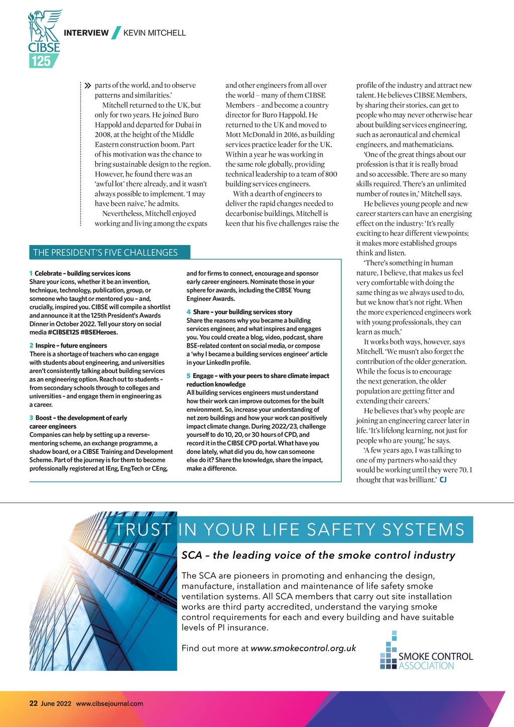 INTERVIEW | KEVIN MITCHELL parts of the world, and to observe patterns and similarities. Mitchell returned to the UK, but only for two years. He joined Buro Happold and departed for Dubai in 2008, at the height of the Middle Eastern construction boom. Part of his motivation was the chance to bring sustainable design to the region. However, he found there was an awful lot there already, and it wasnt always possible to implement. I may have been naive, he admits. Nevertheless, Mitchell enjoyed working and living among the expats and other engineers from all over the world many of them CIBSE Members and become a country director for Buro Happold. He returned to the UK and moved to Mott McDonald in 2016, as building services practice leader for the UK. Within a year he was working in the same role globally, providing technical leadership to a team of 800 building services engineers. With a dearth of engineers to deliver the rapid changes needed to decarbonise buildings, Mitchell is keen that his five challenges raise the THE PRESIDENTS FIVE CHALLENGES 1 Celebrate building services icons Share your icons, whether it be an invention, technique, technology, publication, group, or someone who taught or mentored you and, crucially, inspired you. CIBSE will compile a shortlist and announce it at the 125th Presidents Awards Dinner in October 2022. Tell your story on social media #CIBSE125 #BSEHeroes. 2 Inspire future engineers There is a shortage of teachers who can engage with students about engineering, and universities arent consistently talking about building services as an engineering option. Reach out to students from secondary schools through to colleges and universities and engage them in engineering as a career. 3 Boost the development of early career engineers Companies can help by setting up a reversementoring scheme, an exchange programme, a shadow board, or a CIBSE Training and Development Scheme. Part of the journey is for them to become professionally registered at IEng, EngTech or CEng, and for rms to connect, encourage and sponsor early career engineers. Nominate those in your sphere for awards, including the CIBSE Young Engineer Awards. 4 Share your building services story Share the reasons why you became a building services engineer, and what inspires and engages you. You could create a blog, video, podcast, share BSE-related content on social media, or compose a why I became a building services engineer article in your LinkedIn prole. 5 Engage with your peers to share climate impact reduction knowledge All building services engineers must understand how their work can improve outcomes for the built environment. So, increase your understanding of net zero buildings and how your work can positively impact climate change. During 2022/23, challenge yourself to do 10, 20, or 30 hours of CPD, and record it in the CIBSE CPD portal. What have you done lately, what did you do, how can someone else do it? Share the knowledge, share the impact, make a difference. profile of the industry and attract new talent. He believes CIBSE Members, by sharing their stories, can get to people who may never otherwise hear about building services engineering, such as aeronautical and chemical engineers, and mathematicians. One of the great things about our profession is that it is really broad and so accessible. There are so many skills required. Theres an unlimited number of routes in, Mitchell says. He believes young people and new career starters can have an energising effect on the industry: Its really exciting to hear different viewpoints; it makes more established groups think and listen. Theres something in human nature, I believe, that makes us feel very comfortable with doing the same thing as we always used to do, but we know thats not right. When the more experienced engineers work with young professionals, they can learn as much. It works both ways, however, says Mitchell. We musnt also forget the contribution of the older generation. While the focus is to encourage the next generation, the older population are getting fitter and extending their careers. He believes thats why people are joining an engineering career later in life. Its lifelong learning, not just for people who are young, he says. A few years ago, I was talking to one of my partners who said they would be working until they were 70. I thought that was brilliant. CJ 22 June 2022 www.cibsejournal.com CIBSE June 22 pp20-22 Kevin Mitchell interview.indd 22 27/05/2022 15:42