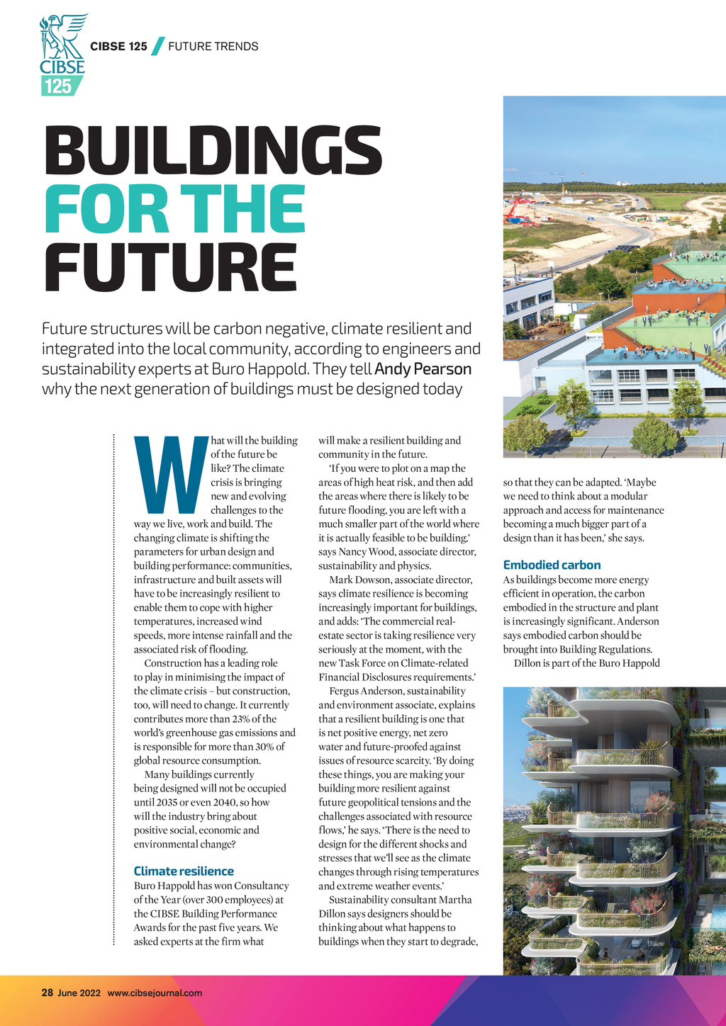 CIBSE 125 | FUTURE TRENDS BUILDINGS FOR THE FUTURE Future structures will be carbon negative, climate resilient and integrated into the local community, according to engineers and sustainability experts at Buro Happold. They tell Andy Pearson why the next generation of buildings must be designed today W hat will the building of the future be like? The climate crisis is bringing new and evolving challenges to the way we live, work and build. The changing climate is shifting the parameters for urban design and building performance: communities, infrastructure and built assets will have to be increasingly resilient to enable them to cope with higher temperatures, increased wind speeds, more intense rainfall and the associated risk of flooding. Construction has a leading role to play in minimising the impact of the climate crisis but construction, too, will need to change. It currently contributes more than 23% of the worlds greenhouse gas emissions and is responsible for more than 30% of global resource consumption. Many buildings currently being designed will not be occupied until 2035 or even 2040, so how will the industry bring about positive social, economic and environmental change? Climate resilience Buro Happold has won Consultancy of the Year (over 300 employees) at the CIBSE Building Performance Awards for the past five years. We asked experts at the firm what will make a resilient building and community in the future. If you were to plot on a map the areas of high heat risk, and then add the areas where there is likely to be future flooding, you are left with a much smaller part of the world where it is actually feasible to be building, says Nancy Wood, associate director, sustainability and physics. Mark Dowson, associate director, says climate resilience is becoming increasingly important for buildings, and adds: The commercial realestate sector is taking resilience very seriously at the moment, with the new Task Force on Climate-related Financial Disclosures requirements. Fergus Anderson, sustainability and environment associate, explains that a resilient building is one that is net positive energy, net zero water and future-proofed against issues of resource scarcity. By doing these things, you are making your building more resilient against future geopolitical tensions and the challenges associated with resource flows, he says. There is the need to design for the different shocks and stresses that well see as the climate changes through rising temperatures and extreme weather events. Sustainability consultant Martha Dillon says designers should be thinking about what happens to buildings when they start to degrade, so that they can be adapted. Maybe we need to think about a modular approach and access for maintenance becoming a much bigger part of a design than it has been, she says. Embodied carbon As buildings become more energy efficient in operation, the carbon embodied in the structure and plant is increasingly significant. Anderson says embodied carbon should be brought into Building Regulations. Dillon is part of the Buro Happold 28 June 2022 www.cibsejournal.com CIBSE June 22 pp28-31 Buro Happold future trends.indd 28 27/05/2022 17:02