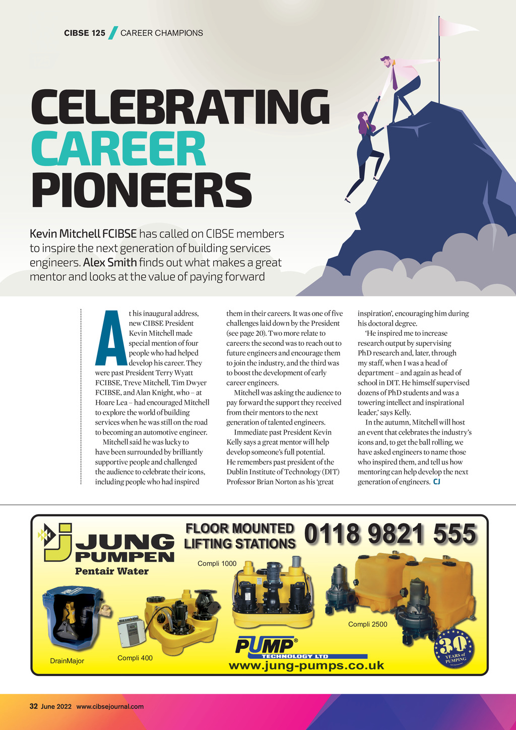 CIBSE 125 | CAREER CHAMPIONS CELEBRATING CAREER PIONEERS Kevin Mitchell FCIBSE has called on CIBSE members to inspire the next generation of building services engineers. Alex Smith finds out what makes a great mentor and looks at the value of paying forward A t his inaugural address, new CIBSE President Kevin Mitchell made special mention of four people who had helped develop his career. They were past President Terry Wyatt FCIBSE, Treve Mitchell, Tim Dwyer FCIBSE, and Alan Knight, who at Hoare Lea had encouraged Mitchell to explore the world of building services when he was still on the road to becoming an automotive engineer. Mitchell said he was lucky to have been surrounded by brilliantly supportive people and challenged the audience to celebrate their icons, including people who had inspired them in their careers. It was one of five challenges laid down by the President (see page 20). Two more relate to careers: the second was to reach out to future engineers and encourage them to join the industry, and the third was to boost the development of early career engineers. Mitchell was asking the audience to pay forward the support they received from their mentors to the next generation of talented engineers. Immediate past President Kevin Kelly says a great mentor will help develop someones full potential. He remembers past president of the Dublin Institute of Technology (DIT) Professor Brian Norton as his great FLOOR MOUNTED LIFTING STATIONS inspiration, encouraging him during his doctoral degree. He inspired me to increase research output by supervising PhD research and, later, through my staff, when I was a head of department and again as head of school in DIT. He himself supervised dozens of PhD students and was a towering intellect and inspirational leader, says Kelly. In the autumn, Mitchell will host an event that celebrates the industrys icons and, to get the ball rolling, we have asked engineers to name those who inspired them, and tell us how mentoring can help develop the next generation of engineers. CJ 0118 9821 555 Compli 1000 Compli 2500 DrainMajor Compli 400 www.jung-pumps.co.uk 32 June 2022 www.cibsejournal.com CIBSE June 22 pp32-33 Industry Icons.indd 32 27/05/2022 18:06
