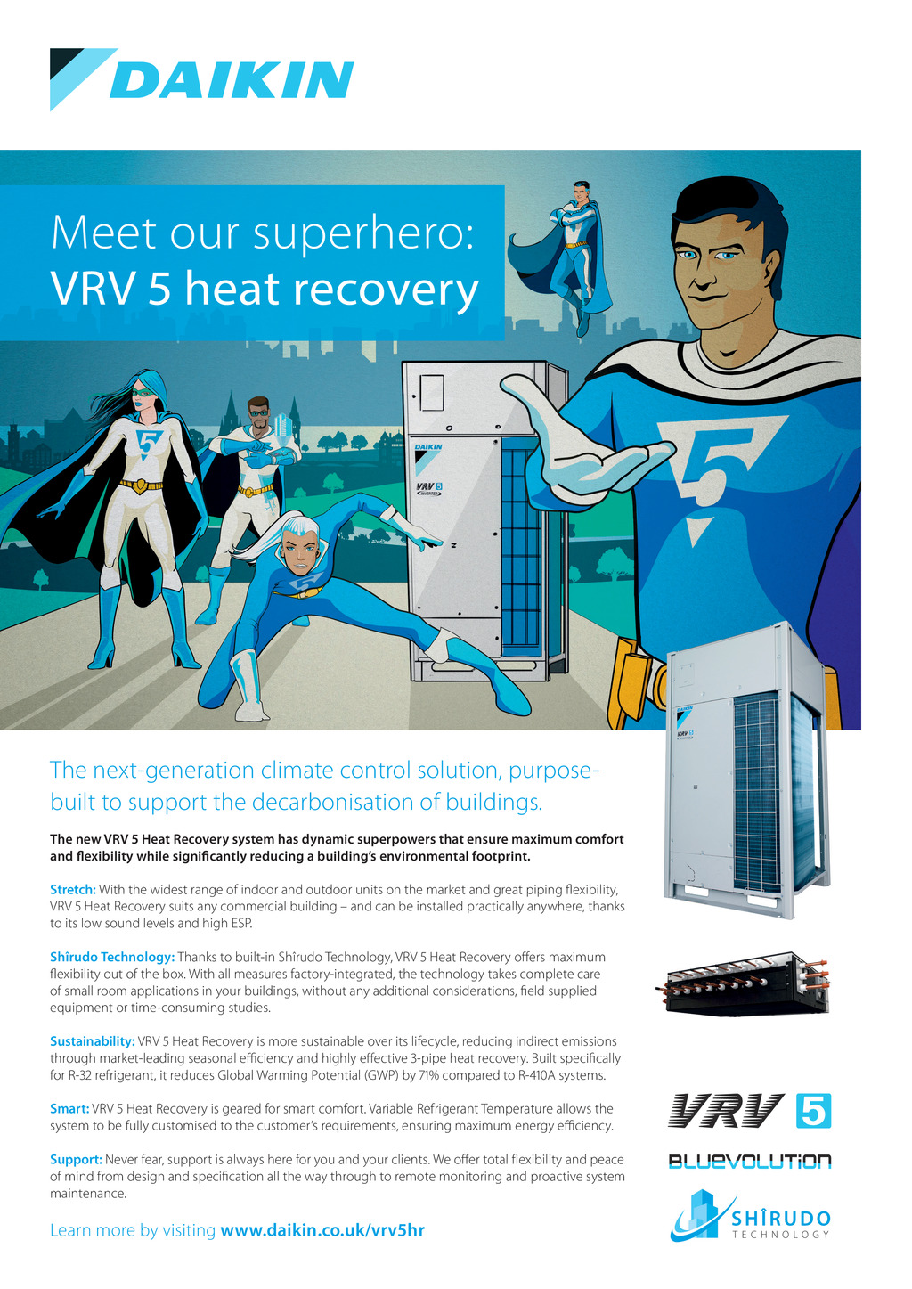 Meet our superhero: VRV 5 heat recovery The next-generation climate control solution, purposebuilt to support the decarbonisation of buildings. The new VRV 5 Heat Recovery system has dynamic superpowers that ensure maximum comfort and flexibility while significantly reducing a buildings environmental footprint. Stretch: With the widest range of indoor and outdoor units on the market and great piping flexibility, VRV 5 Heat Recovery suits any commercial building and can be installed practically anywhere, thanks to its low sound levels and high ESP. Shrudo Technology: Thanks to built-in Shrudo Technology, VRV 5 Heat Recovery offers maximum flexibility out of the box. With all measures factory-integrated, the technology takes complete care of small room applications in your buildings, without any additional considerations, field supplied equipment or time-consuming studies. Sustainability: VRV 5 Heat Recovery is more sustainable over its lifecycle, reducing indirect emissions through market-leading seasonal efficiency and highly effective 3-pipe heat recovery. Built specifically for R-32 refrigerant, it reduces Global Warming Potential (GWP) by 71% compared to R-410A systems. Smart: VRV 5 Heat Recovery is geared for smart comfort. Variable Refrigerant Temperature allows the system to be fully customised to the customers requirements, ensuring maximum energy efficiency. Support: Never fear, support is always here for you and your clients. We offer total flexibility and peace of mind from design and specification all the way through to remote monitoring and proactive system maintenance. Learn more by visiting www.daikin.co.uk/vrv5hr 34 June 2022 www.cibsejournal.com p34.CIBSEMagJune22.indd 34 24/05/2022 10:35