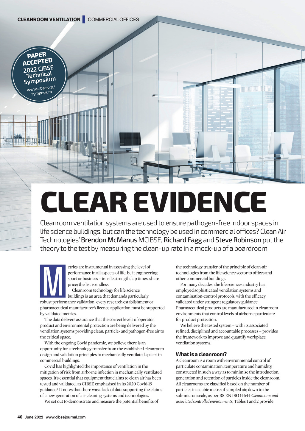 CLEANROOM VENTILATION | COMMERCIAL OFFICES PAPER D ACCEPTE SE 2022 CIBa Technic lm Symposiu .org/ www.cibse m u si o symp CLEAR EVIDENCE Cleanroom ventilation systems are used to ensure pathogen-free indoor spaces in life science buildings, but can the technology be used in commercial offices? Clean Air Technologies Brendon McManus MCIBSE, Richard Fagg and Steve Robinson put the theory to the test by measuring the clean-up rate in a mock-up of a boardroom M etrics are instrumental in assessing the level of performance in all aspects of life, be it engineering, sport or business tensile strength, lap times, share price; the list is endless. Cleanroom technology for life science buildings is an area that demands particularly robust performance validation; every research establishment or pharmaceutical manufacturers licence application must be supported by validated metrics. The data delivers assurance that the correct levels of operator, product and environmental protection are being delivered by the ventilation systems providing clean, particle- and pathogen-free air to the critical space. With the ongoing Covid pandemic, we believe there is an opportunity for a technology transfer from the established cleanroom design and validation principles to mechanically ventilated spaces in commercial buildings. Covid has highlighted the importance of ventilation in the mitigation of risk from airborne infection in mechanically ventilated spaces. Its essential that equipment that claims to clean air has been tested and validated, as CIBSE emphasised in its 2020 Covid-19 guidance.1 It notes that there was a lack of data supporting the claims of a new generation of air-cleaning systems and technologies. We set out to demonstrate and measure the potential benefits of the technology transfer of the principle of clean-air technologies from the life science sector to offices and other commercial buildings. For many decades, the life sciences industry has employed sophisticated ventilation systems and contamination-control protocols, with the efficacy validated under stringent regulatory guidance. Pharmaceutical products are manufactured in cleanroom environments that control levels of airborne particulate for product protection. We believe the tested system with its associated refined, disciplined and accountable processes provides the framework to improve and quantify workplace ventilation systems. What is a cleanroom? A cleanroom is a room with environmental control of particulate contamination, temperature and humidity, constructed in such a way as to minimise the introduction, generation and retention of particles inside the cleanroom. All cleanrooms are classified based on the number of particles in a cubic metre of sampled air, down to the sub-micron scale, as per BS EN ISO 14644 Cleanrooms and associated controlled environments. Tables 1 and 2 provide 40 June 2022 www.cibsejournal.com CIBSE June 22 pp40-42, 44 Cleanroom ventilation.indd 40 27/05/2022 16:34
