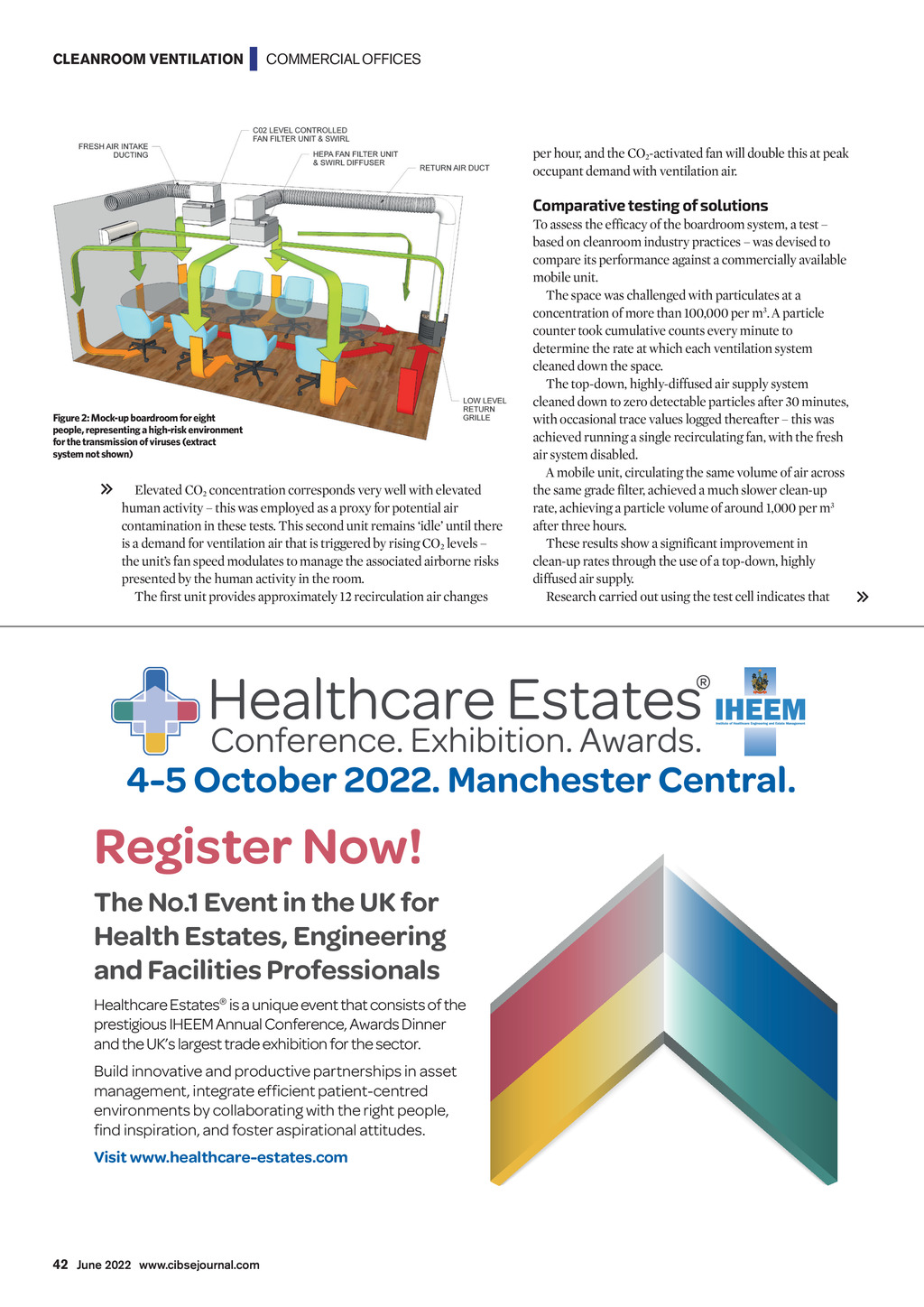 CLEANROOM VENTILATION | COMMERCIAL OFFICES per hour, and the CO2-activated fan will double this at peak occupant demand with ventilation air. Comparative testing of solutions Figure 2: Mock-up boardroom for eight people, representing a high-risk environment for the transmission of viruses (extract system not shown) Elevated CO2 concentration corresponds very well with elevated human activity this was employed as a proxy for potential air contamination in these tests. This second unit remains idle until there is a demand for ventilation air that is triggered by rising CO2 levels the units fan speed modulates to manage the associated airborne risks presented by the human activity in the room. The first unit provides approximately 12 recirculation air changes To assess the efficacy of the boardroom system, a test based on cleanroom industry practices was devised to compare its performance against a commercially available mobile unit. The space was challenged with particulates at a concentration of more than 100,000 per m3. A particle counter took cumulative counts every minute to determine the rate at which each ventilation system cleaned down the space. The top-down, highly-diffused air supply system cleaned down to zero detectable particles after 30 minutes, with occasional trace values logged thereafter this was achieved running a single recirculating fan, with the fresh air system disabled. A mobile unit, circulating the same volume of air across the same grade filter, achieved a much slower clean-up rate, achieving a particle volume of around 1,000 per m3 after three hours. These results show a significant improvement in clean-up rates through the use of a top-down, highly diffused air supply. Research carried out using the test cell indicates that 4-5 October 2022. Manchester Central. Register Now! The No.1 Event in the UK for Health Estates, Engineering and Facilities Professionals Healthcare Estates is a unique event that consists of the prestigious IHEEM Annual Conference, Awards Dinner and the UKs largest trade exhibition for the sector. Build innovative and productive partnerships in asset management, integrate efficient patient-centred environments by collaborating with the right people, find inspiration, and foster aspirational attitudes. Visit www.healthcare-estates.com 42 June 2022 www.cibsejournal.com CIBSE June 22 pp40-42, 44 Cleanroom ventilation.indd 42 27/05/2022 16:34