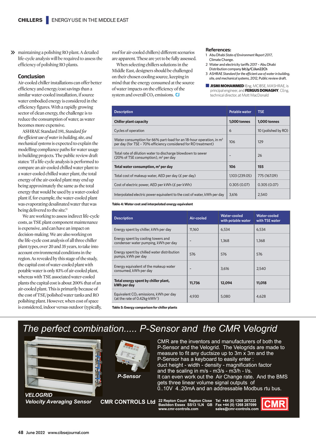 CHILLERS | ENERGY USE IN THE MIDDLE EAST maintaining a polishing RO plant. A detailed life-cycle analysis will be required to assess the efficiency of polishing RO plants. Conclusion Air-cooled chiller installations can offer better efficiency and energy/cost savings than a similar water-cooled installation, if source water embodied energy is considered in the efficiency figures. With a rapidly growing sector of clean energy, the challenge is to reduce the consumption of water, as water becomes more expensive. ASHRAE Standard 191, Standard for the efficient use of water in building, site, and mechanical systems is expected to explain the modelling compliance paths for water usage in building projects. The public review draft states: If a life-cycle analysis is performed to compare an air-cooled chilled water plant to a water-cooled chilled water plant, the total energy of the air-cooled plant may end up being approximately the same as the total energy that would be used by a water-cooled plant if, for example, the water-cooled plant was evaporating desalinated water that was being delivered to the site.3 We are working to assess indirect life-cycle costs, as TSE plant component maintenance is expensive, and can have an impact on decision-making. We are also working on the life-cycle cost analysis of all three chiller plant types, over 20 and 35 years, to take into account environmental conditions in the region. As revealed by this stage of the study, the capital cost of water-cooled plant with potable water is only 83% of air-cooled plant, whereas with TSE associated water-cooled plants the capital cost is about 200% that of an air-cooled plant. This is primarily because of the cost of TSE/polished water tanks and RO polishing plant. However, when cost of space is considered, indoor versus outdoor (typically, roof for air-cooled chillers) different scenarios are apparent. These are yet to be fully assessed. When selecting chillers solutions in the Middle East, designers should be challenged on their chosen cooling source, keeping in mind that the energy consumed at the source of water impacts on the efficiency of the system and overall CO2 emissions. CJ References: 1 Abu Dhabi State of Environment Report 2017, Climate Change. 2 Water and electricity tariffs 2017 Abu Dhabi Distribution company bit.ly/CJJun22Ch 3 ASHRAE Standard for the efficient use of water in building, site, and mechanical systems, 2012, Public review draft. JISMI MOHAMMED IEng, MCIBSE, MASHRAE, is principal engineer, and FERGUS DONAGHY, CEng, technical director, at Mott MacDonald Description Potable water TSE Chiller plant capacity 1,000 tonnes 1,000 tonnes Cycles of operation 6 10 (polished by RO) Water consumption for 66% part-load for an 18-hour operation, in m3 per day (for TSE 70% efficiency considered for RO treatment) 106 129 Total rate of dilution water to discharge blowdown to sewer (20% of TSE consumption), m3 per day 26 Total water consumption, m3 per day 106 155 Total cost of makeup water, AED per day ( per day) 1,103 (239.05) 775 (167.09) Cost of electric power, AED per kWh ( per kWh) 0.305 (0.07) 0.305 (0.07) Interpolated electric power equivalent to the cost of water, kWh per day 3,616 2,540 Table 4: Water cost and interpolated energy equivalent Description Air-cooled Water-cooled with potable water Water-cooled with TSE water Energy spent by chiller, kWh per day 11,160 6,534 6,534 Energy spent by cooling towers and condenser water pumping, kWh per day 1,368 1,368 Energy spent by chilled water distribution pumps, kWh per day 576 576 576 Energy equivalent of the makeup water consumed, kWh per day 3,616 2,540 Total energy spent by chiller plant, kWh per day 11,736 12,094 11,018 Equivalent CO2 emissions, kWh per day (at the rate of 0.42kg.kWh-1) 4,930 5,080 4,628 Table 5: Energy comparison for chiller plants 48 June 2022 www.cibsejournal.com CIBSE June 22 pp46-48 Chiller in Middle East.indd 48 27/05/2022 15:38