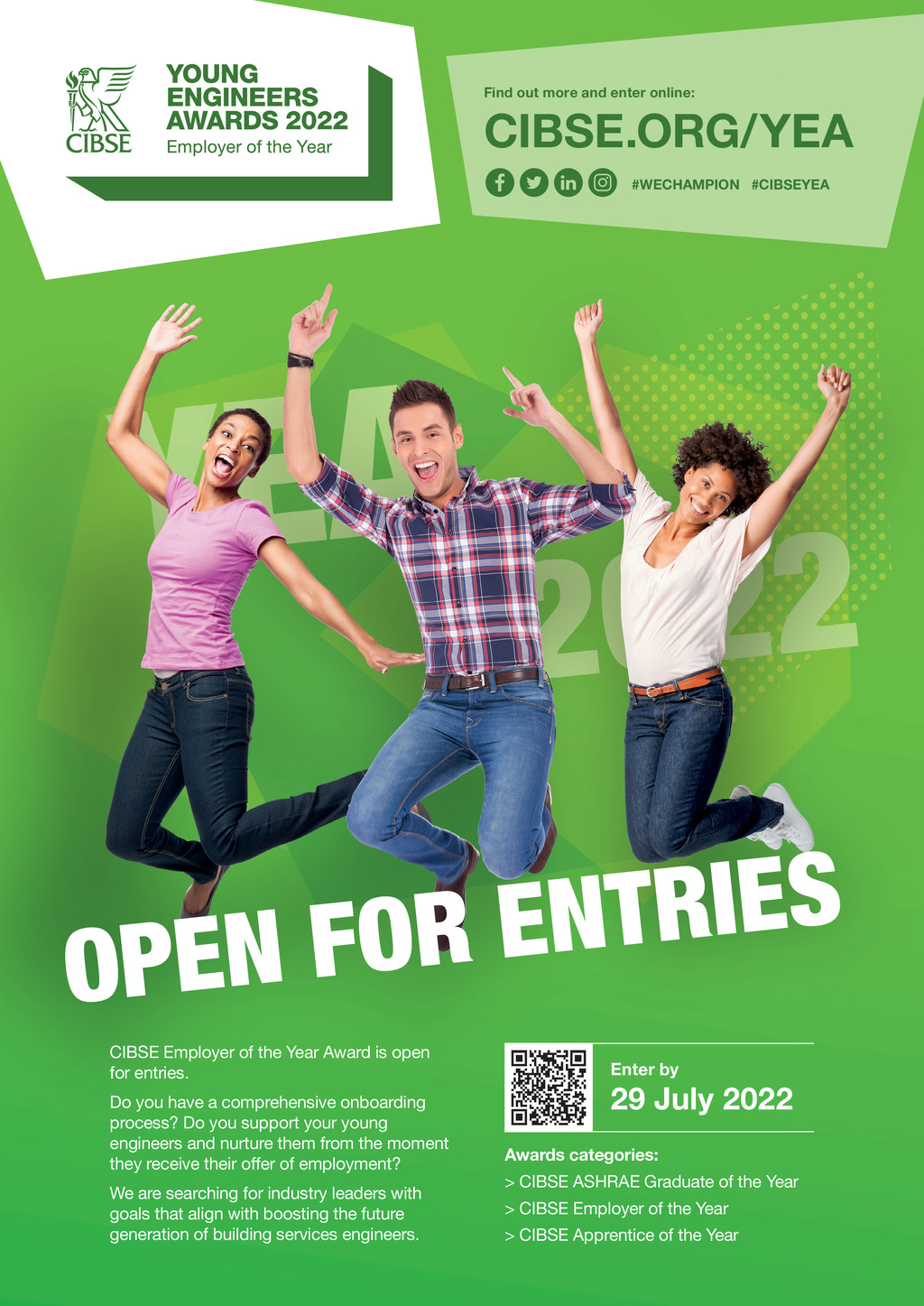 Find out more and enter online: CIBSE.ORG/YEA #WECHAMPION #CIBSEYEA S E I R T N E R O EN F OP CIBSE Employer of the Year Award is open for entries. Do you have a comprehensive onboarding process? Do you support your young engineers and nurture them from the moment [OL`YLJLP]L[OLPYVLYVMLTWSV`TLU[& We are searching for industry leaders with goals that align with boosting the future generation of building services engineers. Enter by 29 July 2022 Awards categories: > CIBSE ASHRAE Graduate of the Year > CIBSE Employer of the Year > CIBSE Apprentice of the Year 56 June 2022 www.cibsejournal.com p56.CIBSEMagJune22.indd 56 CIBR16528 YEA 2022 Employer Ad May 297x210_v1b_AW.indd 1 24/05/2022 13:17 16/05/2022 11:23