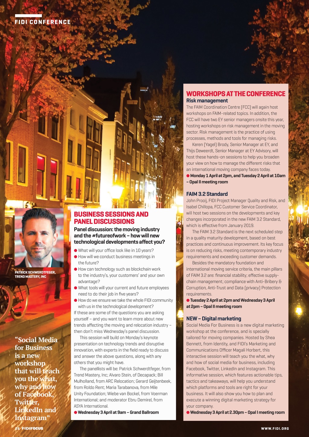 F ID I C O N FE R ENCE WORKSHOPS AT THE CONFERENCE Risk management The FAIM Coordination Centre (FCC) will again host workshops on FAIM-related topics. In addition, the FCC will have two EY senior managers onsite this year, hosting workshops on risk management in the moving sector. Risk management is the practice of using processes, methods and tools for managing risks. Keren (Yagel) Brody, Senior Manager at EY, and Thijs Deweerdt, Senior Manager at EY Advisory, will host these hands-on sessions to help you broaden your view on how to manage the different risks that an international moving company faces today. Monday 1 April at 2pm, and Tuesday 2 April at 10am Opal II meeting room FAIM 3.2 Standard BUSINESS SESSIONS AND PANELDISCUSSIONS Panel discussion: the moving industry and the #futureofwork how will new technological developments affect you? What will your office look like in 10 years? How will we conduct business meetings in the future? PATRICK SCHWERDTFEGER, TREND MASTERY, INC Social Media for Business is a new workshop that will teach you the what, why and how of Facebook, Twitter, LinkedIn and Instagram How can technology such as blockchain work to the industrys, your customers and your own advantage? What tools will your current and future employees need to do their job in five years? How do we ensure we take the whole FIDI community with us in the technological development? If these are some of the questions you are asking yourself and you want to learn more about new trends affecting the moving and relocation industry then dontmiss Wednesdays panel discussion. This session will build on Mondays keynote presentation on technology trends and disruptive innovation, with experts in the field ready to discuss and answer the above questions, along with any others that you might have. The panellists will be: Patrick Schwerdtfeger, from Trend Mastery, Inc; Alvaro Stein, of Decapack; Bill Mulholland, from ARC Relocation; Gerard Geijtenbeek, from Roldo Rent; Maria Tarabanova, from Mile Unity Foundation; Wiebe van Bockel, from Voerman International; and moderator Ebru Demirel, from ASYA International. Wednesday 3 April at 9am Grand Ballroom 26 FF289FebMar19 pp24-29 Conference news MC new.indd 26 John Prooij, FIDI Project Manager Quality and Risk, and Isabel Chillopa, FCC Customer Service Coordinator, will host two sessions on the developments and key changes incorporated in the new FAIM 3.2 Standard, which is effective from January 2019. The FAIM 3.2 Standard is the next scheduled step in a quality maturity development, based on best practices and continuous improvement. Its key focus is on reducing risks, meeting contemporary industry requirements and exceeding customer demands. Besides the mandatory foundation and international moving service criteria, the main pillars of FAIM 3.2 are: financial stability; effective supplychain management; compliance with Anti-Bribery & Corruption, Anti-Trust and Data (privacy) Protection requirements. Tuesday 2 April at 2pm and Wednesday 3 April at 2pm Opal II meeting room NEW Digital marketing Social Media For Business is a new digital marketing workshop at the conference, and is specially tailored for moving companies. Hosted by Shea Bennett, from Identity, and FIDIs Marketing and Communications Officer Magali Horbert, this interactive session will teach you the what, why and how of social media for business, including Facebook, Twitter, LinkedIn and Instagram. This informative session, which features actionable tips, tactics and takeaways, will help you understand which platforms and tools are right for your business. It will also show you how to plan and execute a winning digital marketing strategy for your company. Wednesday 3 April at 2.30pm Opal I meeting room WWW. F I D I . OR G 24/01/2019 13:34