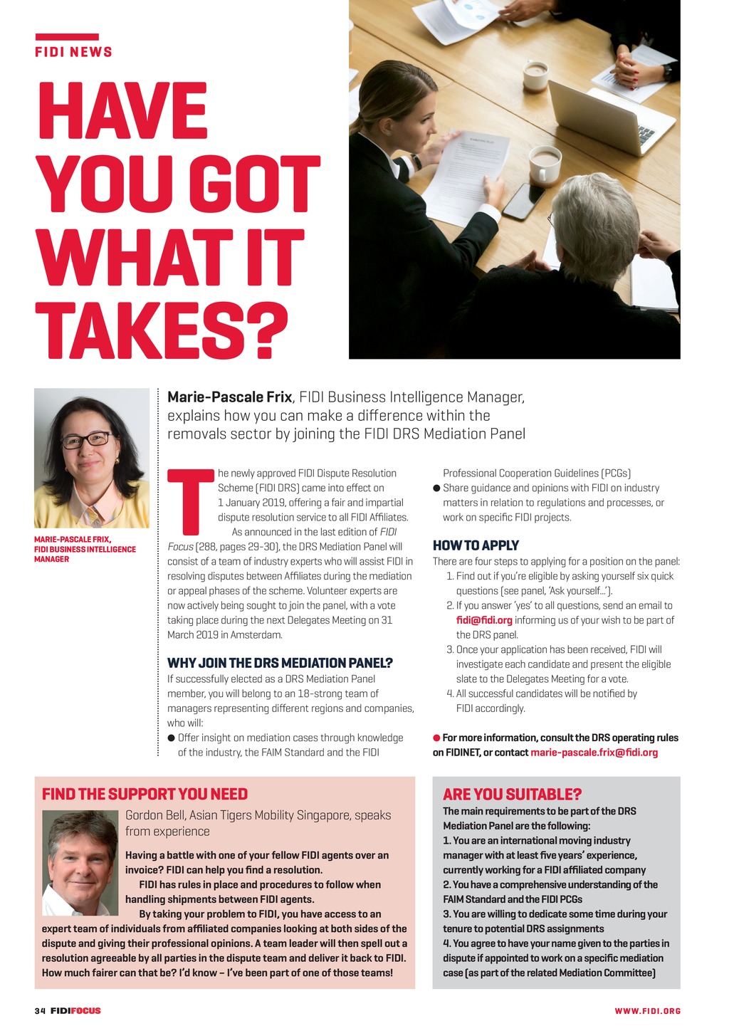 F ID I N E WS HAVE YOU GOT WHAT IT TAKES? Marie-Pascale Frix, FIDI Business Intelligence Manager, explains how you can make a difference within the removals sector by joining the FIDI DRS Mediation Panel MARIE-PASCALE FRIX, FIDI BUSINESS INTELLIGENCE MANAGER T he newly approved FIDI Dispute Resolution Scheme (FIDI DRS) came into effect on 1 January 2019, offering a fair and impartial dispute resolution service to all FIDI Affiliates. As announced in the last edition of FIDI Focus (288, pages 29-30), the DRS Mediation Panel will consist of a team of industry experts who will assist FIDI in resolving disputes between Affiliates during the mediation or appeal phases of the scheme. Volunteer experts are now actively being sought to join the panel, with a vote taking place during the next Delegates Meeting on 31 March 2019 in Amsterdam. WHY JOIN THE DRS MEDIATION PANEL? If successfully elected as a DRS Mediation Panel member, you will belong to an 18-strong team of managers representing different regions and companies, who will: Offer insight on mediation cases through knowledge of the industry, the FAIM Standard and the FIDI FIND THE SUPPORT YOU NEED Gordon Bell, Asian Tigers Mobility Singapore, speaks from experience Having a battle with one of your fellow FIDI agents over an invoice? FIDI can help you find a resolution. FIDI has rules in place and procedures to follow when handling shipments between FIDI agents. By taking your problem to FIDI, you have access to an expert team of individuals from affiliated companies looking at both sides of the dispute and giving their professional opinions. A team leader will then spell out a resolution agreeable by all parties in the dispute team and deliver it back to FIDI. How much fairer can that be? Id know Ive been part of one of those teams! 34 FF289FebMar19 pp34-35 Dispute Resolution.indd 34 Professional Cooperation Guidelines (PCGs) Share guidance and opinions with FIDI on industry matters in relation to regulations and processes, or work on specific FIDI projects. HOW TO APPLY There are four steps to applying for a position on the panel: 1. Find out if youre eligible by asking yourself six quick questions (see panel, Ask yourself...). 2. If you answer yes to all questions, send an email to fidi@fidi.org informing us of your wish to be part of the DRS panel. 3. Once your application has been received, FIDI will investigate each candidate and present the eligible slate to the Delegates Meeting for a vote. 4. All successful candidates will be notified by FIDI accordingly. For more information, consult the DRS operating rules on FIDINET, or contact marie-pascale.frix@fidi.org ARE YOU SUITABLE? The main requirements to be part of the DRS Mediation Panel are the following: 1. You are an international moving industry manager with at least five years experience, currently working for a FIDI affiliated company 2. You have a comprehensive understanding of the FAIM Standard and the FIDI PCGs 3. You are willing to dedicate some time during your tenure to potential DRS assignments 4. You agree to have your name given to the parties in dispute if appointed to work on a specific mediation case (as part of the related Mediation Committee) WWW. F I D I . OR G 23/01/2019 16:35