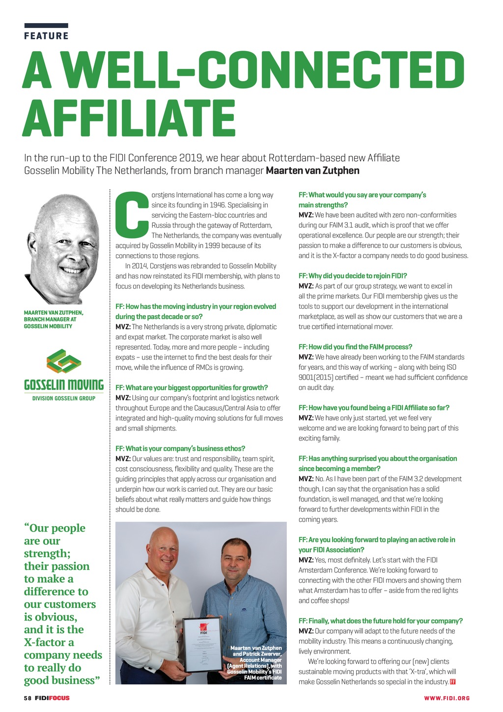 F E AT U R E A WELL-CONNECTED AFFILIATE In the run-up to the FIDI Conference 2019, we hear about Rotterdam-based new Affiliate GosselinMobility The Netherlands, from branch manager Maarten van Zutphen C orstjens International has come a long way since its founding in 1946. Specialising in servicing the Eastern-bloc countries and Russia through the gateway of Rotterdam, The Netherlands, the company was eventually acquired by Gosselin Mobility in 1999 because of its connections to those regions. In 2014, Corstjens was rebranded to Gosselin Mobility and has now reinstated its FIDI membership, with plans to focus on developing its Netherlands business. MAARTEN VAN ZUTPHEN, BRANCH MANAGER AT GOSSELIN MOBILITY FF: How has the moving industry in your region evolved during the past decade or so? MVZ: The Netherlands is a very strong private, diplomatic and expat market. The corporate market is also well represented. Today, more and more people including expats use the internet to find the best deals for their move, while the influence of RMCs is growing. FF: What are your biggest opportunities for growth? MVZ: Using our companys footprint and logistics network throughout Europe and the Caucasus/Central Asia to offer integrated and high-quality moving solutions for full moves and small shipments. FF: What is your companys business ethos? MVZ: Our values are: trust and responsibility, team spirit, cost consciousness, flexibility and quality. These are the guiding principles that apply across our organisation and underpin how our work is carried out. They are our basic beliefs about what really matters and guide how things should be done. Our people are our strength; their passion to make a difference to our customers is obvious, and it is the X-factor a company needs to really do good business 58 FF289FebMar19 pp58-59 New Affiliate 2.indd 58 FF: What would you say are your companys mainstrengths? MVZ: We have been audited with zero non-conformities during our FAIM 3.1 audit, which is proof that we offer operational excellence. Our people are our strength; their passion to make a difference to our customers is obvious, and it is the X-factor a company needs to do good business. FF: Why did you decide to rejoin FIDI? MVZ: As part of our group strategy, we want to excel in all the prime markets. Our FIDI membership gives us the tools to support our development in the international marketplace, as well as show our customers that we are a true certified international mover. FF: How did you find the FAIM process? MVZ: We have already been working to the FAIM standards for years, and this way of working along with being ISO 9001(2015) certified meant we had sufficient confidence on audit day. FF: How have you found being a FIDI Affiliate so far? MVZ: We have only just started, yet we feel very welcomeand we are looking forward to being part of this exciting family. FF: Has anything surprised you about the organisation since becoming a member? MVZ: No. As I have been part of the FAIM 3.2 development though, I can say that the organisation has a solid foundation, is well managed, and that were looking forwardto further developments within FIDI in the comingyears. FF: Are you looking forward to playing an active role in your FIDI Association? MVZ: Yes, most definitely. Lets start with the FIDI Amsterdam Conference. Were looking forward to connecting with the other FIDI movers and showing them what Amsterdam has to offer aside from the red lights and coffee shops! Maarten van Zutphen and Patrick Zwerver, Account Manager (Agent Relations), with Gosselin Mobilitys FIDI FAIM certificate FF: Finally, what does the future hold for your company? MVZ: Our company will adapt to the future needs of the mobility industry. This means a continuously changing, livelyenvironment. Were looking forward to offering our (new) clients sustainable moving products with that X-tra, which will make Gosselin Netherlands so special in the industry. WWW. F I D I . OR G 23/01/2019 16:49