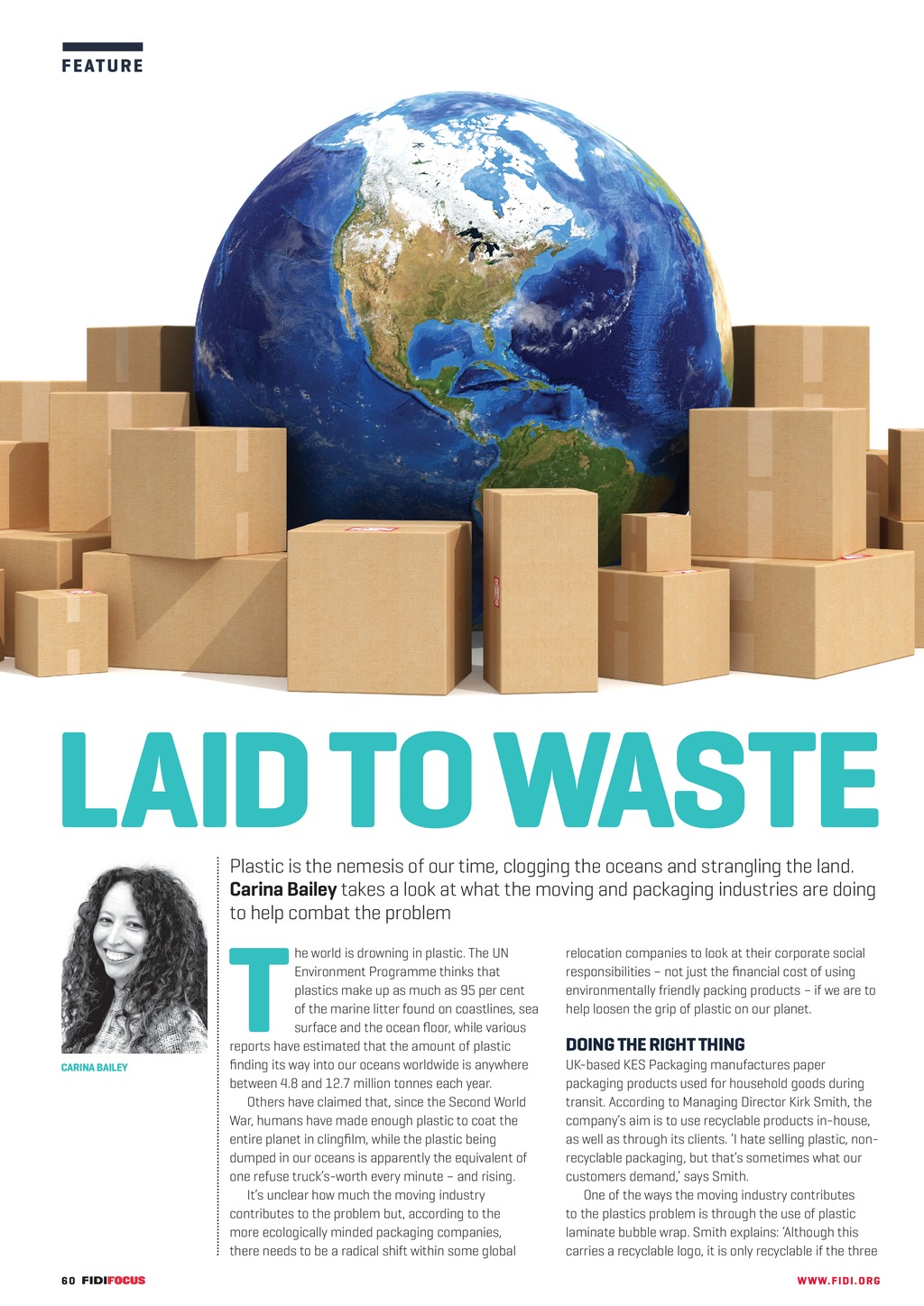 F E AT U RE LAID TO WASTE Plastic is the nemesis of our time, clogging the oceans and strangling the land. Carina Bailey takes a look at what the moving and packaging industries are doing to help combat the problem CARINA BAILEY 60 FF289FebMar19 pp60-62 Environment.indd 60 T he world is drowning in plastic. The UN Environment Programme thinks that plastics make up as much as 95 per cent of the marine litter found on coastlines, sea surface and the ocean floor, while various reports have estimated that the amount of plastic finding its way into our oceans worldwide is anywhere between 4.8 and 12.7 million tonnes each year. Others have claimed that, since the Second World War, humans have made enough plastic to coat the entire planet in clingfilm, while the plastic being dumped in our oceans is apparently the equivalent of one refuse trucks-worth every minute and rising. Its unclear how much the moving industry contributes to the problem but, according to the more ecologically minded packaging companies, there needs to be a radical shift within some global relocation companies to look at their corporate social responsibilities not just the financial cost of using environmentally friendly packing products if we are to help loosen the grip of plastic on our planet. DOING THE RIGHT THING UK-based KES Packaging manufactures paper packaging products used for household goods during transit. According to Managing Director Kirk Smith, the companys aim is to use recyclable products in-house, as well as through its clients. I hate selling plastic, nonrecyclable packaging, but thats sometimes what our customers demand, says Smith. One of the ways the moving industry contributes to the plastics problem is through the use of plastic laminate bubble wrap. Smith explains: Although this carries a recyclable logo, it is only recyclable if the three WWW. F I D I . OR G 23/01/2019 16:51