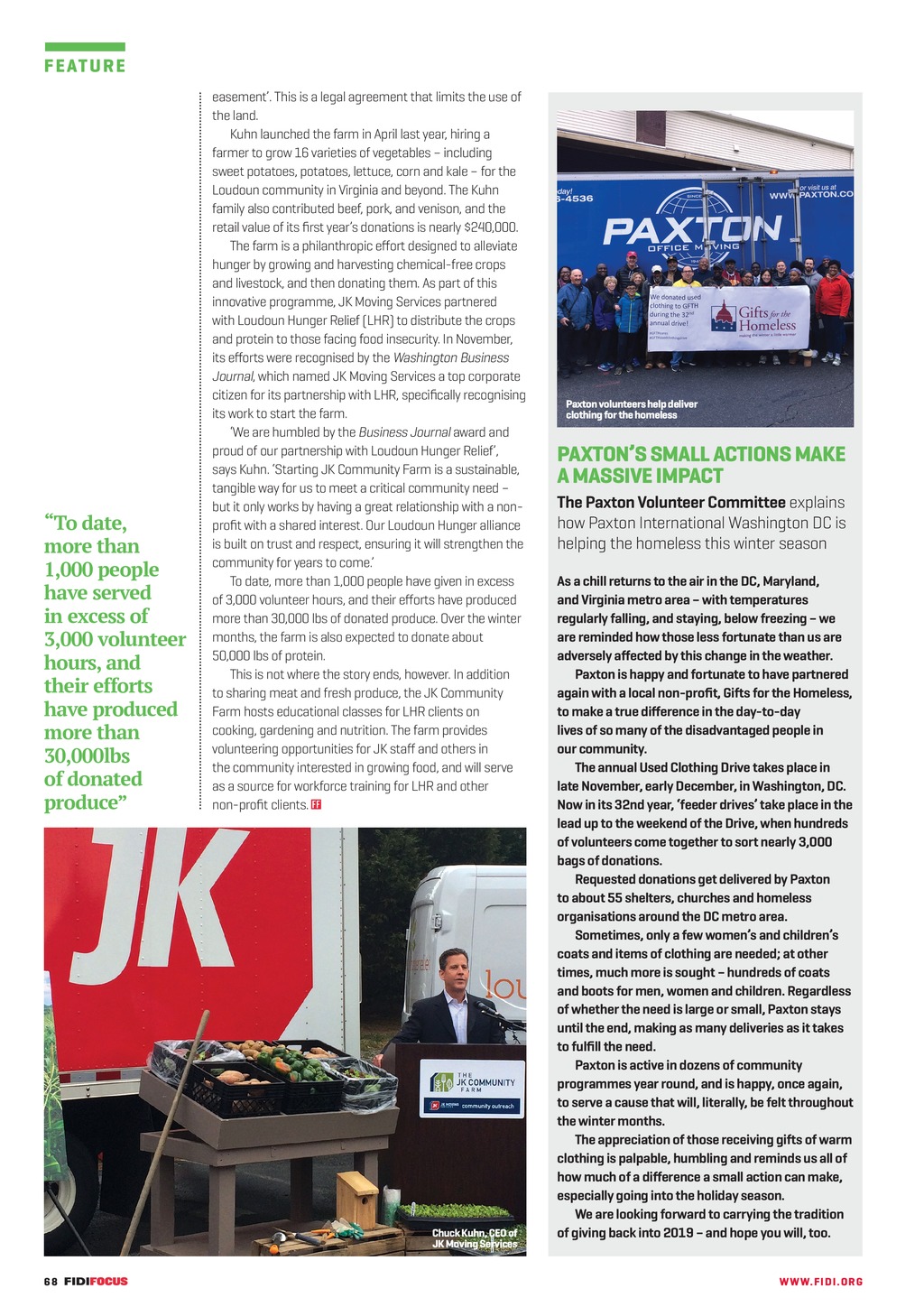 F E AT U RE To date, more than 1,000 people have served in excess of 3,000 volunteer hours, and their efforts have produced more than 30,000lbs of donated produce easement. This is a legal agreement that limits the use of the land. Kuhn launched the farm in April last year, hiring a farmer to grow 16 varieties of vegetables including sweet potatoes, potatoes, lettuce, corn and kale for the Loudoun community in Virginia and beyond. The Kuhn family also contributed beef, pork, and venison, and the retail value of its first years donations is nearly $240,000. The farm is a philanthropic effort designed to alleviate hunger by growing and harvesting chemical-free crops and livestock, and then donating them. As part of this innovative programme, JK Moving Services partnered with Loudoun Hunger Relief (LHR) to distribute the crops and protein to those facing food insecurity. In November, its efforts were recognised by the Washington Business Journal, which named JK Moving Services a top corporate citizen for its partnership with LHR, specifically recognising its work to start the farm. We are humbled by the Business Journal award and proud of our partnership with Loudoun Hunger Relief, says Kuhn. Starting JK Community Farm is a sustainable, tangible way for us to meet a critical community need but it only works by having a great relationship with a nonprofit with a shared interest. Our Loudoun Hunger alliance is built on trust and respect, ensuring it will strengthen the community for years to come. To date, more than 1,000 people have given in excess of 3,000 volunteer hours, and their efforts have produced more than 30,000 lbs of donated produce. Over the winter months, the farm is also expected to donate about 50,000 lbs of protein. This is not where the story ends, however. In addition tosharing meat and fresh produce, the JK Community Farm hosts educational classes for LHR clients on cooking,gardening and nutrition. The farm provides volunteering opportunities for JK staff and others in thecommunity interested in growing food, and will serve as a source for workforce training for LHR and other non-profit clients. Chuck Kuhn, CEO of JK Moving Services 68 FF289FebMar19 pp66-69 Community Work.indd 68 Paxton volunteers help deliver clothing for the homeless PAXTONS SMALL ACTIONS MAKE A MASSIVE IMPACT The Paxton Volunteer Committee explains how Paxton International Washington DC is helping the homeless this winter season As a chill returns to the air in the DC, Maryland, and Virginia metro area with temperatures regularly falling, and staying, below freezing we are reminded how those less fortunate than us are adversely affected by this change in the weather. Paxton is happy and fortunate to have partnered again with a local non-profit, Gifts for the Homeless, to make a true difference in the day-to-day lives of so many of the disadvantaged people in ourcommunity. The annual Used Clothing Drive takes place in late November, early December, in Washington, DC. Now in its 32nd year, feeder drives take place in the lead up to the weekend of the Drive, when hundreds of volunteers come together to sort nearly 3,000 bags of donations. Requested donations get delivered by Paxton to about 55 shelters, churches and homeless organisations around the DC metro area. Sometimes, only a few womens and childrens coats and items of clothing are needed; at other times, much more is sought hundreds of coats and boots for men, women and children. Regardless of whether the need is large or small, Paxton stays until the end, making as many deliveries as it takes to fulfill the need. Paxton is active in dozens of community programmes year round, and is happy, once again, to serve a cause that will, literally, be felt throughout the winter months. The appreciation of those receiving gifts of warm clothing is palpable, humbling and reminds us all of how much of a difference a small action can make, especially going into the holiday season. We are looking forward to carrying the tradition of giving back into 2019 and hope you will, too. WWW. F I D I . OR G 23/01/2019 16:54