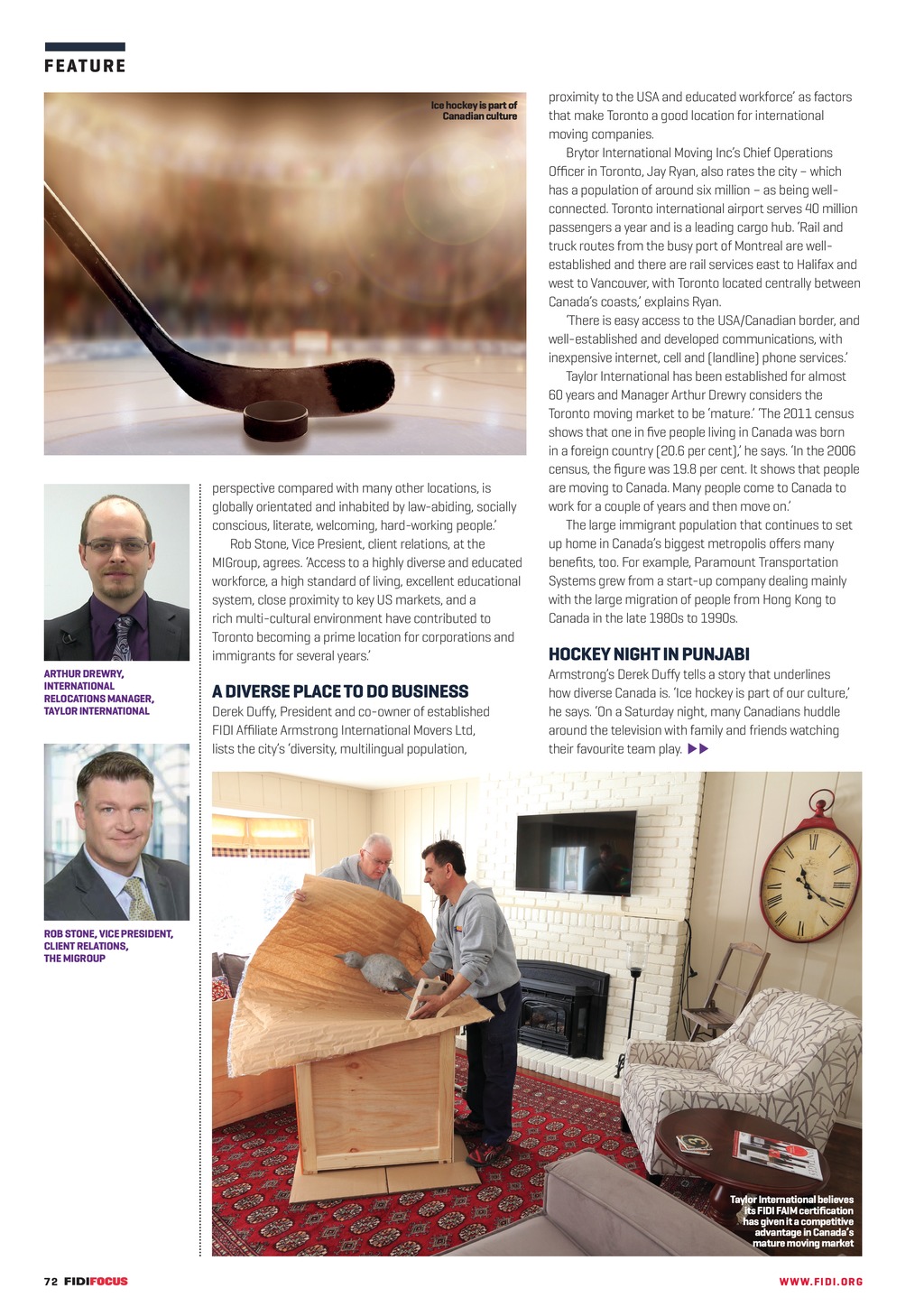F E AT U RE Ice hockey is part of Canadian culture perspective compared with many other locations, is globally orientated and inhabited by law-abiding, socially conscious, literate, welcoming, hard-working people. Rob Stone, Vice Presient, client relations, at the MIGroup, agrees. Access to a highly diverse and educated workforce, a high standard of living, excellent educational system, close proximity to key US markets, and a rich multi-cultural environment have contributed to Toronto becoming a prime location for corporations and immigrants for several years. ARTHUR DREWRY, INTERNATIONAL RELOCATIONS MANAGER, TAYLOR INTERNATIONAL A DIVERSE PLACE TO DO BUSINESS Derek Duffy, President and co-owner of established FIDIAffiliate Armstrong International Movers Ltd, liststhecitys diversity, multilingual population, proximityto the USA and educated workforce as factors that make Toronto a good location for international moving companies. Brytor International Moving Incs Chief Operations Officer in Toronto, Jay Ryan, also rates the city which has a population of around six million as being wellconnected. Toronto international airport serves 40 million passengers a year and is a leading cargo hub. Rail and truck routes from the busy port of Montreal are wellestablished and there are rail services east to Halifax and west to Vancouver, with Toronto located centrally between Canadas coasts, explains Ryan. There is easy access to the USA/Canadian border, and well-established and developed communications, with inexpensive internet, cell and (landline) phone services. Taylor International has been established for almost 60 years and Manager Arthur Drewry considers the Toronto moving market to be mature. The 2011 census shows that one in five people living in Canada was born in a foreign country (20.6 per cent), he says. In the 2006 census, the figure was 19.8 per cent. It shows that people are moving to Canada. Many people come to Canada to work for a couple of years and then move on. The large immigrant population that continues to set up home in Canadas biggest metropolis offers many benefits, too. For example, Paramount Transportation Systems grew from a start-up company dealing mainly with the large migration of people from Hong Kong to Canada in the late 1980s to 1990s. HOCKEY NIGHT IN PUNJABI Armstrongs Derek Duffy tells a story that underlines how diverse Canada is. Ice hockey is part of our culture, he says. On a Saturday night, many Canadians huddle around the television with family and friends watching their favourite team play. ROB STONE, VICE PRESIDENT, CLIENT RELATIONS, THE MIGROUP Taylor International believes its FIDI FAIM certification has given it a competitive advantage in Canadas mature moving market 72 FF289FebMar19 pp70-79 City on the Move Toronto.indd 72 WWW. F I D I . OR G 23/01/2019 16:56 AGS_