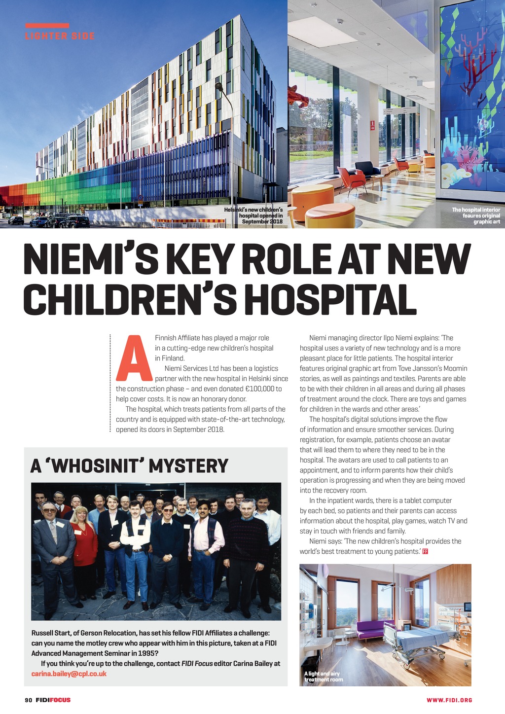 L I G H T E R S I DE Helsinkis new childrens hospital opened in September 2018 The hospital interior feaures original graphic art NIEMIS KEY ROLE AT NEW CHILDRENS HOSPITAL A Finnish Affiliate has played a major role in a cutting-edge new childrens hospital in Finland. Niemi Services Ltd has been a logistics partner with the new hospital in Helsinki since the construction phase and even donated 100,000 to help cover costs. It is now an honorary donor. The hospital, which treats patients from all parts of the country and is equipped with state-of-the-art technology, opened its doors in September 2018. A WHOSINIT MYSTERY Russell Start, of Gerson Relocation, has set his fellow FIDI Affiliates a challenge: can you name the motley crew who appear with him in this picture, taken at a FIDI Advanced Management Seminar in 1995? If you think youre up to the challenge, contact FIDI Focus editor Carina Bailey at carina.bailey@cpl.co.uk 90 FF289FebMar19 pp90-92 Lighter Side.indd 90 Niemi managing director Ilpo Niemi explains: The hospital uses a variety of new technology and is a more pleasant place for little patients. The hospital interior features original graphic art from Tove Janssons Moomin stories, as well as paintings and textiles. Parents are able to be with their children in all areas and during all phases of treatment around the clock. There are toys and games for children in the wards and other areas. The hospitals digital solutions improve the flow of information and ensure smoother services. During registration, for example, patients choose an avatar that will lead them to where they need to be in the hospital. The avatars are used to call patients to an appointment, and to inform parents how their childs operation is progressing and when they are being moved into the recovery room. In the inpatient wards, there is a tablet computer by each bed, so patients and their parents can access information about the hospital, play games, watch TV and stay in touch with friends and family. Niemi says: The new childrens hospital provides the worlds best treatment to young patients. A light and airy treatment room WWW. F I D I . OR G 23/01/2019 17:03