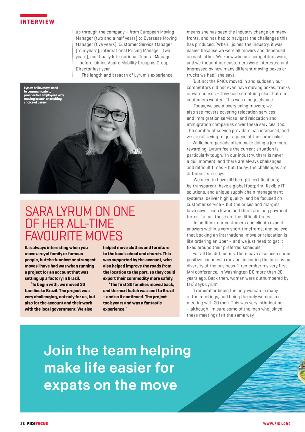 I N T E RV I E W up through the company from European Moving Manager (two and a half years) to Overseas Moving Manager (five years), Customer Service Manager (four years), International Pricing Manager (two years), and finally International General Manager before joining Aspire Mobility Group as Group Director last year. The length and breadth of Lyrums experience Lyrum believes we need to communicate to prospective employees why moving is such an exciting choice of career SARA LYRUM ON ONE OF HER ALL-TIME FAVOURITE MOVES It is always interesting when you move a royal family or famous people, but the funniest or strangest moves I have had was when running a project for an account that was setting up a factory in Brazil. To begin with, we moved 30 families to Brazil. The project was very challenging, not only for us, but also for the account and their work with the local government. We also 26 FF296 AprMay20 pp24-27 Sara Interview.indd 26 helped move clothes and furniture to the local school and church. This was supported by the account, who also helped improve the roads from the location to the port, so they could export their commodity more safely. The first 30 families moved back, and the next batch was sent to Brazil and so it continued. The project took years and was a fantastic experience. means she has seen the industry change on many fronts, and has had to navigate the challenges this has produced. When I joined the industry, it was easier, because we were all movers and depended on each other. We knew who our competitors were, and we thought our customers were interested and impressed by how many different moving boxes or trucks we had, she says. But no; the RMCs moved in and suddenly our competitors did not even have moving boxes, trucks or warehouses they had something else that our customers wanted. This was a huge change. Today, we see movers being movers; we also see movers covering relocation services and immigration services; and relocation and immigration companies cover these services, too. The number of service providers has increased, and we are all trying to get a piece of the same cake. While hard periods often make doing a job more rewarding, Lyrum feels the current situation is particularly tough. In our industry, there is never a dull moment, and there are always challenges and difficult times but, today, the challenges are different, she says. We need to have all the right certifications; be transparent; have a global footprint, flexible IT solutions, and unique supply chain management systems; deliver high quality; and be focused on customer service but the prices and margins have never been lower, and there are long payment terms. To me, these are the difficult times. In addition, our customers and clients expect answers within a very short timeframe, and believe that booking an international move or relocation is like ordering an Uber and we just need to get it fixed around their preferred schedule. For all the difficulties, there have also been some positive changes in moving, including the increasing diversity of the business. I remember my very first IAM conference, in Washington DC more than 20 years ago. Back then, women were outnumbered by far, says Lyrum. I remember being the only woman in many of the meetings, and being the only woman in a meeting with 20 men. This was very intimidating although Im sure some of the men who joined these meetings felt the same way. WWW. F I D I . OR G 31/03/2020 08:43