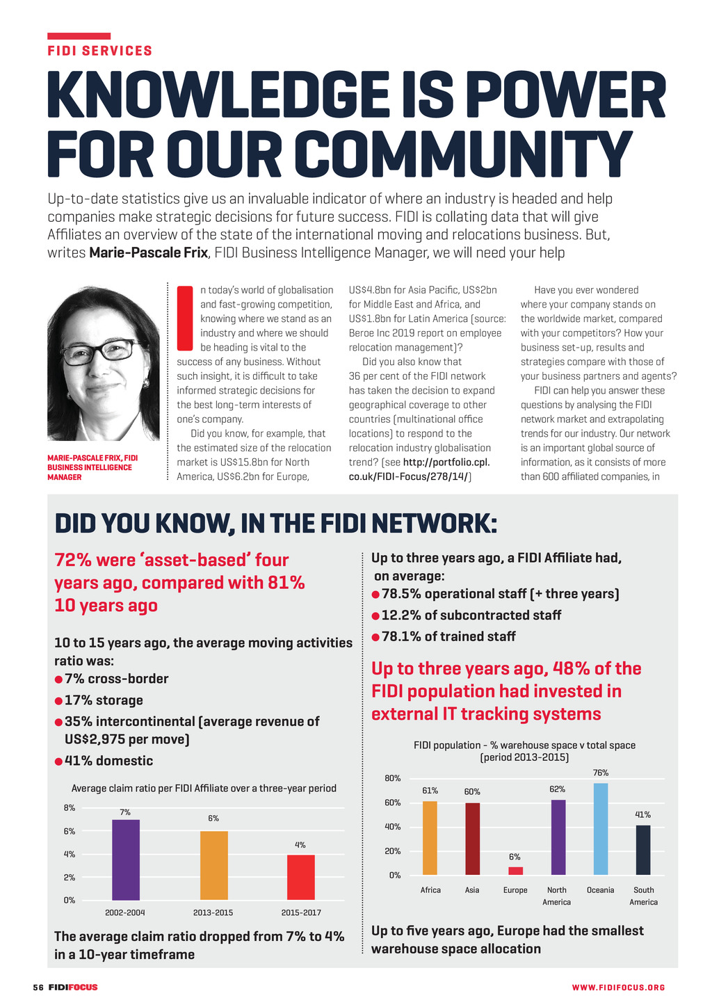 F I D I S E RV ICES KNOWLEDGE IS POWER FOR OUR COMMUNITY Up-to-date statistics give us an invaluable indicator of where an industry is headed and help companies make strategic decisions for future success. FIDI is collating data that will give Affiliates an overview of the state of the international moving and relocations business. But, writes Marie-Pascale Frix, FIDI Business Intelligence Manager, we will need your help I MARIE-PASCALE FRIX, FIDI BUSINESS INTELLIGENCE MANAGER n todays world of globalisation and fast-growing competition, knowing where we stand as an industry and where we should be heading is vital to the success of any business. Without such insight, it is difficult to take informed strategic decisions for the best long-term interests of ones company. Did you know, for example, that the estimated size of the relocation market is US$15.8bn for North America, US$6.2bn for Europe, US$4.8bn for Asia Pacific, US$2bn for Middle East and Africa, and US$1.8bn for Latin America (source: Beroe Inc 2019 report on employee relocation management)? Did you also know that 36 per cent of the FIDI network has taken the decision to expand geographical coverage to other countries (multinational office locations) to respond to the relocation industry globalisation trend? (see http://portfolio.cpl. co.uk/FIDI-Focus/278/14/) Have you ever wondered where your company stands on the worldwide market, compared with your competitors? How your business set-up, results and strategies compare with those of your business partners and agents? FIDI can help you answer these questions by analysing the FIDI network market and extrapolating trends for our industry. Our network is an important global source of information, as it consists of more than 600 affiliated companies, in DID YOU KNOW, IN THE FIDI NETWORK: 72% were asset-based four years ago, compared with 81% 10 years ago 10 to 15 years ago, the average moving activities ratio was: l 7% cross-border l 17% storage l 35% intercontinental (average revenue of US$2,975 per move) l 41% domestic Average claim ratio per FIDI Affiliate over a three-year period 8% 7% Up to three years ago, a FIDI Affiliate had, on average: l 78.5% operational staff (+ three years) l 12.2% of subcontracted staff l 78.1% of trained staff Up to three years ago, 48% of the FIDI population had invested in external IT tracking systems FIDI population - % warehouse space v total space (period 2013-2015) 76% 80% 61% 62% 60% 60% 41% 6% 40% 6% 4% 4% 20% 6% 0% 2% Africa 0% 2002-2004 2013-2015 FF296 AprMay20 pp56-57 FIDI Services.indd 56 Europe North America Oceania South America 2015-2017 The average claim ratio dropped from 7% to 4% in a 10-year timeframe 56 Asia Up to five years ago, Europe had the smallest warehouse space allocation WW W. F I D I FOC U S . OR G 31/03/2020 08:58