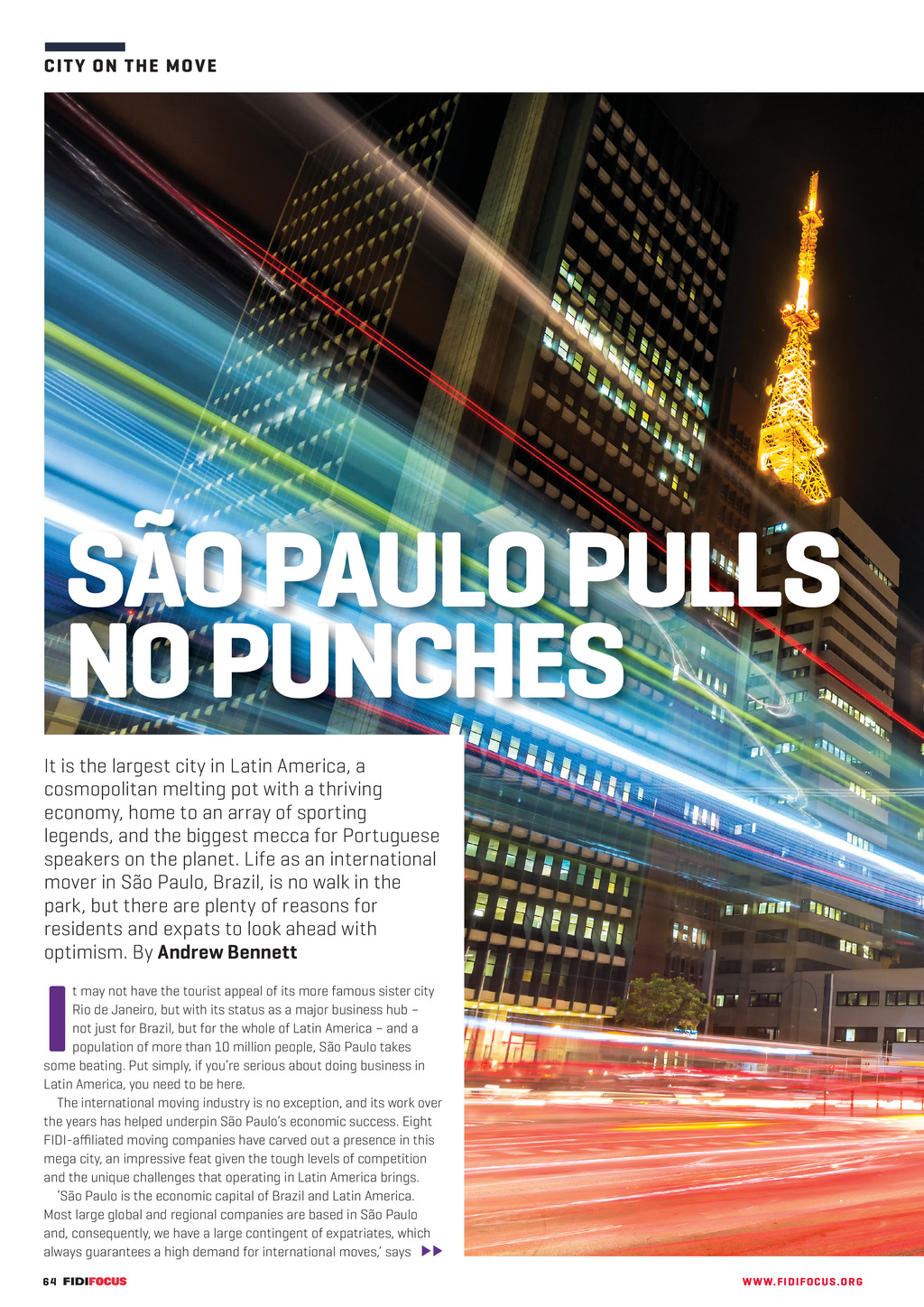 CI T Y O N T H E MOVE SO PAULO PULLS NO PUNCHES It is the largest city in Latin America, a cosmopolitan melting pot with a thriving economy, home to an array of sporting legends, and the biggest mecca for Portuguese speakers on the planet. Life as an international mover in So Paulo, Brazil, is no walk in the park , but there are plenty of reasons for residents and expats to look ahead with optimism. By Andrew Bennett I t may not have the tourist appeal of its more famous sister city Rio de Janeiro, but with its status as a major business hub not just for Brazil, but for the whole of Latin America and a population of more than 10 million people, So Paulo takes some beating. Put simply, if youre serious about doing business in Latin America, you need to be here. The international moving industry is no exception, and its work over the years has helped underpin So Paulos economic success. Eight FIDI-affiliated moving companies have carved out a presence in this mega city, an impressive feat given the tough levels of competition and the unique challenges that operating in Latin America brings. So Paulo is the economic capital of Brazil and Latin America. Most large global and regional companies are based in So Paulo and, consequently, we have a large contingent of expatriates, which always guarantees a high demand for international moves, says 64 FF296 AprMay20 pp64-75 Sao Paolo.indd 64 WW W. F I D I FOC U S . OR G 31/03/2020 09:02