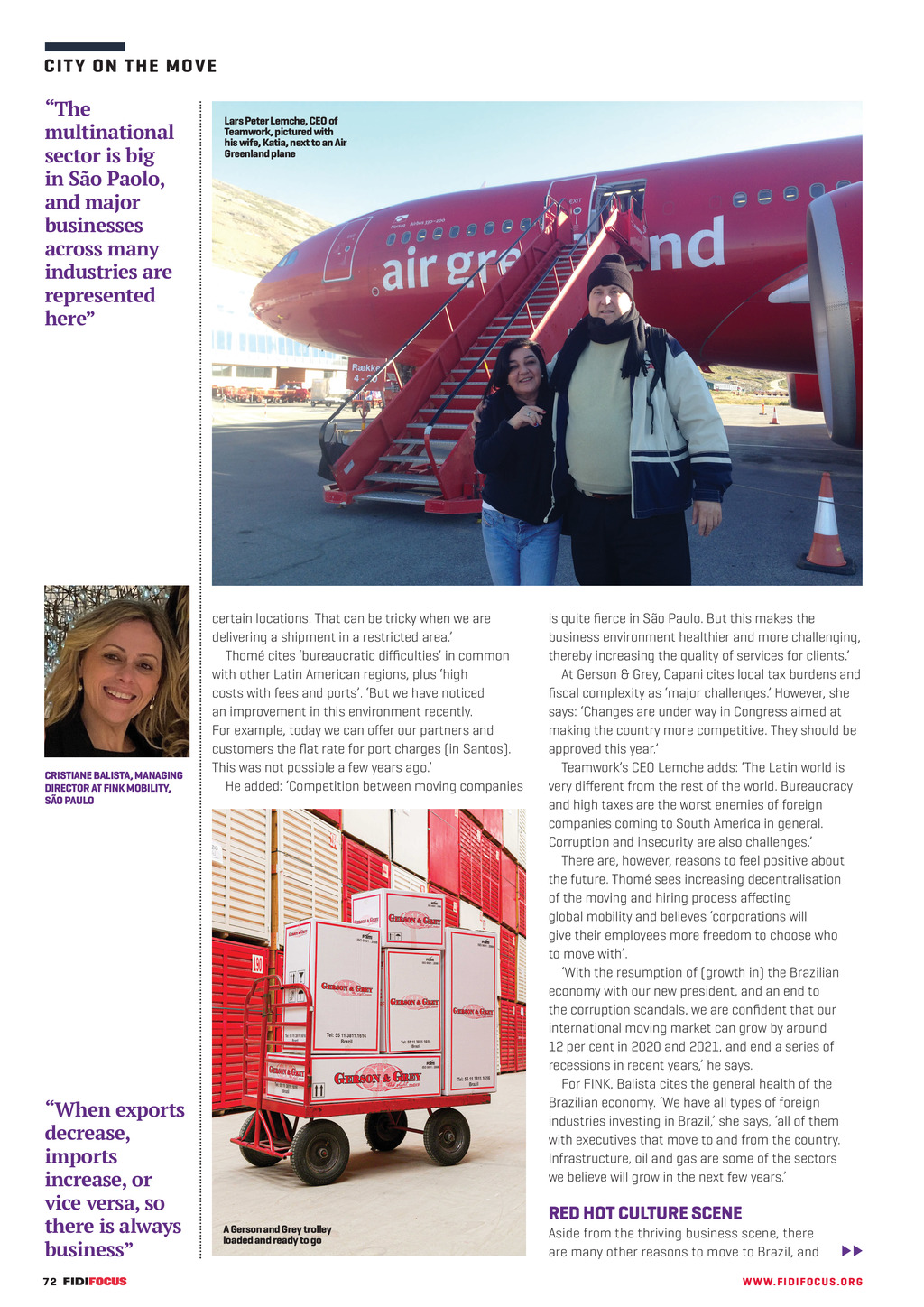 CI T Y O N T H E MOVE The multinational sector is big in So Paolo, and major businesses across many industries are represented here CRISTIANE BALISTA, MANAGING DIRECTOR AT FINK MOBILITY, SO PAULO When exports decrease, imports increase, or vice versa, so there is always business 72 FF296 AprMay20 pp64-75 Sao Paolo.indd 72 Lars Peter Lemche, CEO of Teamwork, pictured with his wife, Katia, next to an Air Greenland plane certain locations. That can be tricky when we are delivering a shipment in a restricted area. Thom cites bureaucratic difficulties in common with other Latin American regions, plus high costs with fees and ports. But we have noticed an improvement in this environment recently. For example, today we can offer our partners and customers the flat rate for port charges (in Santos). This was not possible a few years ago. He added: Competition between moving companies A Gerson and Grey trolley loaded and ready to go is quite fierce in So Paulo. But this makes the business environment healthier and more challenging, thereby increasing the quality of services for clients. At Gerson & Grey, Capani cites local tax burdens and fiscal complexity as major challenges. However, she says: Changes are under way in Congress aimed at making the country more competitive. They should be approved this year. Teamworks CEO Lemche adds: The Latin world is very different from the rest of the world. Bureaucracy and high taxes are the worst enemies of foreign companies coming to South America in general. Corruption and insecurity are also challenges. There are, however, reasons to feel positive about the future. Thom sees increasing decentralisation of the moving and hiring process affecting global mobility and believes corporations will give their employees more freedom to choose who to move with. With the resumption of (growth in) the Brazilian economy with our new president, and an end to the corruption scandals, we are confident that our international moving market can grow by around 12 per cent in 2020 and 2021, and end a series of recessions in recent years, he says. For FINK, Balista cites the general health of the Brazilian economy. We have all types of foreign industries investing in Brazil, she says, all of them with executives that move to and from the country. Infrastructure, oil and gas are some of the sectors we believe will grow in the next few years. RED HOT CULTURE SCENE Aside from the thriving business scene, there are many other reasons to move to Brazil, and WW W. F I D I FOC U S . OR G 31/03/2020 09:02