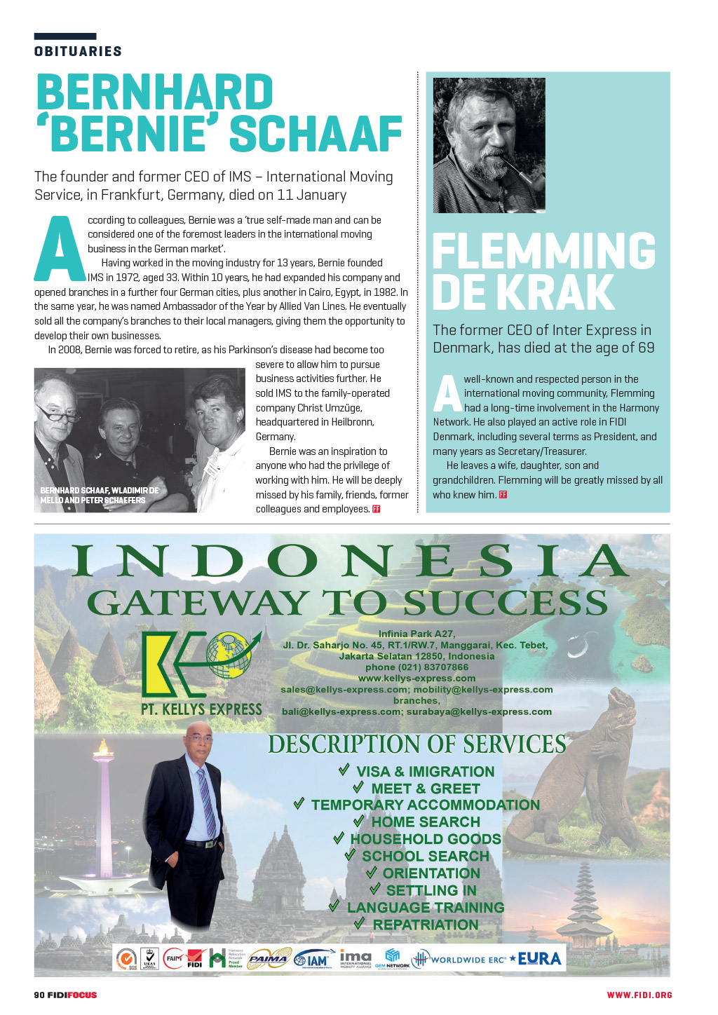 OB I T UA R I E S BERNHARD BERNIE SCHAAF The founder and former CEO of IMS International Moving Service, in Frankfurt, Germany, died on 11 January A ccording to colleagues, Bernie was a true self-made man and can be considered one of the foremost leaders in the international moving business in the German market. Having worked in the moving industry for 13 years, Bernie founded IMS in 1972, aged 33. Within 10 years, he had expanded his company and opened branches in a further four German cities, plus another in Cairo, Egypt, in 1982. In the same year, he was named Ambassador of the Year by Allied Van Lines. He eventually sold all the companys branches to their local managers, giving them the opportunity to develop their own businesses. In 2008, Bernie was forced to retire, as his Parkinsons disease had become too severe to allow him to pursue business activities further. He sold IMS to the family-operated company Christ Umzge, headquartered in Heilbronn, Germany. Bernie was an inspiration to anyone who had the privilege of working with him. He will be deeply BERNHARD SCHAAF, WLADIMIR DE missed by his family, friends, former MELLO AND PETER SCHAEFERS colleagues and employees. FLEMMING DE KRAK The former CEO of Inter Express in Denmark, has died at the age of 69 A well-known and respected person in the international moving community, Flemming had a long-time involvement in the Harmony Network. He also played an active role in FIDI Denmark, including several terms as President, and many years as Secretary/Treasurer. He leaves a wife, daughter, son and grandchildren. Flemming will be greatly missed by all who knew him. A.UNIVERS TRANSIT ltd. 90 FF296 AprMay20 pp90-91 Obituary.indd 90 WWW. F I D I . OR G 31/03/2020 09:13