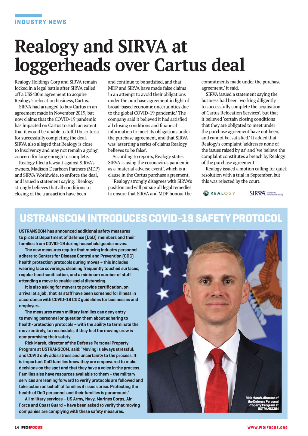IN D U ST RY N EW S Realogy and SIRVA at loggerheads over Cartus deal Realogy Holdings Corp and SIRVA remain locked in a legal battle after SIRVA called off a US$400m agreement to acquire Realogys relocation business, Cartus. SIRVA had arranged to buy Cartus in an agreement made in November 2019, but now claims that the COVID-19 pandemic has impacted on Cartus to such an extent that it would be unable to full the criteria for successfully completing the deal. SIRVA also alleged that Realogy is close to insolvency and may not remain a going concern for long enough to complete. Realogy led a lawsuit against SIRVAs owners, Madison Dearborn Partners (MDP) and SIRVA Worldwide, to enforce the deal, and issued a statement saying: Realogy strongly believes that all conditions to closing of the transaction have been and continue to be satised, and that MDP and SIRVA have made false claims in an attempt to avoid their obligations under the purchase agreement in light of broad-based economic uncertainties due to the global COVID-19 pandemic. The company said it believed it had satised all closing conditions and nancial information to meet its obligations under the purchase agreement, and that SIRVA was asserting a series of claims Realogy believes to be false. According to reports, Realogy states SIRVA is using the coronavirus pandemic as a material adverse event, which is a clause in the Cartus purchase agreement. Realogy strongly disagrees with SIRVAs position and will pursue all legal remedies to ensure that SIRVA and MDP honour the commitments made under the purchase agreement, it said. SIRVA issued a statement saying the business had been working diligently to successfully complete the acquisition of Cartus Relocation Services, but that it believed certain closing conditions that they are obligated to meet under the purchase agreement have not been, and cannot be, satised. It added that Realogys complaint addresses none of the issues raised by us and we believe the complaint constitutes a breach by Realogy of the purchase agreement. Realogy issued a motion calling for quick resolution with a trial in September, but this was rejected by the court. USTRANSCOM INTRODUCES COVID-19 SAFETY PROTOCOL USTRANSCOM has announced additional safety measures to protect Department of Defense (DoD) members and their families from COVID-19 during household goods moves. The new measures require that moving industry personnel adhere to Centers for Disease Control and Prevention (CDC) health protection protocols during moves this includes wearing face coverings, cleaning frequently touched surfaces, regular hand sanitisation, and a minimum number of staff attending a move to enable social distancing. It is also asking for movers to provide certification, on arrival at a job, that its staff have been screened for illness in accordance with COVID-19 CDC guidelines for businesses and employers. The measures mean military families can deny entry to moving personnel or question them about adhering to health-protection protocols with the ability to terminate the move entirely, to reschedule, if they feel the moving crew is compromising their safety. Rick Marsh, director of the Defense Personal Property Program at USTRANSCOM, said: Moving is always stressful, and COVID only adds stress and uncertainty to the process. It is important DoD families know they are empowered to make decisions on the spot and that they have a voice in the process. Families also have resources available to them the military services are leaning forward to verify protocols are followed and take action on behalf of families if issues arise. Protecting the health of DoD personnel and their families is paramount. All military services US Army, Navy, Marines Corps, Air Force and Coast Guard have been asked to verify that moving companies are complying with these safety measures. 14 FF297 JunJul20 pp10-17 Ind News.indd 14 Rick Marsh, director of the Defense Personal Property Program at USTRANSCOM WW W. F I D I FOC U S . OR G 02/06/2020 12:20