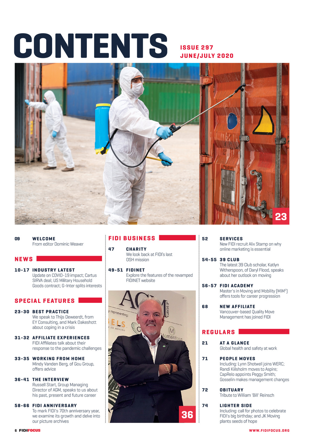 CONTENTS IS S UE 2 9 7 JUNE/JULY 2 0 2 0 23 09 W ELC O ME From editor Dominic Weaver NE W S 10-1 7 I ND U ST RY L AT E ST Update on COVID-19 impact; Cartus SIRVA deal; US Military Household Goods contract; G-Inter splits interests F I DI BUS INES S 52SE RV IC E S New FIDI recruit Alix Stamp on why online marketing is essential 47C H A R ITY We look back at FIDIs last OSH mission 49- 51 F IDIN E T Explore the features of the revamped FIDINET website S P E C I A L FE ATUR ES REGULA RS 31- 3 2 A FFI LI AT E E X P E R I E N CE S FIDI Affiliates talk about their response to the pandemic challenges 21AT A GL A N C E Global health and safety at work 33- 3 5 WO R KI NG F R O M H O M E Mindy Vanden Berg, of Gou Group, offers advice 71PE OPL E M OV E S Including: Lynn Shotwell joins WERC; Randi Kiilsholm moves to Aspire; CapRelo appoints Peggy Smith; Gosselin makes management changes 36- 4 1 T HE I NT ERV I E W Russell Start, Group Managing Director of AGM, speaks to us about his past, present and future career 6 FF297 JunJul20 pp06-07 Contents.indd 6 56-57F IDI AC A DE M Y Master s in Moving and Mobility (MiM2) offers tools for career progression 68N E W A F F IL IATE Vancouver-based Quality Move Management has joined FIDI 23- 3 0 BEST P R ACTI CE We speak to Thijs Deweerdt, from EY Consulting, and Mark Oakeshott about coping in a crisis 58-6 6 FI D I A NNIV E RSA RY To mark FIDI s 70th anniversary year, we examine its growth and delve into our picture archives 54-5539 C L UB The latest 39 Club scholar, Katlyn Witherspoon, of Daryl Flood, speaks about her outlook on moving 72OBITUA RY Tribute to William Bill Reinsch 36 74L IGH TE R SIDE Including: call for photos to celebrate FIDI s big birthday; and JK Moving plants seeds of hope WW W. F I D I FOC U S . OR G 01/06/2020 14:32