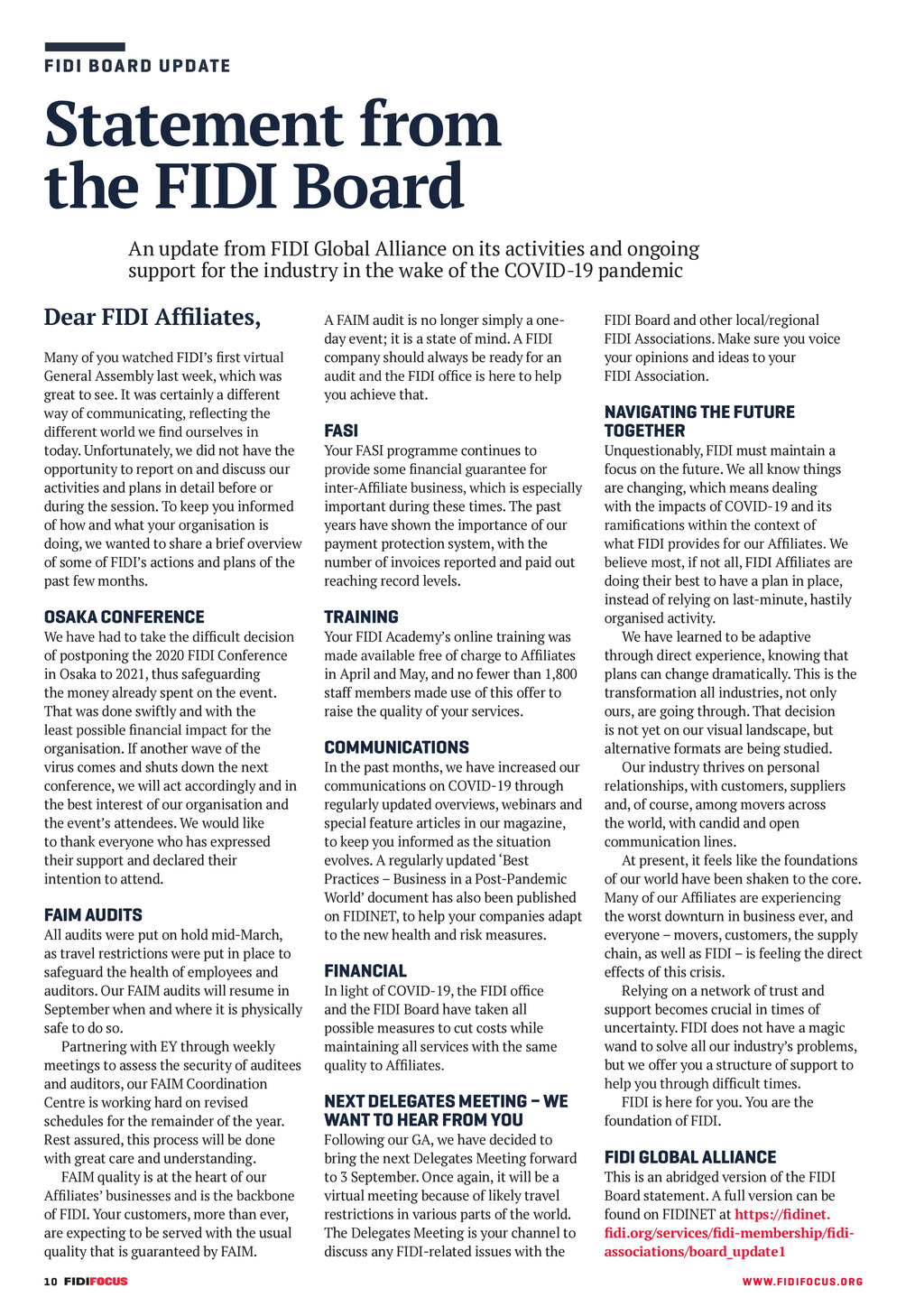 F IDI B OA RD UPDATE Statement from the FIDI Board An update from FIDI Global Alliance on its activities and ongoing support for the industry in the wake of the COVID-19 pandemic Dear FIDI Afliates, Many of you watched FIDIs rst virtual General Assembly last week, which was great to see. It was certainly a different way of communicating, reecting the different world we nd ourselves in today. Unfortunately, we did not have the opportunity to report on and discuss our activities and plans in detail before or during the session. To keep you informed of how and what your organisation is doing, we wanted to share a brief overview of some of FIDIs actions and plans of the past few months. OSAKA CONFERENCE We have had to take the difcult decision of postponing the 2020 FIDI Conference in Osaka to 2021, thus safeguarding the money already spent on the event. That was done swiftly and with the least possible nancial impact for the organisation. If another wave of the virus comes and shuts down the next conference, we will act accordingly and in the best interest of our organisation and the events attendees. We would like to thank everyone who has expressed their support and declared their intention to attend. FAIM AUDITS All audits were put on hold mid-March, as travel restrictions were put in place to safeguard the health of employees and auditors. Our FAIM audits will resume in September when and where it is physically safe to do so. Partnering with EY through weekly meetings to assess the security of auditees and auditors, our FAIM Coordination Centre is working hard on revised schedules for the remainder of the year. Rest assured, this process will be done with great care and understanding. FAIM quality is at the heart of our Afliates businesses and is the backbone of FIDI. Your customers, more than ever, are expecting to be served with the usual quality that is guaranteed by FAIM. 10 FF298 AugSept20 pp10-11 FIDI new statement page.indd 10 A FAIM audit is no longer simply a oneday event; it is a state of mind. A FIDI company should always be ready for an audit and the FIDI ofce is here to help you achieve that. FASI Your FASI programme continues to provide some nancial guarantee for inter-Afliate business, which is especially important during these times. The past years have shown the importance of our payment protection system, with the number of invoices reported and paid out reaching record levels. TRAINING Your FIDI Academys online training was made available free of charge to Afliates in April and May, and no fewer than 1,800 staff members made use of this offer to raise the quality of your services. COMMUNICATIONS In the past months, we have increased our communications on COVID-19 through regularly updated overviews, webinars and special feature articles in our magazine, to keep you informed as the situation evolves. A regularly updated Best Practices Business in a Post-Pandemic World document has also been published on FIDINET, to help your companies adapt to the new health and risk measures. FINANCIAL In light of COVID-19, the FIDI ofce and the FIDI Board have taken all possible measures to cut costs while maintaining all services with the same quality to Afliates. NEXT DELEGATES MEETING WE WANT TO HEAR FROM YOU Following our GA, we have decided to bring the next Delegates Meeting forward to 3 September. Once again, it will be a virtual meeting because of likely travel restrictions in various parts of the world. The Delegates Meeting is your channel to discuss any FIDI-related issues with the FIDI Board and other local/regional FIDI Associations. Make sure you voice your opinions and ideas to your FIDI Association. NAVIGATING THE FUTURE TOGETHER Unquestionably, FIDI must maintain a focus on the future. We all know things are changing, which means dealing with the impacts of COVID-19 and its ramications within the context of what FIDI provides for our Afliates. We believe most, if not all, FIDI Afliates are doing their best to have a plan in place, instead of relying on last-minute, hastily organised activity. We have learned to be adaptive through direct experience, knowing that plans can change dramatically. This is the transformation all industries, not only ours, are going through. That decision is not yet on our visual landscape, but alternative formats are being studied. Our industry thrives on personal relationships, with customers, suppliers and, of course, among movers across the world, with candid and open communication lines. At present, it feels like the foundations of our world have been shaken to the core. Many of our Afliates are experiencing the worst downturn in business ever, and everyone movers, customers, the supply chain, as well as FIDI is feeling the direct effects of this crisis. Relying on a network of trust and support becomes crucial in times of uncertainty. FIDI does not have a magic wand to solve all our industrys problems, but we offer you a structure of support to help you through difcult times. FIDI is here for you. You are the foundation of FIDI. FIDI GLOBAL ALLIANCE This is an abridged version of the FIDI Board statement. A full version can be found on FIDINET at https://dinet. di.org/services/di-membership/diassociations/board_update1 WWW. F I D I FOC U S . OR G 20/07/2020 15:23