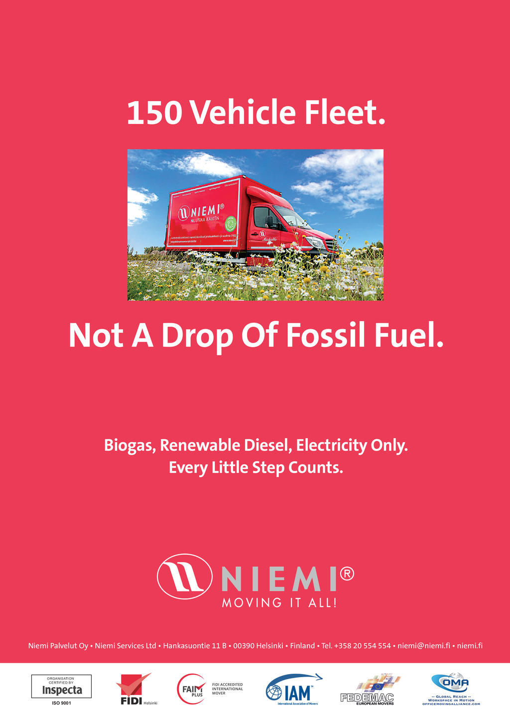 150 Vehicle Fleet. Not A Drop Of Fossil Fuel. Biogas, Renewable Diesel, Electricity Only. Every Little Step Counts. Niemi Palvelut Oy Niemi Services Ltd Hankasuontie 11 B 00390 Helsinki Finland Tel. +358 20 554 554 niemi@niemi.fi niemi.fi ORGANISATION CERTIFIED BY ISO 9001 FF298 AugSept20 pp16-19 Interview Shotwell.indd 16 Helsinki IAM TM International Association of Movers 21/07/2020 11:59