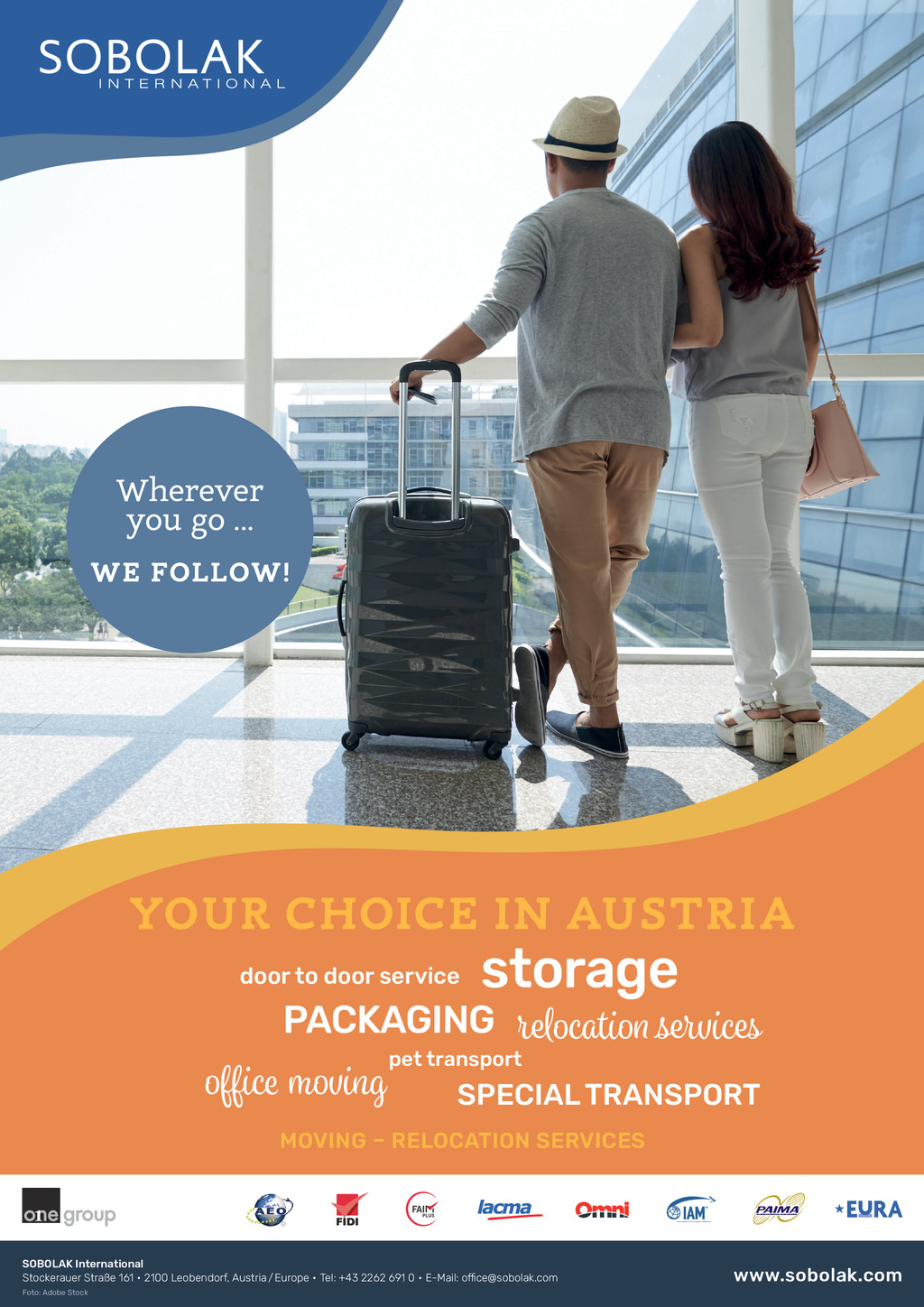 Wherever you go ... WE FOLLOW! YOUR CHOICE IN AUSTRIA door to door service storage PACKAGING relocation services office moving pet transport SPECIAL TRANSPORT MOVING RELOCATION SERVICES SOBOLAK International Stockerauer Strae 161 2100 Leobendorf, Austria / Europe Tel: +43 2262 691 0 E-Mail: office@sobolak.com www.sobolak.com Foto: Adobe Stock FF298 AugSept20 pp28-29 Glance.indd 28 20/07/2020 16:01