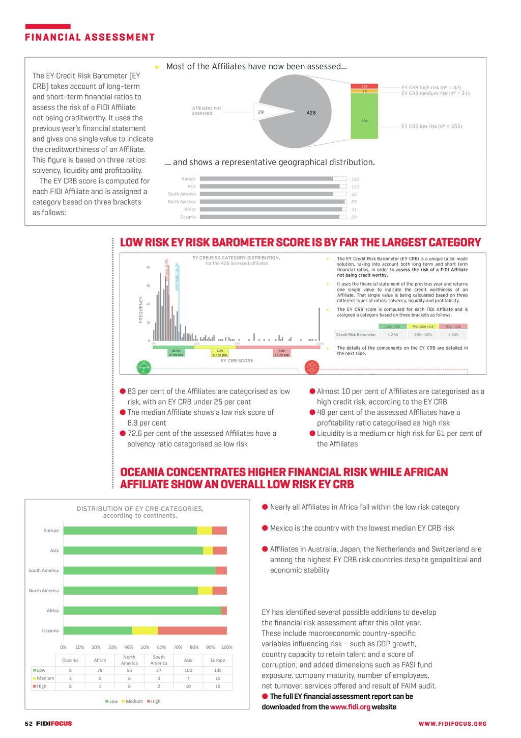F IN A N C I A L ASSESSMENTMost affiliates have shared their financial statements for assessment The EY Credit Risk Barometer (EY CRB) takes account of long-term and short-term financial ratios to assess the risk of a FIDI Affiliate not being creditworthy. It uses the previous years financial statement and gives one single value to indicate the creditworthiness of an Affiliate. This figure is based on three ratios: solvency, liquidity and profitability. The EY CRB score is computed for each FIDI Affiliate and is assigned a category based on three brackets as follows: Most of the Affiliates have now been assessed EY CRB high risk (n = 42) EY CRB medium risk (n = 31) 10% 7% Affiliates not assessed 29 428 83% EY CRB low risk (n = 355) and shows a representative geographical distribution. Europe 182 Asia 123 South America 32 North America 69 Africa 31 Oceania 20 FIDI Affiliates footprint Low risk EY Credit Risk Barometer score is by far the largest category LOW RISK EY RISK BAROMETER SCORE IS BY FAR THE LARGEST CATEGORY 40 FREQUENCY 30 EY CRB RISK CATEGORY DISTRIBUTION, for the 428 assessed affiliates AVERAGE: 18,2% MEDIAN: 8,9% Page 3 The EY Credit Risk Barometer (EY CRB) is a unique tailor made solution, taking into account both long term and short term financial ratios, in order to assess the risk of a FIDI Affiliate not being credit worthy. It uses the financial statement of the previous year and returns one single value to indicate the credit worthiness of an Affiliate. That single value is being calculated based on three different types of ratios: solvency, liquidity and profitability. The EY CRB score is computed for each FIDI Affiliate and is assigned a category based on three brackets as follows: 20 10 Credit Risk Barometer 0 0% 50% 25% 82.9% of the pop 100% 7.2% of the pop 9.8% of the pop Low risk Medium risk High risk < 25% 25% - 50% > 50% The details of the components on the EY CRB are detailed in the next slide. EY CRB SCORE 83% of the affiliates are categorized as low risk, with an EY CRB under 25%. The median Affiliate shows a low risk score of 8,9%. 72,6% of the assessed affiliates have a solvency ratio categorized as low risk (more details on the slide on ratios). 83 per cent of the Affiliates are categorised as low risk, with an EY CRB under 25 per cent The median Affiliate shows a low risk score of 8.9 per cent 72.6 per cent of the assessed Affiliates have a solvency ratio categorised as low risk Page 4 Almost 10% of the affiliates are categorized high credit risk according to the EY CRB. 48% of the assessed affiliates have a profitability ratio categorized as high risk (more details on the slide on ratios). Liquidity is a medium or high risk for 61% of the affiliates (more details on the slide on ratios). Almost 10 per cent of Affiliates are categorised as a high credit risk, according to the EY CRB 48 per cent of the assessed Affiliates have a profitability ratio categorised as high risk Liquidity is a medium or high risk for 61 per cent of the Affiliates Oceania concentrates higher financial risk while African affiliates show an overall low risk EY CRB CONCENTRATES HIGHER FINANCIAL RISK WHILE AFRICAN OCEANIA AFFILIATE SHOW AN OVERALL LOW RISK EY CRB Nearly all Affiliates in Africa fall within the low risk category DISTRIBUTION OF EY CRB CATEGORIES, according to continents. Nearly all affiliates in Africa fall within the low risk category. is the country with the lowest median EY risk CRB risk. Mexico isMexico the country with the lowest median EY CRB Europe Affiliates in Australia, Japan, the Netherlands and Switzerland are among the highest EY CRB risk countries despite geopolitical and economic stability Asia South America 50% of Australias affiliates have been assessed as high risk. Affiliates in Netherlands, Switzerland and Japan are among the highest EY CRB risk countries despite geopolitical and economic stability. EY has identifi ed several possible additions to develop North America Africa Oceania 0% 10% 20% 30% 40% Oceania Africa Low 8 29 North America 56 Medium 3 0 6 High 8 1 6 Low 50% Medium 60% South America 27 70% 80% 90% 100% Asia Europe 100 135 0 7 15 2 10 15 High the financial risk assessment after this pilot year. These include macroeconomic country-specific 1 GDP growth, variables such as LOWEST in EY uencing CRB RISKrisk COUNTRIES HIGHEST EY CRB RISK COUNTRIES1 country capacity talent and a score of(n reports) Country (n reports) to retain EY CRB Median Country EY CRB Median corruption; such Australia as FASI(12) fund Mexico (10) and added dimensions 4,3% 51,9% Brazil (6) company maturity, 5,2%number ofNew Zealand (7) 22,6% exposure, employees, Ireland (6) 5,2% Japan (9) 18,4% net turnover, services offered and result of FAIM audit. Pakistan (5) 5,8% Switzerland (12) 17,6% Spain The(8) full EY financial assessment reportNetherlands can be (22) 6,6% 15,4% downloaded from the4www.fi di.org website among countries with minimum reports available 1 52 Page 7 FF298 AugSept20 pp50-53 EY.indd 52 WW W. F I D I FOC U S . OR G 21/07/2020 11:41