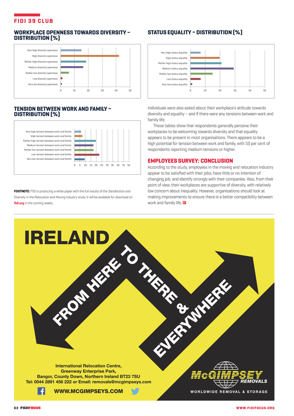 F ID I 3 9 C L U B WORKPLACE OPENNESS TOWARDS DIVERSITY DISTRIBUTION (%) Very high diversity openness STATUS EQUALITY DISTRIBUTION (%) Very high status equality High diversity openness High status equality Rather high diversity openness Rather high status equality Medium diversity openness Medium status equality Rather low diversity openness Rather low status equality Low diversity openness Low status equality Very low diversity openness Very low status equality 0 10 20 30 40 50 TENSION BETWEEN WORK AND FAMILY DISTRIBUTION (%) 0 10 20 30 40 50 Individuals were also asked about their workplaces attitude towards diversity and equality and if there were any tensions between work and family life. These tables show that respondents generally perceive their workplaces to be welcoming towards diversity and that equality appears to be present in most organisations. There appears to be a high potential for tension between work and family, with 50 per cent of respondents reporting medium tensions or higher. Very high tension between work and family High tension between work and family Rather high tension between work and family Medium tension between work and family Rather low tension between work and family Low tension between work and family Very low tension between work and family 0 5 10 15 20 25 30 35 40 45 50 FOOTNOTE: FIDI is producing a white paper with the full results of the Satisfaction and Diversity in the Relocation and Moving Industry study. it will be available for download on fidi.org in the coming weeks. 62 FF298 AugSept20 pp60-62 FIDI 39 Club.indd 62 EMPLOYEES SURVEY: CONCLUSION According to the study, employees in the moving and relocation industry appear to be satisfied with their jobs, have little or no intention of changing job, and identify strongly with their companies. Also, from their point of view, their workplaces are supportive of diversity, with relatively low concern about inequality. However, organisations should look at making improvements to ensure there is a better compatibility between work and family life. WW W. F I D I FOC U S . OR G 20/07/2020 16:32