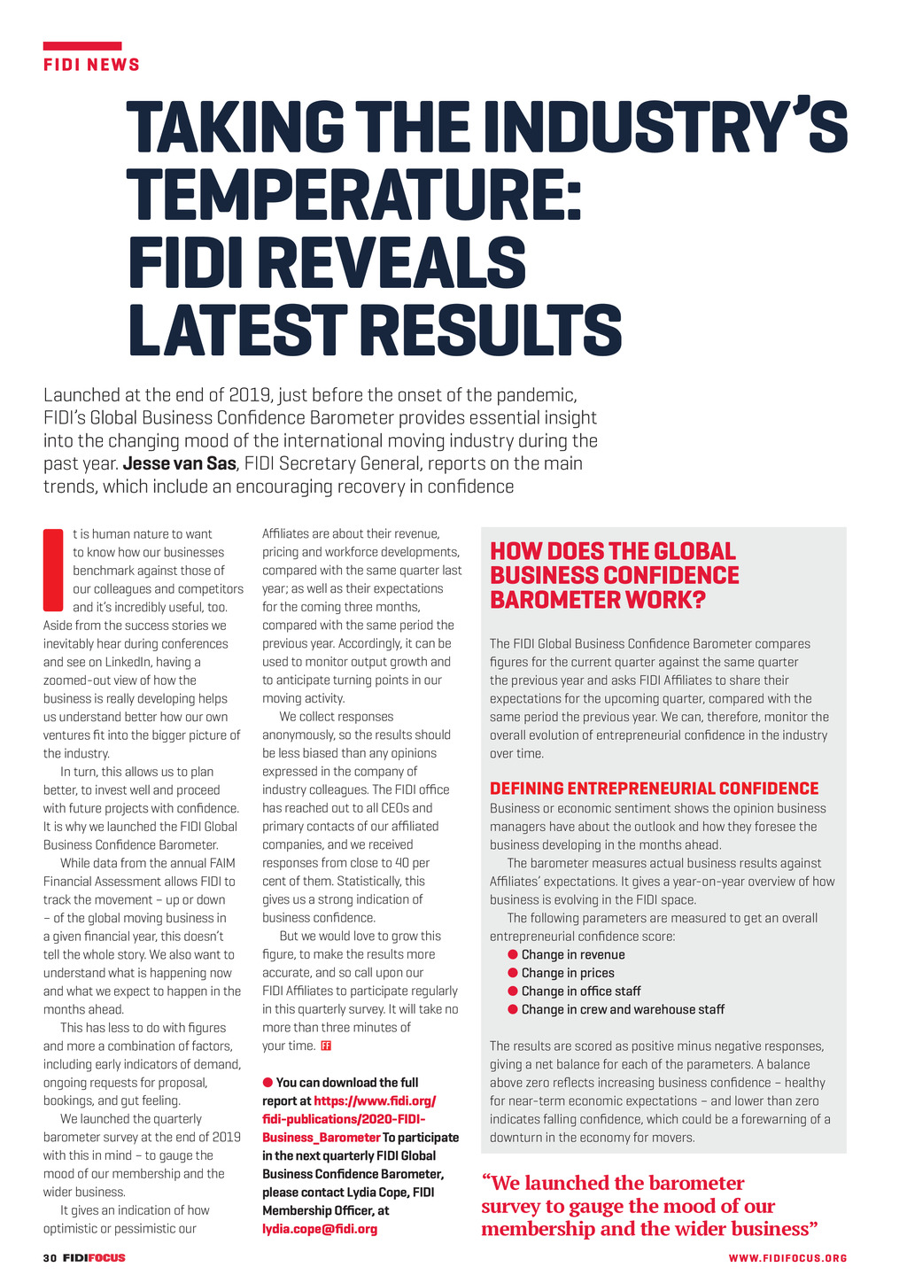 F ID I N E WS TAKING THE INDUSTRYS TEMPERATURE: FIDI REVEALS LATEST RESULTS Launched at the end of 2019, just before the onset of the pandemic, FIDIs Global Business Confidence Barometer provides essential insight into the changing mood of the international moving industry during the past year. Jesse van Sas, FIDI Secretary General, reports on the main trends, which include an encouraging recovery in confidence I t is human nature to want to know how our businesses benchmark against those of our colleagues and competitors and its incredibly useful, too. Aside from the success stories we inevitably hear during conferences and see on LinkedIn, having a zoomed-out view of how the business is really developing helps us understand better how our own ventures fit into the bigger picture of the industry. In turn, this allows us to plan better, to invest well and proceed with future projects with confidence. It is why we launched the FIDI Global Business Confidence Barometer. While data from the annual FAIM Financial Assessment allows FIDI to track the movement up or down of the global moving business in a given financial year, this doesnt tell the whole story. We also want to understand what is happening now and what we expect to happen in the months ahead. This has less to do with figures and more a combination of factors, including early indicators of demand, ongoing requests for proposal, bookings, and gut feeling. We launched the quarterly barometer survey at the end of 2019 with this in mind to gauge the mood of our membership and the wider business. It gives an indication of how optimistic or pessimistic our 30 FF301 Q2 21 pp30-31 Bus Barometer.indd 30 Affiliates are about their revenue, pricing and workforce developments, compared with the same quarter last year; as well as their expectations for the coming three months, compared with the same period the previous year. Accordingly, it can be used to monitor output growth and to anticipate turning points in our moving activity. We collect responses anonymously, so the results should be less biased than any opinions expressed in the company of industry colleagues. The FIDI office has reached out to all CEOs and primary contacts of our affiliated companies, and we received responses from close to 40 per cent of them. Statistically, this gives us a strong indication of business confidence. But we would love to grow this figure, to make the results more accurate, and so call upon our FIDI Affiliates to participate regularly in this quarterly survey. It will take no more than three minutes of your time. You can download the full report at https://www.fidi.org/ fidi-publications/2020-FIDIBusiness_Barometer To participate in the next quarterly FIDI Global Business Confidence Barometer, please contact Lydia Cope, FIDI Membership Officer, at lydia.cope@fidi.org HOW DOES THE GLOBAL BUSINESS CONFIDENCE BAROMETER WORK? The FIDI Global Business Confidence Barometer compares figures for the current quarter against the same quarter the previous year and asks FIDI Affiliates to share their expectations for the upcoming quarter, compared with the same period the previous year. We can, therefore, monitor the overall evolution of entrepreneurial confidence in the industry over time. DEFINING ENTREPRENEURIAL CONFIDENCE Business or economic sentiment shows the opinion business managers have about the outlook and how they foresee the business developing in the months ahead. The barometer measures actual business results against Affiliates expectations. It gives a year-on-year overview of how business is evolving in the FIDI space. The following parameters are measured to get an overall entrepreneurial confidence score: Change in revenue Change in prices Change in office staff Change in crew and warehouse staff The results are scored as positive minus negative responses, giving a net balance for each of the parameters. A balance above zero reflects increasing business confidence healthy for near-term economic expectations and lower than zero indicates falling confidence, which could be a forewarning of a downturn in the economy for movers. We launched the barometer survey to gauge the mood of our membership and the wider business WW W. F I D I FOC U S . OR G 09/03/2021 09:47