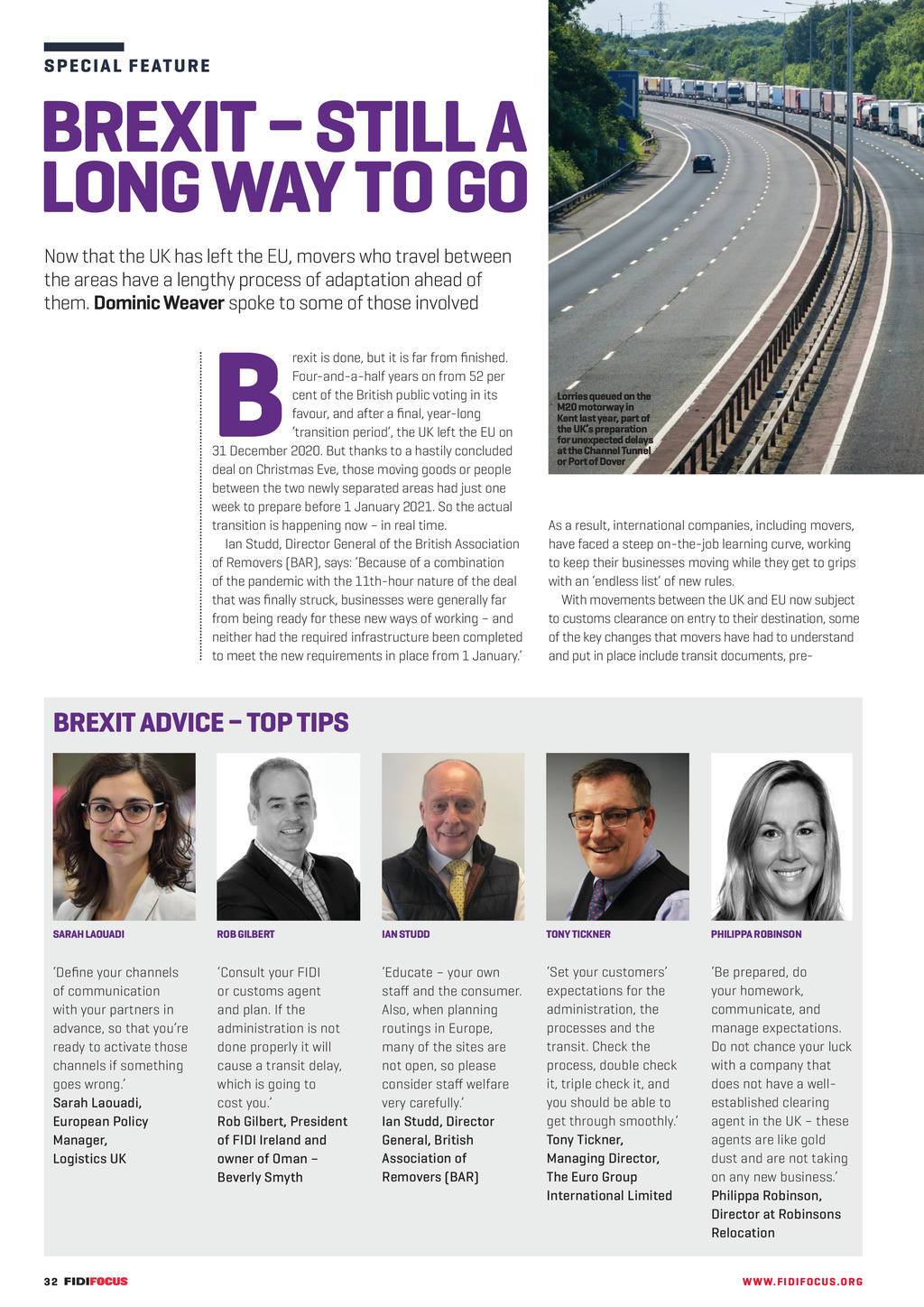 S P E C I A L F E ATURE BREXIT STILL A LONG WAY TO GO Now that the UK has left the EU, movers who travel between the areas have a lengthy process of adaptation ahead of them. Dominic Weaver spoke to some of those involved B rexit is done, but it is far from finished. Four-and-a-half years on from 52 per cent of the British public voting in its favour, and after a final, year-long transition period, the UK left the EU on 31 December 2020. But thanks to a hastily concluded deal on Christmas Eve, those moving goods or people between the two newly separated areas had just one week to prepare before 1 January 2021. So the actual transition is happening now in real time. Ian Studd, Director General of the British Association of Removers (BAR), says: Because of a combination of the pandemic with the 11th-hour nature of the deal that was finally struck, businesses were generally far from being ready for these new ways of working and neither had the required infrastructure been completed to meet the new requirements in place from 1 January. Lorries queued on the M20 motorway in Kent last year, part of the UKs preparation for unexpected delays at the Channel Tunnel or Port of Dover As a result, international companies, including movers, have faced a steep on-the-job learning curve, working to keep their businesses moving while they get to grips with an endless list of new rules. With movements between the UK and EU now subject to customs clearance on entry to their destination, some of the key changes that movers have had to understand and put in place include transit documents, pre- BREXIT ADVICE TOP TIPS SARAH LAOUADI ROB GILBERT IAN STUDD TONY TICKNER PHILIPPA ROBINSON Define your channels of communication with your partners in advance, so that youre ready to activate those channels if something goes wrong. Sarah Laouadi, European Policy Manager, Logistics UK Consult your FIDI or customs agent and plan. If the administration is not done properly it will cause a transit delay, which is going to cost you. Rob Gilbert, President of FIDI Ireland and owner of Oman Beverly Smyth Educate your own staff and the consumer. Also, when planning routings in Europe, many of the sites are not open, so please consider staff welfare very carefully. Ian Studd, Director General, British Association of Removers (BAR) Set your customers expectations for the administration, the processes and the transit. Check the process, double check it, triple check it, and you should be able to get through smoothly. Tony Tickner, Managing Director, The Euro Group International Limited Be prepared, do your homework, communicate, and manage expectations. Do not chance your luck with a company that does not have a wellestablished clearing agent in the UK these agents are like gold dust and are not taking on any new business. Philippa Robinson, Director at Robinsons Relocation 32 FF301 Q2 21 pp32-35 Feature Brexit.indd 32 WW W. F I D I FOC U S . OR G 09/03/2021 09:49
