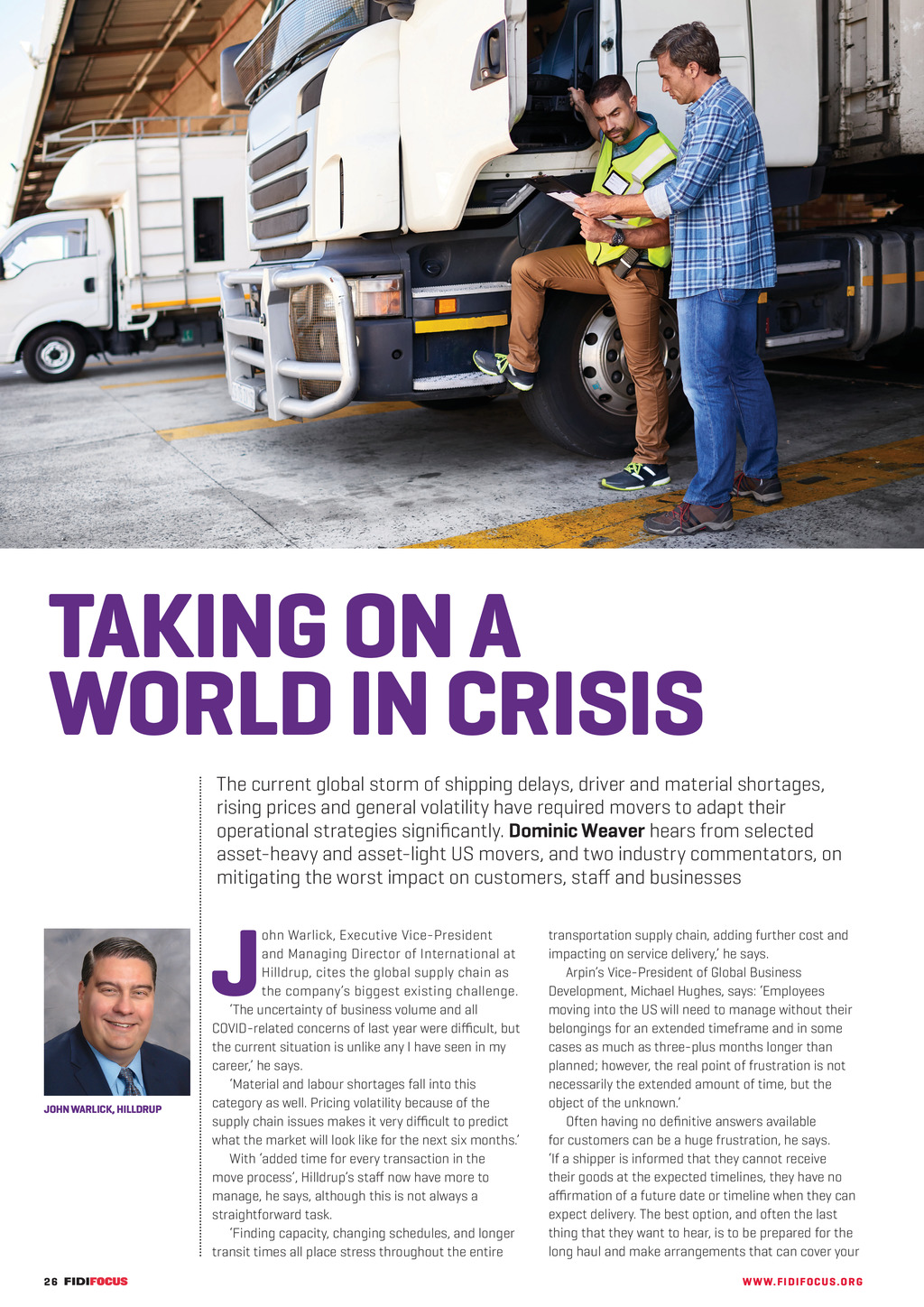TAKING ON A WORLD IN CRISIS The current global storm of shipping delays, driver and material shortages, rising prices and general volatility have required movers to adapt their operational strategies significantly. Dominic Weaver hears from selected asset-heavy and asset-light US movers, and two industry commentators, on mitigating the worst impact on customers, staff and businesses J JOHN WARLICK, HILLDRUP ohn Warlick, Executive Vice-President and Managing Director of International at Hilldrup, cites the global supply chain as the companys biggest existing challenge. The uncertainty of business volume and all COVID-related concerns of last year were difficult, but the current situation is unlike any I have seen in my career, he says. Material and labour shortages fall into this category as well. Pricing volatility because of the supply chain issues makes it very difficult to predict what the market will look like for the next six months. With added time for every transaction in the move process, Hilldrups staff now have more to manage, he says, although this is not always a straightforward task. Finding capacity, changing schedules, and longer transit times all place stress throughout the entire 26 FF304 Dec_Jan 22 pp26-33 Special feature_Crises 2.indd 26 transportation supply chain, adding further cost and impacting on service delivery, he says. Arpins Vice-President of Global Business Development, Michael Hughes, says: Employees moving into the US will need to manage without their belongings for an extended timeframe and in some cases as much as three-plus months longer than planned; however, the real point of frustration is not necessarily the extended amount of time, but the object of the unknown. Often having no definitive answers available for customers can be a huge frustration, he says. If a shipper is informed that they cannot receive their goods at the expected timelines, they have no affirmation of a future date or timeline when they can expect delivery. The best option, and often the last thing that they want to hear, is to be prepared for the long haul and make arrangements that can cover your WW W. F I D I FOC U S . OR G 07/12/2021 16:38