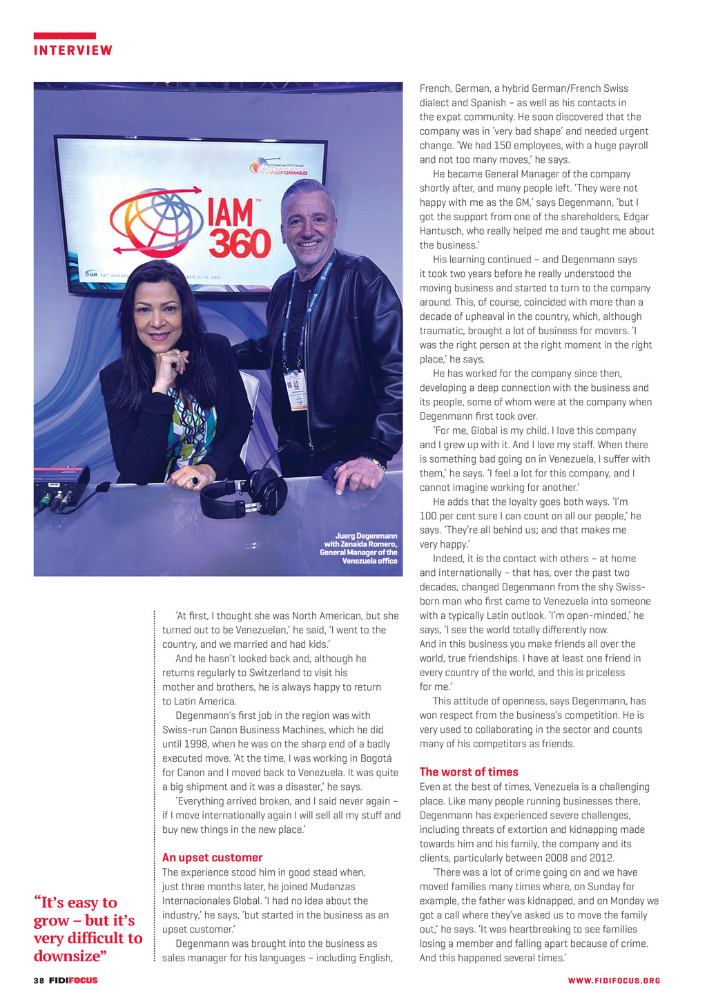 IN T E RV I E W Juerg Degenmann with Zenaida Romero, General Manager of the Venezuela office At first, I thought she was North American, but she turned out to be Venezuelan, he said, I went to the country, and we married and had kids. And he hasnt looked back and, although he returns regularly to Switzerland to visit his mother and brothers, he is always happy to return to Latin America. Degenmanns first job in the region was with Swiss-run Canon Business Machines, which he did until 1998, when he was on the sharp end of a badly executed move. At the time, I was working in Bogot for Canon and I moved back to Venezuela. It was quite a big shipment and it was a disaster, he says. Everything arrived broken, and I said never again if I move internationally again I will sell all my stuff and buy new things in the new place. An upset customer Its easy to grow but its very difficult to downsize 38 FF304 Dec_Jan 22 pp36-39 Interview.indd 38 The experience stood him in good stead when, just three months later, he joined Mudanzas Internacionales Global. I had no idea about the industry, he says, but started in the business as an upset customer. Degenmann was brought into the business as sales manager for his languages including English, French, German, a hybrid German/French Swiss dialect and Spanish as well as his contacts in the expat community. He soon discovered that the company was in very bad shape and needed urgent change. We had 150 employees, with a huge payroll and not too many moves, he says. He became General Manager of the company shortly after, and many people left. They were not happy with me as the GM, says Degenmann, but I got the support from one of the shareholders, Edgar Hantusch, who really helped me and taught me about the business. His learning continued and Degenmann says it took two years before he really understood the moving business and started to turn to the company around. This, of course, coincided with more than a decade of upheaval in the country, which, although traumatic, brought a lot of business for movers. I was the right person at the right moment in the right place, he says. He has worked for the company since then, developing a deep connection with the business and its people, some of whom were at the company when Degenmann first took over. For me, Global is my child. I love this company and I grew up with it. And I love my staff. When there is something bad going on in Venezuela, I suffer with them, he says. I feel a lot for this company, and I cannot imagine working for another. He adds that the loyalty goes both ways. Im 100 per cent sure I can count on all our people, he says. Theyre all behind us; and that makes me very happy. Indeed, it is the contact with others at home and internationally that has, over the past two decades, changed Degenmann from the shy Swissborn man who first came to Venezuela into someone with a typically Latin outlook. Im open-minded, he says, I see the world totally differently now. And in this business you make friends all over the world, true friendships. I have at least one friend in every country of the world, and this is priceless for me. This attitude of openness, says Degenmann, has won respect from the businesss competition. He is very used to collaborating in the sector and counts many of his competitors as friends. The worst of times Even at the best of times, Venezuela is a challenging place. Like many people running businesses there, Degenmann has experienced severe challenges, including threats of extortion and kidnapping made towards him and his family, the company and its clients, particularly between 2008 and 2012. There was a lot of crime going on and we have moved families many times where, on Sunday for example, the father was kidnapped, and on Monday we got a call where theyve asked us to move the family out, he says. It was heartbreaking to see families losing a member and falling apart because of crime. And this happened several times. WW W. F I D I FOC U S . OR G 07/12/2021 09:55