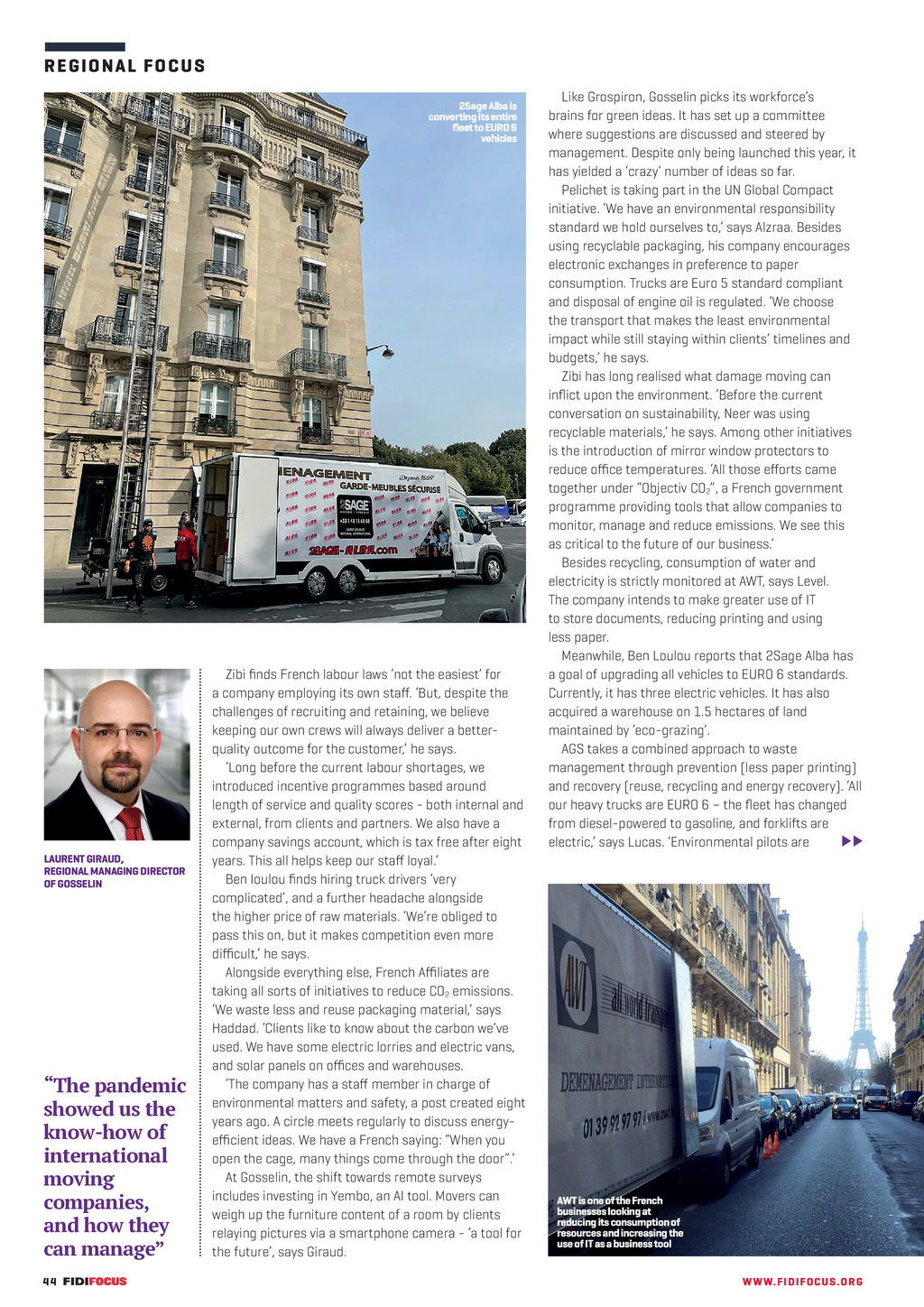 R E G I O N A L FOCUS 2Sage Alba is converting its entire fleet to EURO 6 vehicles LAURENT GIRAUD, REGIONAL MANAGING DIRECTOR OF GOSSELIN The pandemic showed us the know-how of international moving companies, and how they can manage Zibi finds French labour laws not the easiest for a company employing its own staff. But, despite the challenges of recruiting and retaining, we believe keeping our own crews will always deliver a betterquality outcome for the customer, he says. Long before the current labour shortages, we introduced incentive programmes based around length of service and quality scores - both internal and external, from clients and partners. We also have a company savings account, which is tax free after eight years. This all helps keep our staff loyal. Ben Ioulou finds hiring truck drivers very complicated, and a further headache alongside the higher price of raw materials. Were obliged to pass this on, but it makes competition even more difficult, he says. Alongside everything else, French Affiliates are taking all sorts of initiatives to reduce CO2 emissions. We waste less and reuse packaging material, says Haddad. Clients like to know about the carbon weve used. We have some electric lorries and electric vans, and solar panels on offices and warehouses. The company has a staff member in charge of environmental matters and safety, a post created eight years ago. A circle meets regularly to discuss energyefficient ideas. We have a French saying: When you open the cage, many things come through the door. At Gosselin, the shift towards remote surveys includes investing in Yembo, an AI tool. Movers can weigh up the furniture content of a room by clients relaying pictures via a smartphone camera - a tool for the future, says Giraud. 44 FF304 Dec_Jan 22 pp40-49 Regional Focus France.indd 44 Like Grospiron, Gosselin picks its workforces brains for green ideas. It has set up a committee where suggestions are discussed and steered by management. Despite only being launched this year, it has yielded a crazy number of ideas so far. Pelichet is taking part in the UN Global Compact initiative. We have an environmental responsibility standard we hold ourselves to, says Alzraa. Besides using recyclable packaging, his company encourages electronic exchanges in preference to paper consumption. Trucks are Euro 5 standard compliant and disposal of engine oil is regulated. We choose the transport that makes the least environmental impact while still staying within clients timelines and budgets, he says. Zibi has long realised what damage moving can inflict upon the environment. Before the current conversation on sustainability, Neer was using recyclable materials, he says. Among other initiatives is the introduction of mirror window protectors to reduce office temperatures. All those efforts came together under Objectiv CO2, a French government programme providing tools that allow companies to monitor, manage and reduce emissions. We see this as critical to the future of our business. Besides recycling, consumption of water and electricity is strictly monitored at AWT, says Level. The company intends to make greater use of IT to store documents, reducing printing and using less paper. Meanwhile, Ben Loulou reports that 2Sage Alba has a goal of upgrading all vehicles to EURO 6 standards. Currently, it has three electric vehicles. It has also acquired a warehouse on 1.5 hectares of land maintained by eco-grazing. AGS takes a combined approach to waste management through prevention (less paper printing) and recovery (reuse, recycling and energy recovery). All our heavy trucks are EURO 6 the fleet has changed from diesel-powered to gasoline, and forklifts are electric, says Lucas. Environmental pilots are AWT is one of the French businesses looking at reducing its consumption of resources and increasing the use of IT as a business tool WW W. F I D I FOC U S . OR G 07/12/2021 16:41