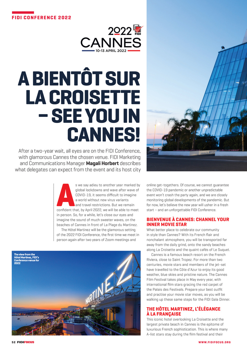 F ID I C O N FE R ENCE 2022 Page 2 A BIENTT SUR LA CROISETTE SEE YOU IN CANNES! FIDI / Cannes Conference Assets / P5975 After a two-year wait, all eyes are on the FIDI Conference, with glamorous Cannes the chosen venue. FIDI Marketing and Communications Manager Magali Horbert describes what delegates can expect from the event and its host city A s we say adieu to another year marked by global lockdowns and wave after wave of COVID-19, it seems difficult to imagine a world without new virus variants and travel restrictions. But we remain confident that, by April 2022, we will be able to meet in person. So, for a while, lets close our eyes and imagine the sound of much sweeter waves, on the beaches of Cannes in front of La Plage du Martinez. The Htel Martinez will be the glamorous setting of the 2022 FIDI Conference, the first time we meet in person again after two years of Zoom meetings and The view from the Htel Martinez, FIDIs Conference venue for 2022 online get-togethers. Of course, we cannot guarantee the COVID-19 pandemic or another unpredictable event wont crash the party again, and we are closely monitoring global developments of the pandemic. But for now, lets believe the new year will usher in a fresh start and an unforgettable FIDI Conference. BIENVENUE CANNES: CHANNEL YOUR INNER MOVIE STAR What better place to celebrate our community in style than Cannes? With its French flair and nonchalant atmosphere, you will be transported far away from the daily grind, onto the sandy beaches along La Croisette and the quaint cafs of Le Suquet. Cannes is a famous beach resort on the French Riviera, close to Saint Tropez. For more than two centuries, movie stars and members of the jet-set have travelled to the Cte dAzur to enjoy its good weather, blue skies and pristine nature. The Cannes Film Festival takes place in May every year, with international film stars gracing the red carpet of the Palais des Festivals. Prepare your best outfit and practise your movie star moves, as you will be walking up these same steps for the FIDI Gala Dinner. THE HTEL MARTINEZ, LLGANCE LA FRANAISE This iconic hotel overlooking La Croisette and the largest private beach in Cannes is the epitome of luxurious French sophistication. This is where many A-list stars stay during the film festival and their 52 FF304 Dec_Jan 22 pp52-55 FIDI conference.indd 52 WW W. F I D I FOC U S . OR G 07/12/2021 16:06